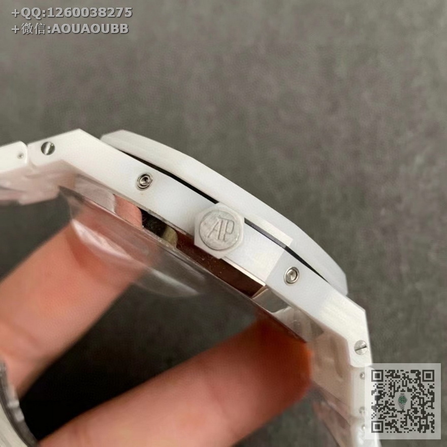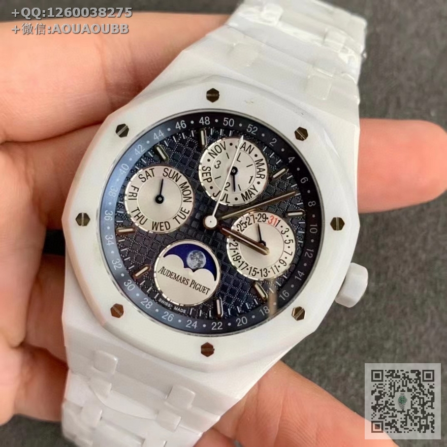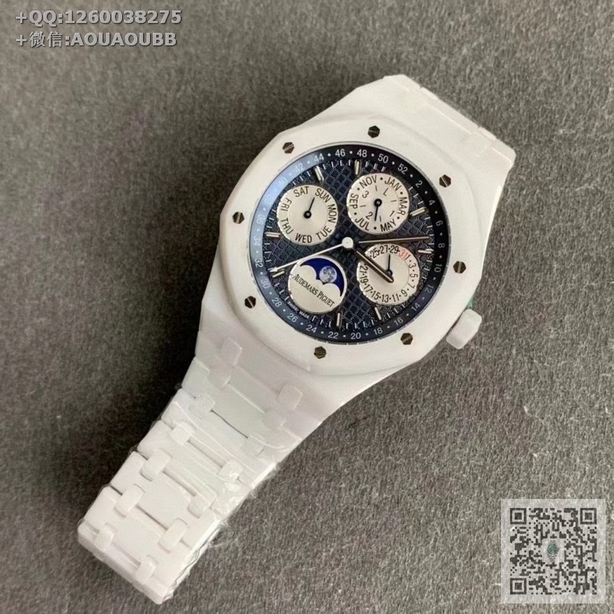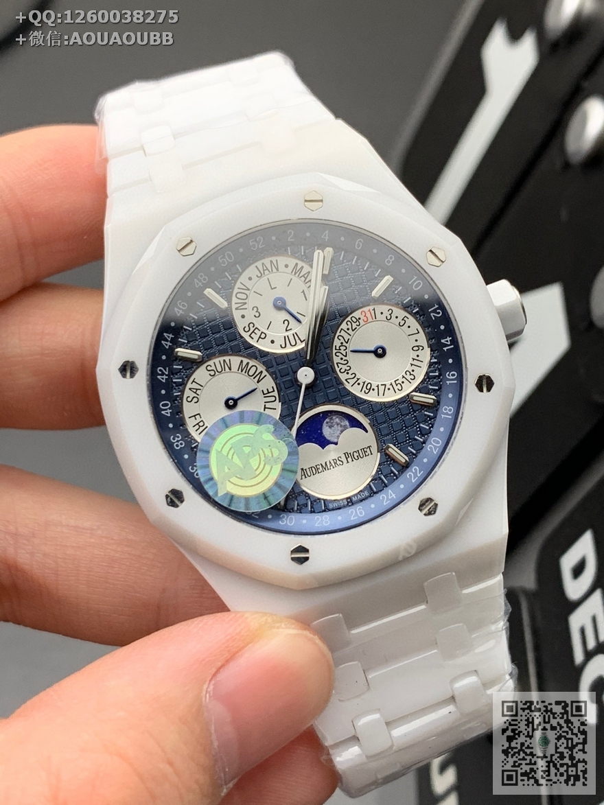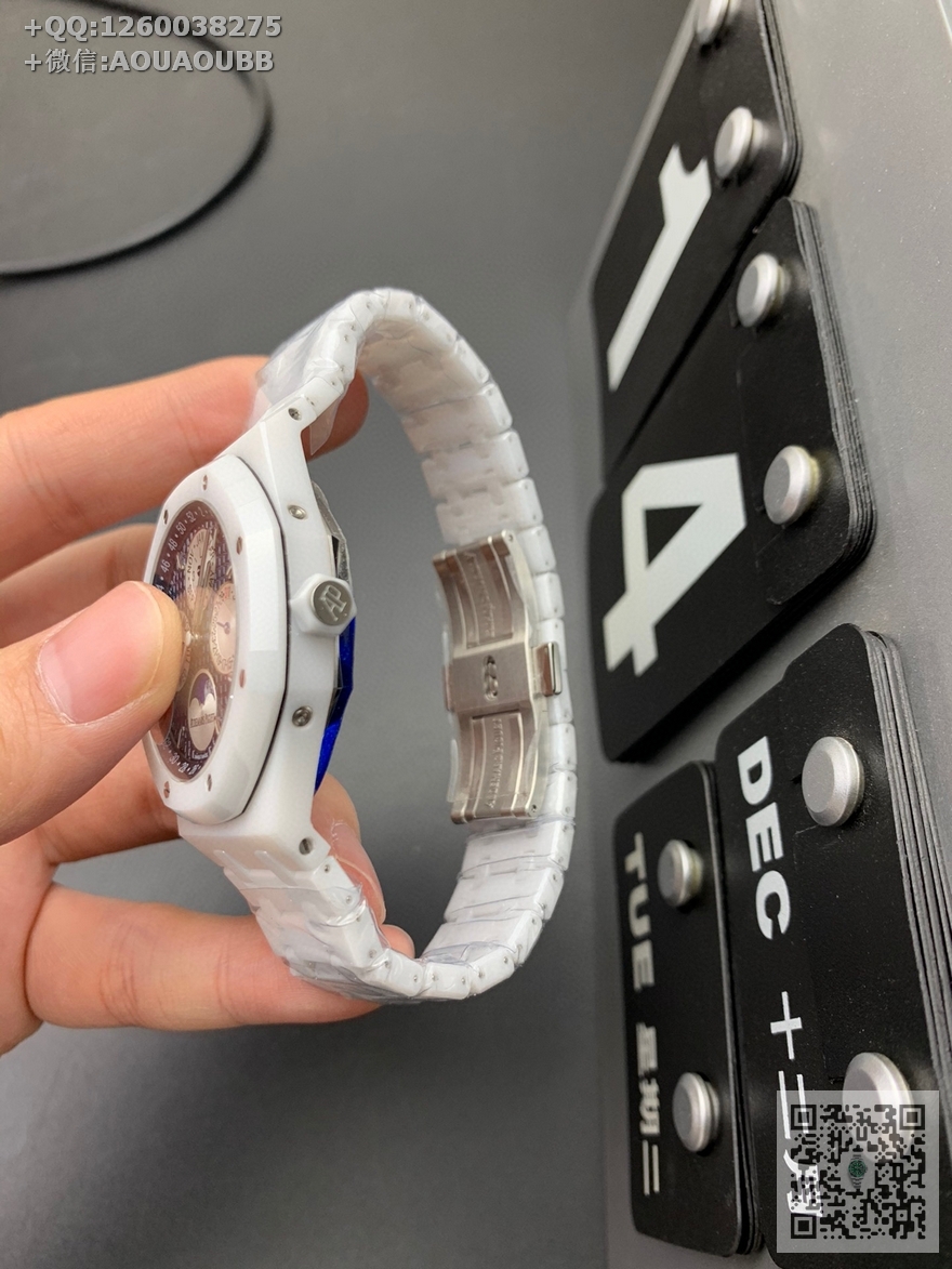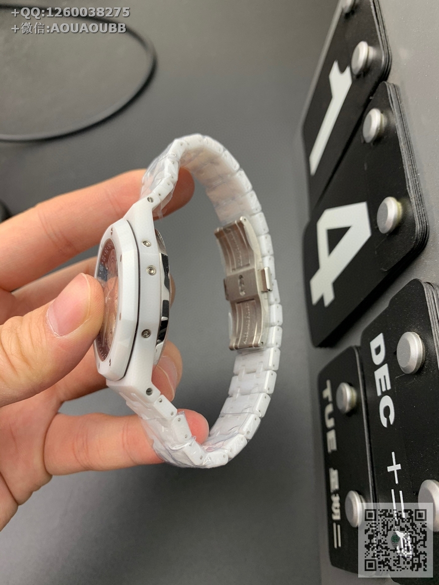 【产品介绍】APS新品 白陶瓷 皇家橡树系列在“Grande Tapisserie”大格纹装饰表盘上,日期、星期、月份、月相,和四个眼睛的位置与原装同步,(区别普通版本四个眼镜紧缩在一起)并以真实的月球图像显示天文精确月相,形成鲜明对比,直径41mm,复刻一体机5134自动上链机芯,厚度10.5mm(区别市面普通版本14mm )所有功能真实可用,更薄 更像 !