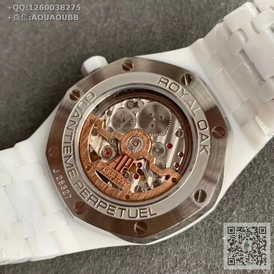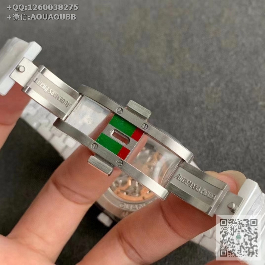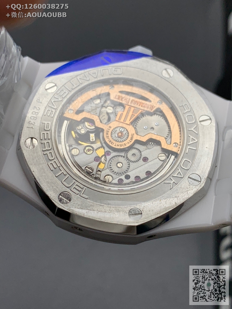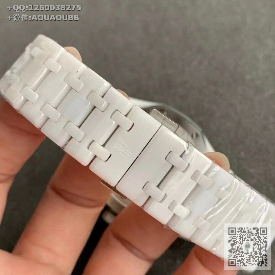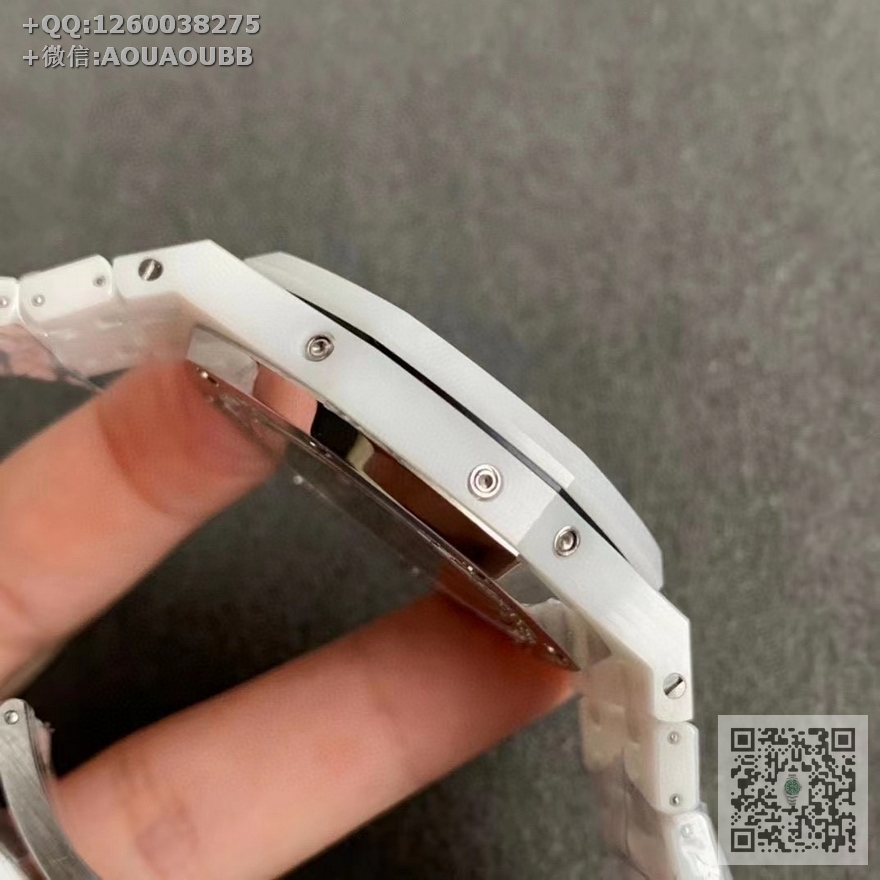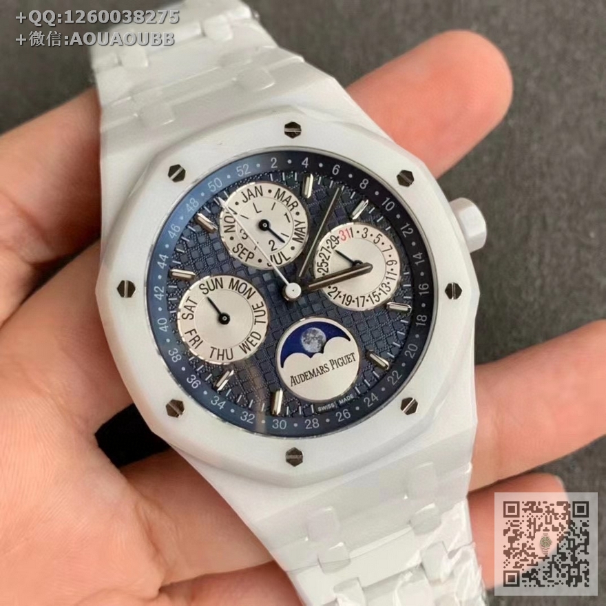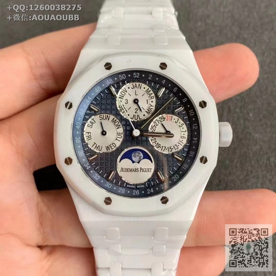 【产品介绍】APS新品 白陶瓷 皇家橡树系列在“Grande Tapisserie”大格纹装饰表盘上,日期、星期、月份、月相,和四个眼睛的位置与原装同步,(区别普通版本四个眼镜紧缩在一起)并以真实的月球图像显示天文精确月相,形成鲜明对比,直径41mm,复刻一体机5134自动上链机芯,厚度10.5mm(区别市面普通版本14mm )所有功能真实可用,更薄 更像 !