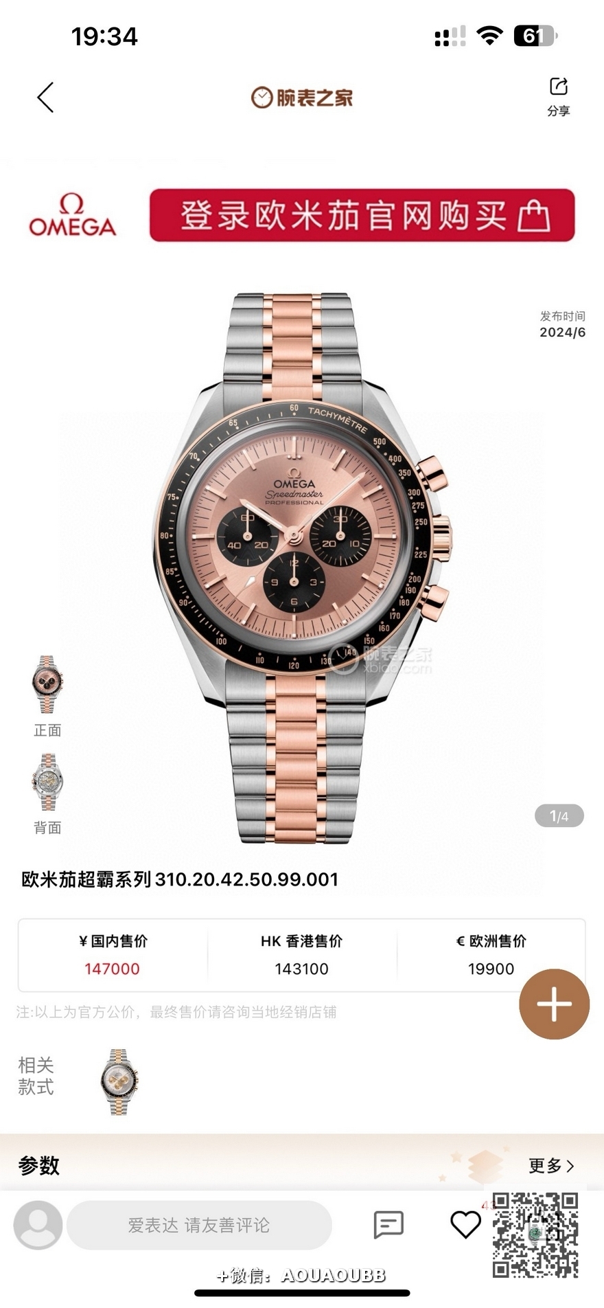 【品牌】欧米茄【产品介绍】欧米茄 OMEGA 超霸系列3861月球表 间金款 310.20.42.50.02.001 42毫米的表壳直径搭配太阳射线打磨效果的阶梯式表盘,设有经黑化处理的小表盘和小时刻度,呈现出别具一格的视觉冲击力,黑色陶瓷表圈饰以由OMEGA Ceragold技术制成的测速刻度, 并设有早期超霸表款标志性的“Dot over 90” 标记。内部搭载的3861至臻天文台机芯,高精准度和防磁能力,还拥有令人赞叹的机芯打磨工艺, 奢华与精准的结合其独特的设计和卓越的性能,成为钟表收藏家与太空迷们梦寐以求的时计。【款式】男款【尺寸】直径42mm【表带】精钢表带【镜面】蓝宝石镜面【机芯】3861机芯【防水】50米【配件】原装盒,说明书,质保卡,吊牌,香港机打发票【品质检测】保证所有手表实物拍摄,所见即所得 , 手表发货前都会有严格检查测试,确保您收到的手表无质量问题