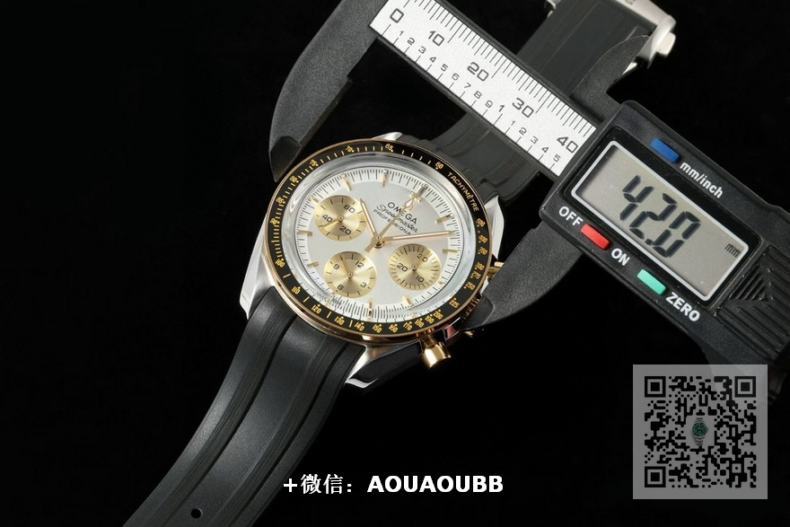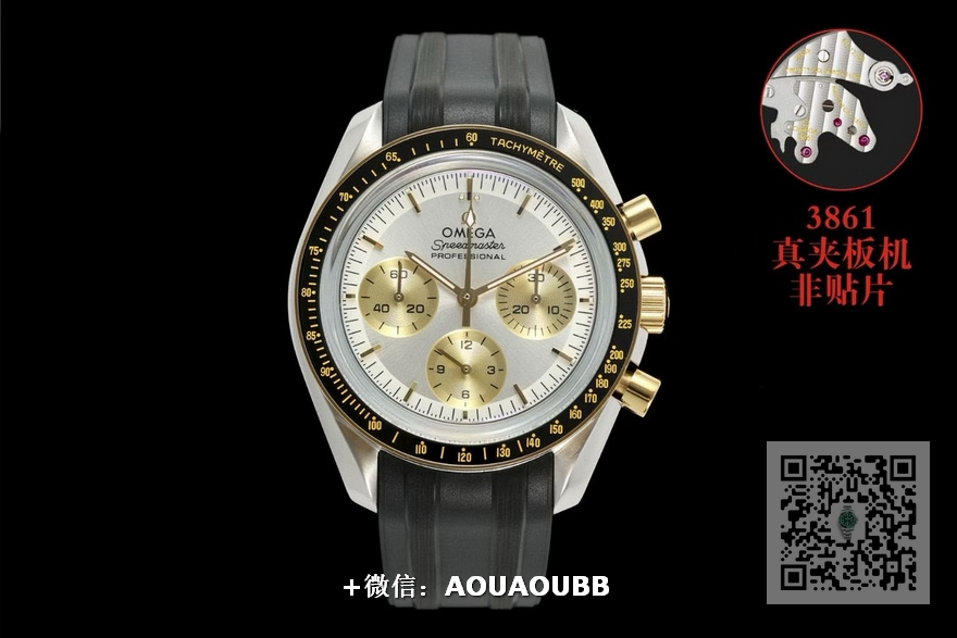 【品牌】欧米茄【产品介绍】欧米茄 OMEGA 超霸系列3861月球表 间金款 310.20.42.50.02.001 42毫米的表壳直径搭配太阳射线打磨效果的阶梯式表盘,设有经黑化处理的小表盘和小时刻度,呈现出别具一格的视觉冲击力,黑色陶瓷表圈饰以由OMEGA Ceragold技术制成的测速刻度, 并设有早期超霸表款标志性的“Dot over 90” 标记。内部搭载的3861至臻天文台机芯,高精准度和防磁能力,还拥有令人赞叹的机芯打磨工艺, 奢华与精准的结合其独特的设计和卓越的性能,成为钟表收藏家与太空迷们梦寐以求的时计。【款式】男款【尺寸】直径42mm【表带】橡胶表带【镜面】蓝宝石镜面【机芯】3861机芯【防水】50米【配件】原装盒,说明书,质保卡,吊牌,香港机打发票【品质检测】保证所有手表实物拍摄,所见即所得 , 手表发货前都会有严格检查测试,确保您收到的手表无质量问题