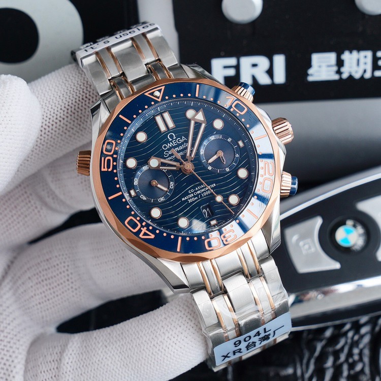2: 搭载复刻欧米茄9900计时机芯,同正品黑色摆轮,904精钢表壳44毫米 ,天然进口橡胶表带,表带可与原版互换