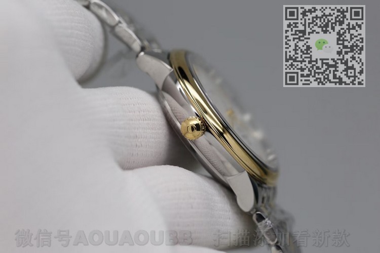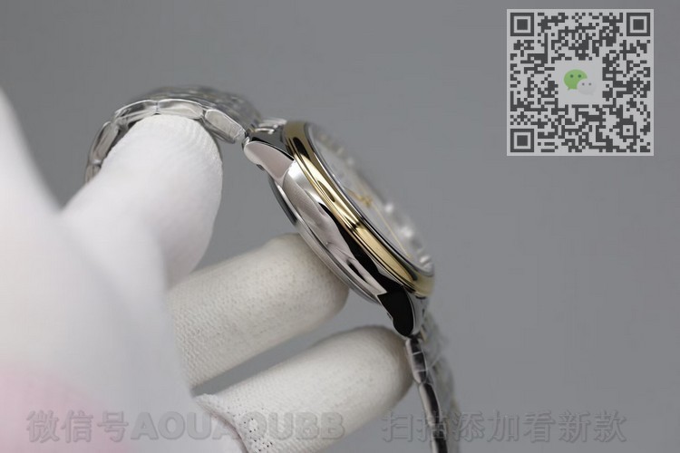 尺寸39.5毫米,厚度10毫米,是超薄的自动腕表,适合广大人群,上手很舒服。表壳分别采用精钢、精钢和黄金色,以及精钢和红金色三种材质打造。表盘均饰有全新“叶形”时针和分针,6点位设有日历窗,日历盘以原装日历1到31个数字一一取样印刷,采用全新印刷工艺,数字整齐不掉漆。腕表表背浮雕有典雅腕表标志性的时间之神Chronos图案,每支表后盖都是不同的编号,独立编码!同专柜一致。