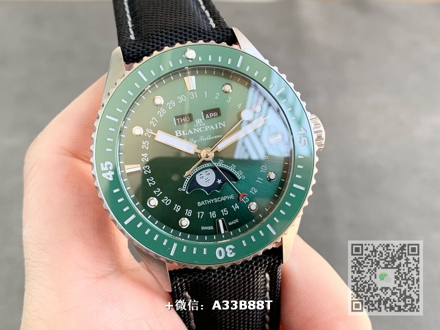 【品牌】宝珀【产品介绍】TW厂手表力作宝铂五十寻系列,5054-1110-B52A。压轴巨献,大三针夜光设计,直径43毫米,厚度13.3毫米!搭载6654.P自动机械机芯,具备星期显示,日期显示。月份显示,年份显示,月相显示,壳身轮廓分明,线条清晰决绝。优雅、律动之下隐藏着刚毅成熟的美。满足运动,商务,多功能性佩戴。定让君能依芯所向!TW诚意之作值得你拥有!【尺寸】43mmX13.3mm【表带】尼龙纤维表带,内侧牛皮【镜面】蓝宝石镜面【机芯】cal.6654机芯【防水】50米【配件】原装盒,说明书,质保卡,吊牌,香港机打发票【品质检测】保证所有手表实物拍摄,所见即所得 , 手表发货前都会有严格检查测试,确保您收到的手表无质量问题