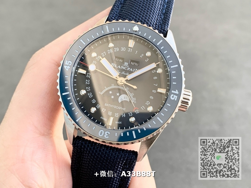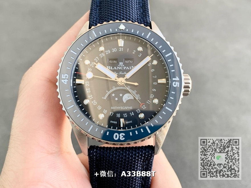 【品牌】宝珀【产品介绍】TW厂手表力作宝铂五十寻系列,5054-1110-B52A。压轴巨献,大三针夜光设计,直径43毫米,厚度13.3毫米!搭载6654.P自动机械机芯,具备星期显示,日期显示。月份显示,年份显示,月相显示,壳身轮廓分明,线条清晰决绝。优雅、律动之下隐藏着刚毅成熟的美。满足运动,商务,多功能性佩戴。定让君能依芯所向!TW诚意之作值得你拥有!【尺寸】43mmX13.3mm【表带】尼龙纤维表带,内侧牛皮【镜面】蓝宝石镜面【机芯】cal.6654机芯【防水】50米【配件】原装盒,说明书,质保卡,吊牌,香港机打发票【品质检测】保证所有手表实物拍摄,所见即所得 , 手表发货前都会有严格检查测试,确保您收到的手表无质量问题