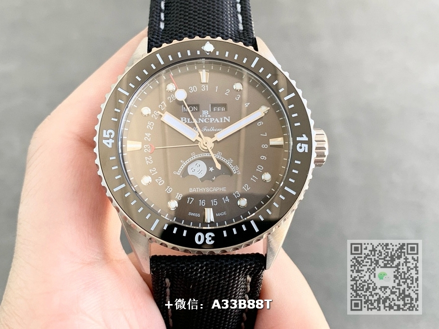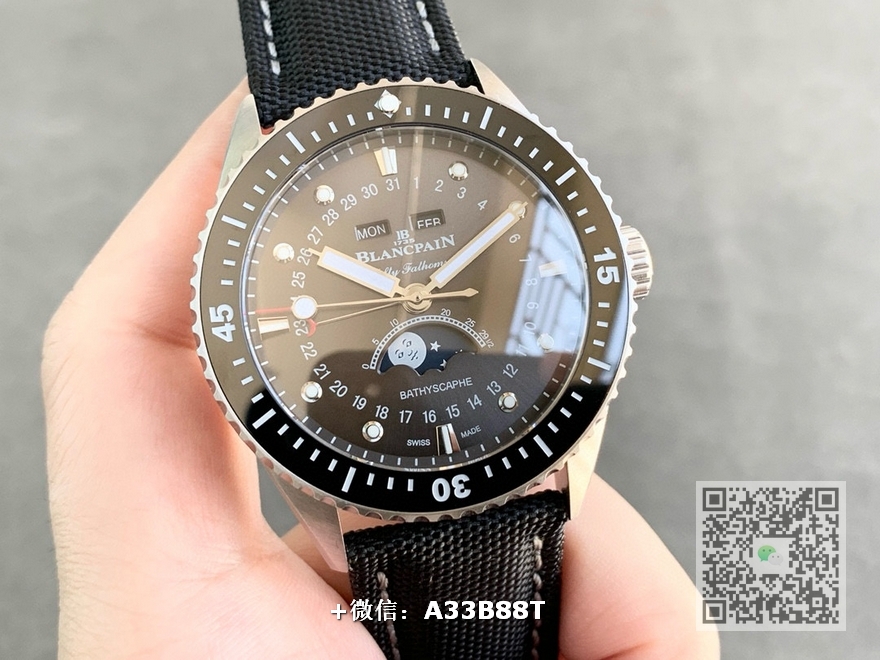 【品牌】宝珀【产品介绍】TW厂手表力作宝铂五十寻系列,5054-1110-B52A。压轴巨献,大三针夜光设计,直径43毫米,厚度13.3毫米!搭载6654.P自动机械机芯,具备星期显示,日期显示。月份显示,年份显示,月相显示,壳身轮廓分明,线条清晰决绝。优雅、律动之下隐藏着刚毅成熟的美。满足运动,商务,多功能性佩戴。定让君能依芯所向!TW诚意之作值得你拥有!【尺寸】43mmX13.3mm【表带】尼龙纤维表带,内侧牛皮【镜面】蓝宝石镜面【机芯】cal.6654机芯【防水】50米【配件】原装盒,说明书,质保卡,吊牌,香港机打发票【品质检测】保证所有手表实物拍摄,所见即所得 , 手表发货前都会有严格检查测试,确保您收到的手表无质量问题