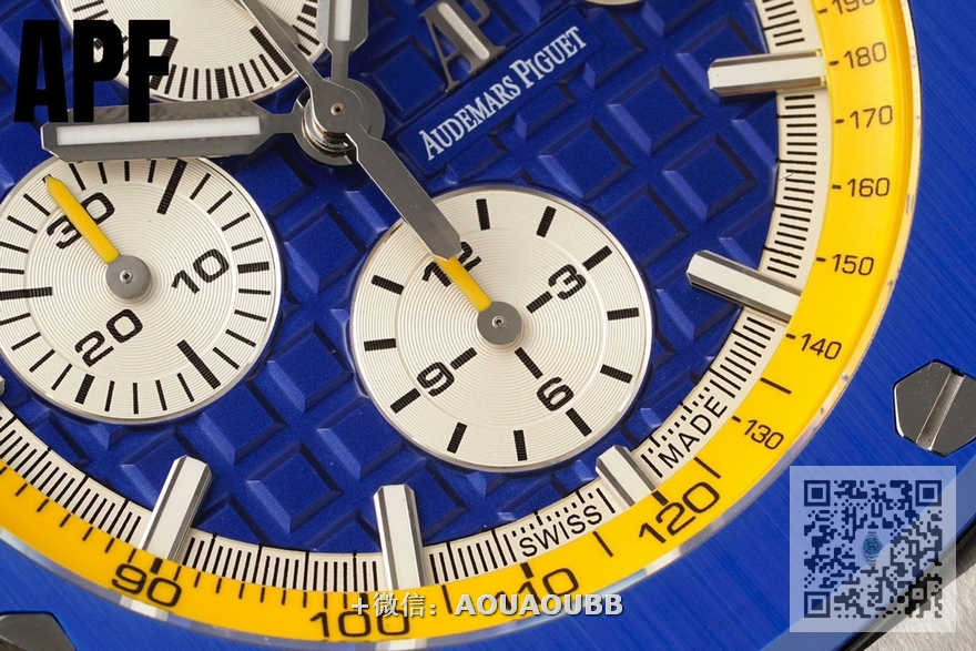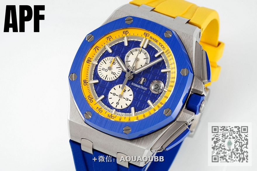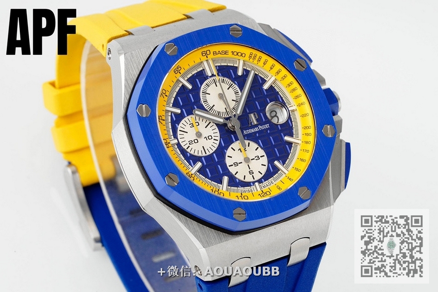 【产品介绍】APF全新升级“夏日爆款”爱彼皇家橡树离岸型26470系列42Mm腕表 秒杀市面上所有版本“封顶之作 杜绝一眼假”在原有的基础上 潜心研发 突破壁垒 “打破原装封锁技术,同步原装独家计时码表款可松动头粒”使上手最大程度贴合手腕,大大提高了佩戴的舒适 同时也杜绝一眼假的尴尬处境。APF厂真正做到从每一个喜欢手的表友角度考虑 1. 表壳与圈口的选料,使用进口的氧化锆,无需任何颜料,以超高的压力与超高的温度锻造,形成超高密度的彩色陶瓷 2.采用最新CNC级别的打磨技术,将整个表壳的个个角度完美处理,3.每颗六角螺丝都与表框处于同一平面上,不接受一丝一毫的凸显与凹陷,真正诠释了何为顶级复刻艺术 4.表盘以爱彼经典的大格纹为背景,层次分明的方格排列,经过完美打磨,将匠人的工艺体现的淋漓尽致 5.镜面采用双面蓝宝石镜片,天然橡胶皮带,6.机芯采用原装3126的计时机芯,十二位的小秒,6点钟位和九点位的12小时计时与30分钟计时,完美的还原了原版的所有功能,每块手表APF厂都经过人工QC确保机芯的稳定性,真正做到无可挑剔欢迎各位 表友鉴赏