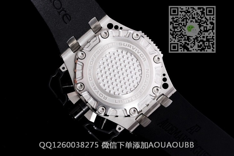 【产品介绍】爱彼皇家橡树离岸型Survivor限量版,全球限量1000只,上市就被秒杀抢购一空。戴上它,就是正品!自动上链计时机芯,316精钢鑫表壳,蓝宝石水晶玻璃镜面,锥形按钮、中空的按钮保护栓、表冠及连结表带的炼节皆以精钢制作。44mm表径,镂空的表圈,黑色雾面表盘具有爱彼独家“Méga Tapisserie”超大型格纹装饰。江湖人称“战争幸存者”或“大闸蟹”表壳整体全部CNC处理,完美还原原装结构,表带为氟橡胶材质,柔软度与原装吻合,彰显男人霸气,战争幸存者带你披荆斩铁!所向披靡!