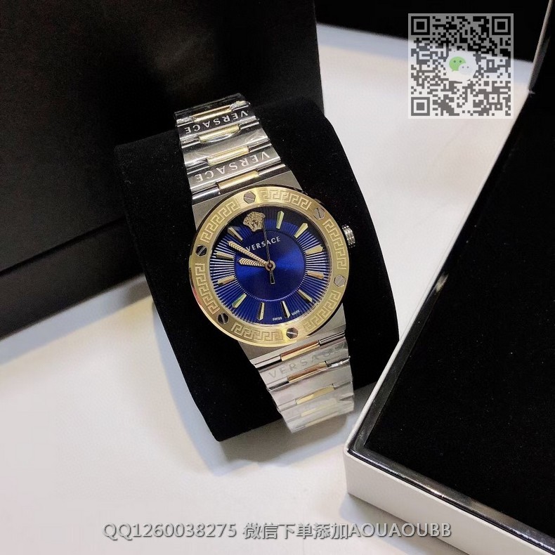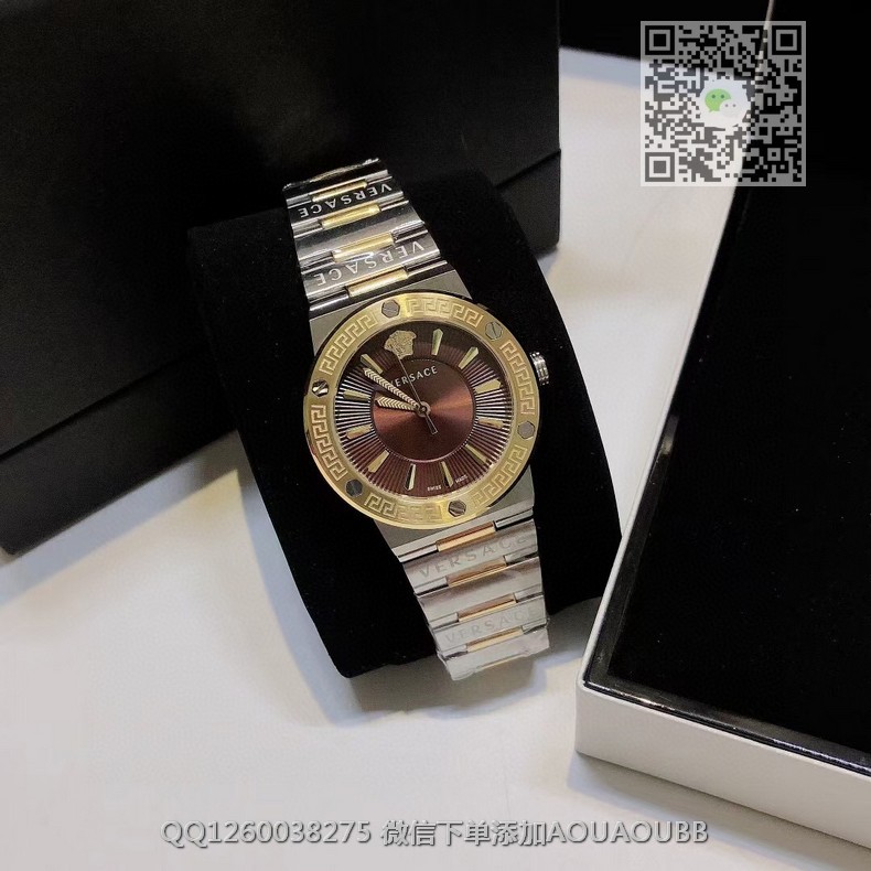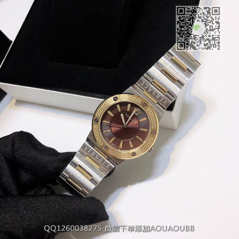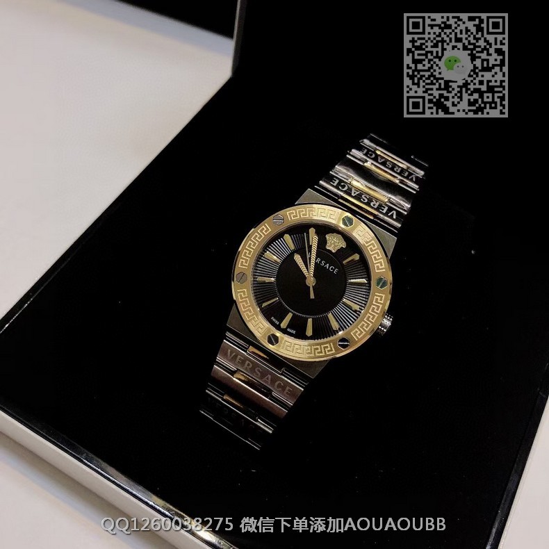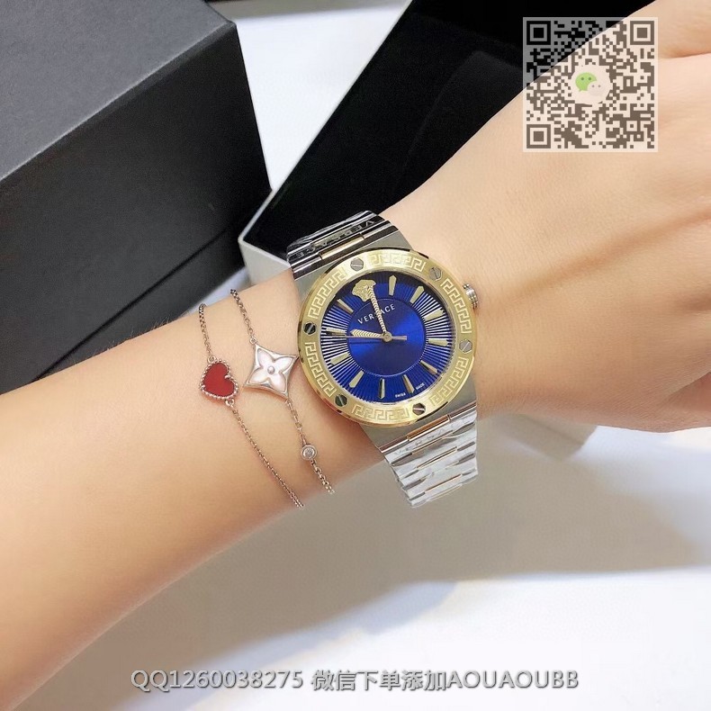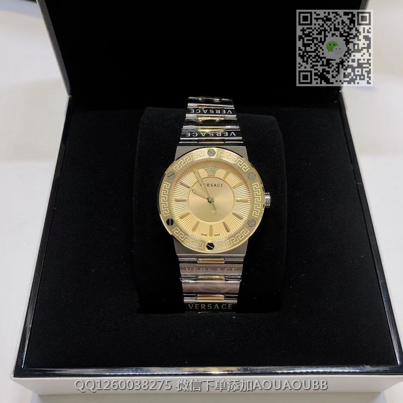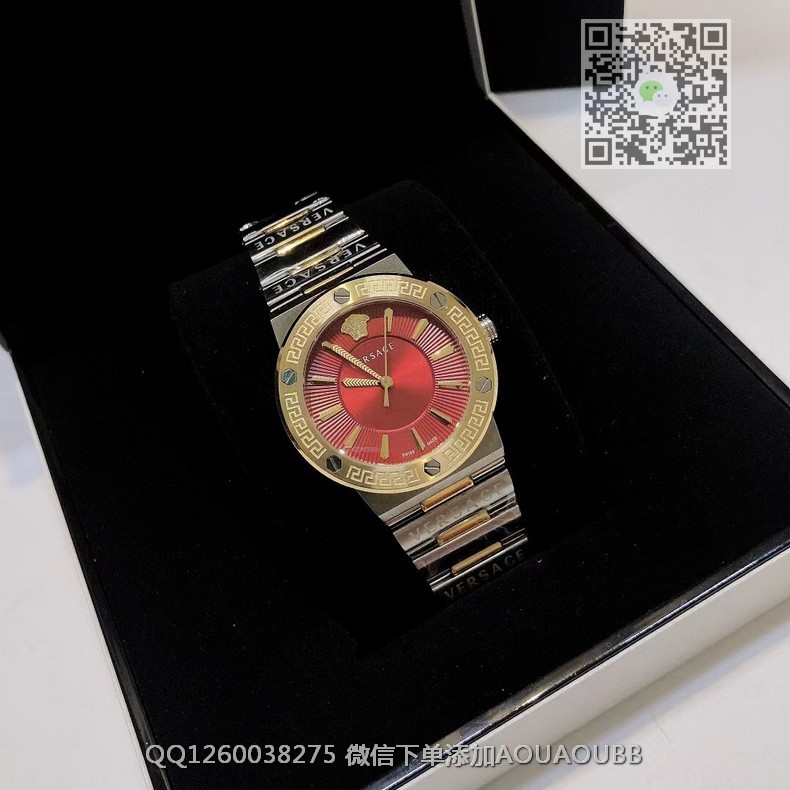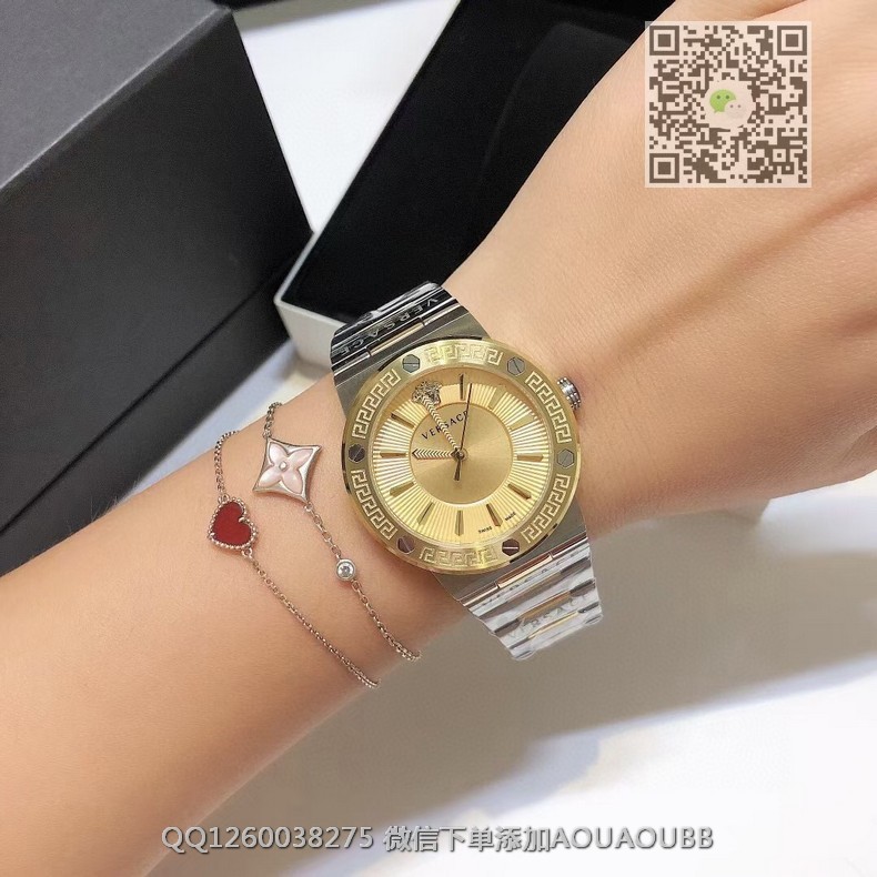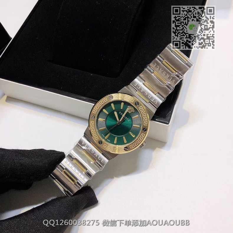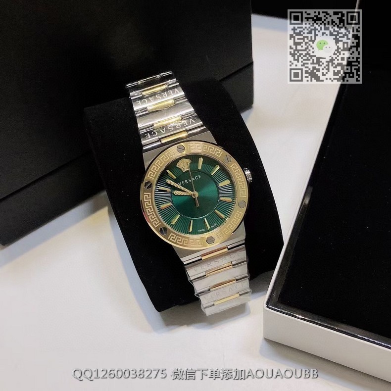 【品牌】范思哲【产品介绍】范思哲新款Versace Greca Logo 系列腕表。官网尺寸 36mm,瑞士石英机芯!绿色CD纹盘面释放复古摩登魅力,12时位美杜莎头像碰撞新潮艺术、展现瞩目风采,充满摩登现代感;薄而圆的外壳与矩形切割的表耳形成鲜明对比,表圈饰有希腊回纹与螺钉设计,镀金时针与指标、醒目张扬,掀起现在风范。抛光与拉丝质感结合,表链镌刻VERSACE字样,展现品牌华丽基因、赋予了女性化新颖设计【款式】女款【尺寸】直径36mm【表带】精钢表带【镜面】蓝宝石镜面【机芯】瑞士石英机芯【防水】50米防水【配件】原装盒,说明书,质保卡,吊牌,香港机打发票【品质检测】保证所有手表实物拍摄,所见即所得 , 手表发货前都会有严格检查测试,确保您收到的手表无质量问题