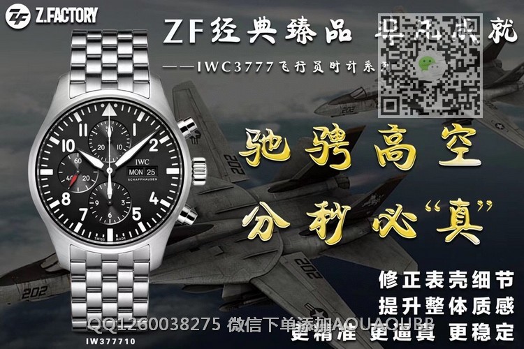 【品牌】万国【款式】男款【产品介绍】ZF经典臻品升级V2版驰骋高空分秒必“真” ZF出品IWC3777飞行员计时系列,机芯同步原装,表针尾部微微弯曲,双面防眩晕蓝色镀膜。成就此非凡经典。【成熟做工】腕表壳分为两件套,圈口和中壳为一体。难处在于中壳和圈口交接之处的直角转折打磨(需要大量的手工作业)。经过时光的淘洗,仿真度稳健,做工成熟。线条清晰而富有立体感。原汁原味的还原了该系列坚韧不拔的卓越品质。【机芯】采用TOP级ETA7750机芯,不仅结构同步原装,上链,调历,操作指针和计时功能均和原装完全吻合。【精彩细节】1.ZF沿袭万国表的传统技艺,采用双层浅蓝色防眩晕镀膜。2.分针秒针的尾部微微弯曲,细节吻合正品。【尺寸】43mmX14mm【表带】精钢表带【镜面】蓝宝石镜面【机芯】ETA7750机芯【防水】50米【配件】原装盒,说明书,质保卡,吊牌,香港机打发票【品质检测】保证所有手表实物拍摄,所见即所得 , 手表发货前都会有严格检查测试,确保您收到的手表无质量问题
