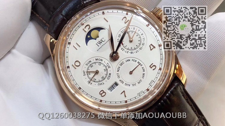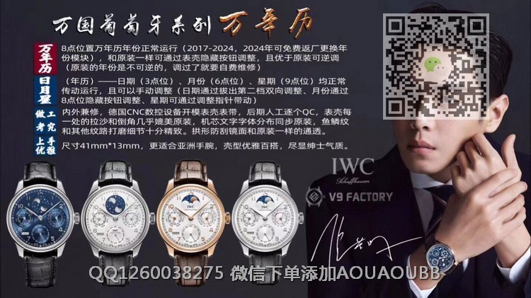 【品牌】万国【产品介绍】葡萄牙系列真万年历,复刻界第一支万年历,采用进口大精工作为基础机芯升级为52610机芯副本,不但实现了万年历大部分功能而且走时稳定,返修率极低,这是复刻市场少有的耐操性复杂功能腕表。入手理由:1、【万年历】——8点位置万年历年份正常运行,和原装一样可通过表壳隐藏按钮调整,2、【日月星】——日期(3点位)、月份(6点位)、星期(9点位)均正常传动运行,且可以手动调整(日期通过拔出第二档双向调整、月份通过8点位隐藏按钮调整、星期可通过调整指针带动);3、【做工考究】——内外兼修,德国CNC数控设备开模表壳表带,后期人工逐个QC,表壳每一处的拉沙和倒角几乎媲美原装,机芯文字字体分布同步原装,鱼鳞纹和其他纹路打磨细节十分精致。拱形防刮镜面和原装一样的通透。4、【上手优雅】——尺寸41mm*13mm,更适合亚洲手腕,壳型优雅百搭,尽显绅士气质,陈柏霖、张若昀同款。5、【机芯稳定】大精工机芯与生俱来误差小且稳定,在此基础上,所有成表装配成功后都会在瑞士进口的QE模拟器上模拟测试一天,没有误差或者偷停的情况下才会出货,这是有史以来COPY市场最复杂且最稳定的表款【尺寸】41mmx13mm【表带】意大利牛皮表带【镜面】蓝宝石镜面【机芯】复刻正品cal.52610机芯【防水】50米【配件】原装盒,说明书,质保卡,吊牌,香港机打发票【品质检测】保证所有手表实物拍摄,所见即所得 , 手表发货前都会有严格检查测试,确保您收到的手表无质量问题