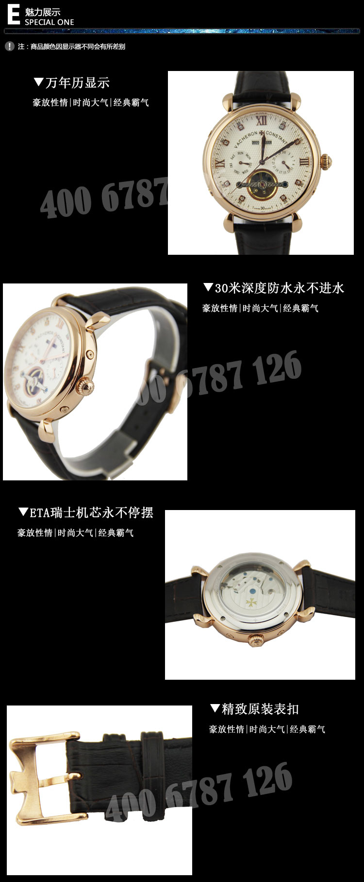 退换货:本商城提供7天包退,15天包换服务。退换货的前提是手表无任何损花佩戴,千万不要拆卸表带,所退换商品要求具备商品收到时完整的外包装、配件、吊牌等不影响2次销售的。办理的话直接联系微信客服登记处理。4、手表防水注意事项