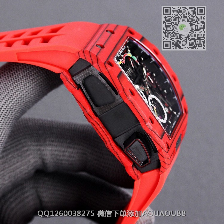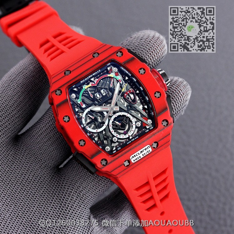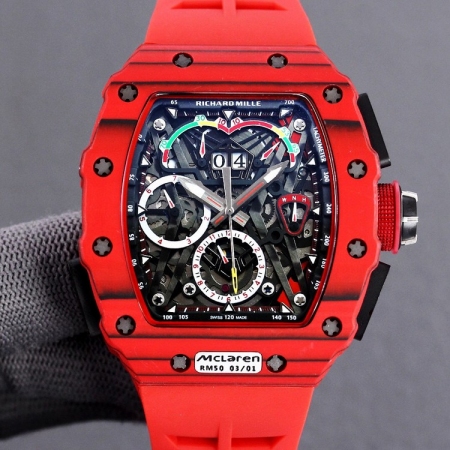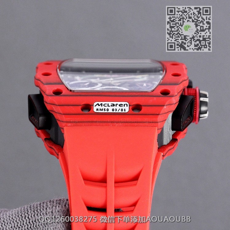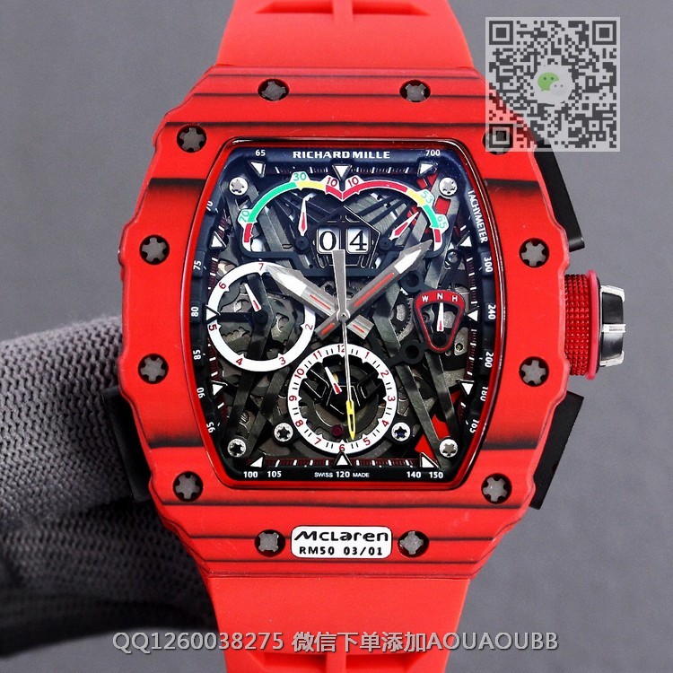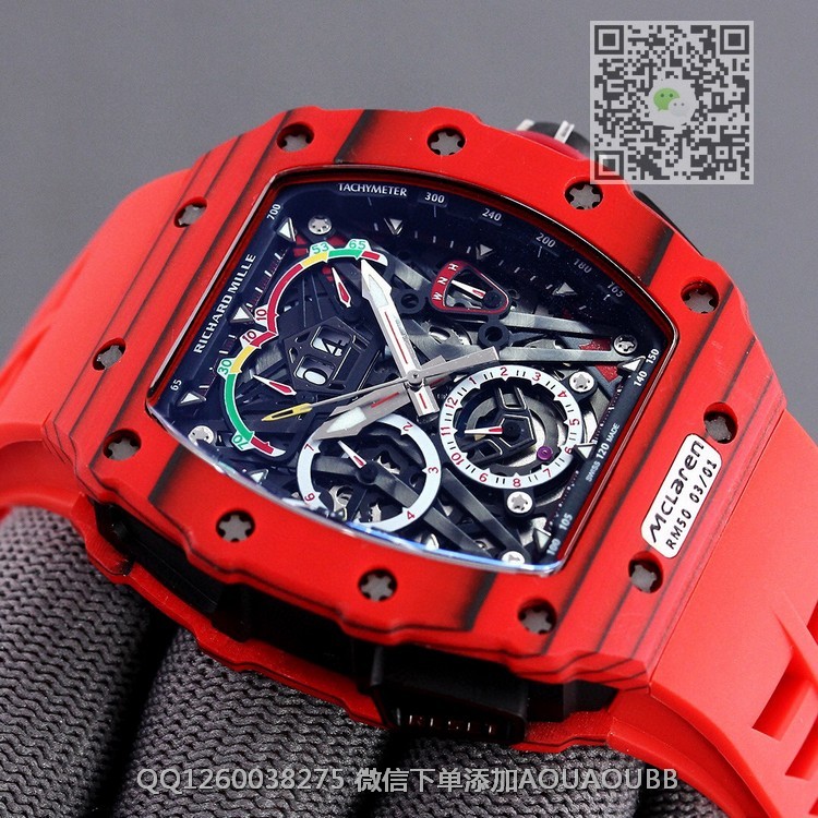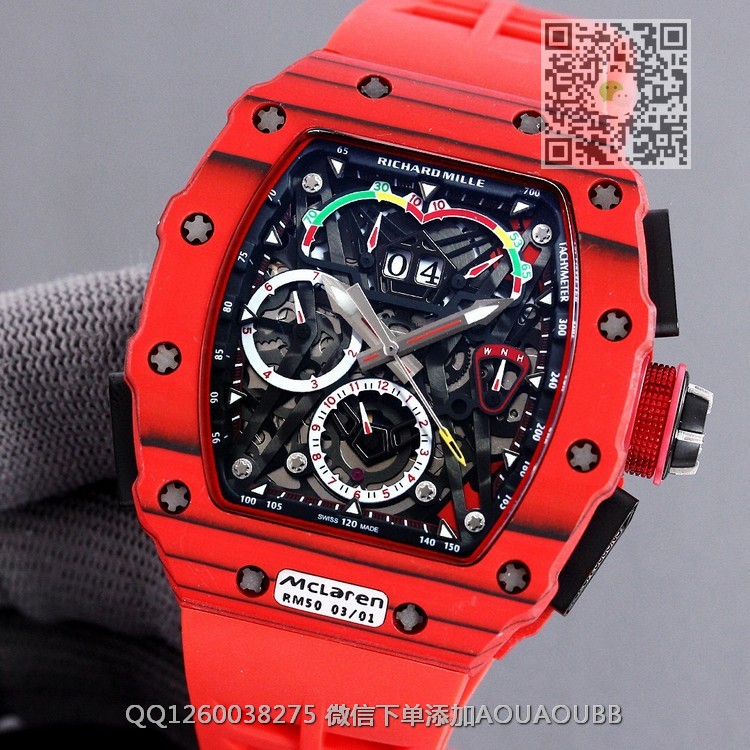 【品牌】理查德米勒【产品介绍】RichardMille理查德•米勒 (腕表型号: RM50-03,迈凯轮)艺术提升了全新层次,顶级碳纤维壳套 完美的纹路 顶级的做工!搭载大日历多功能全自动机械机芯,进口橡胶表带原装鑫折叠扣,尺寸50X40mm展现着理查品牌的高端与经典!!!品质选择!【款式】男款【尺寸】50X40mm【表带】橡胶牛皮表带【镜面】蓝宝石镜面【机芯】复刻正品机芯【防水】50米防水【配件】原装盒,说明书,质保卡,吊牌,香港机打发票【品质检测】保证所有手表实物拍摄,所见即所得 , 手表发货前都会有严格检查测试,确保您收到的手表无质量问题
