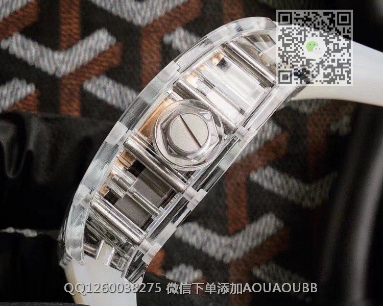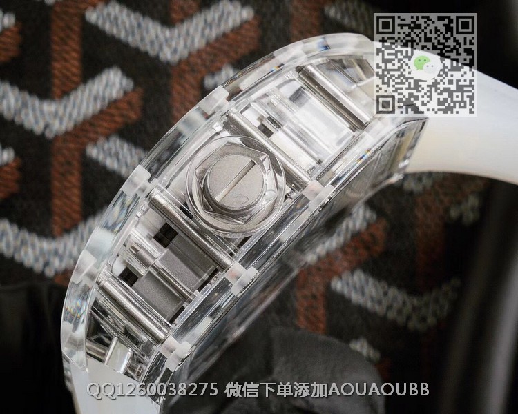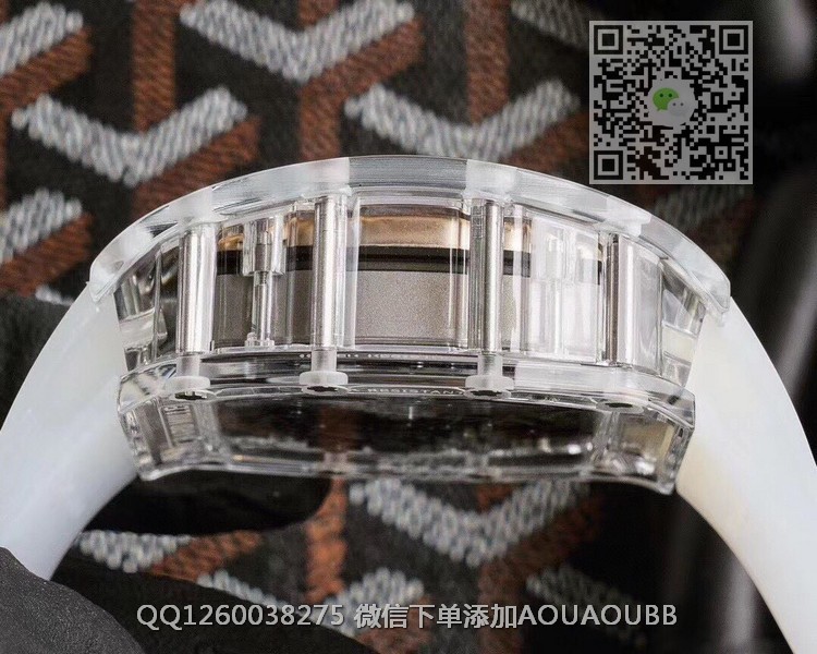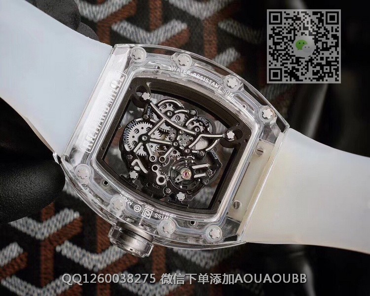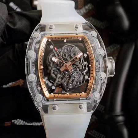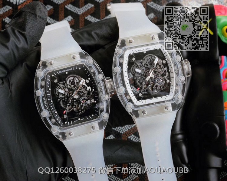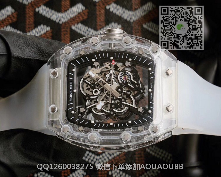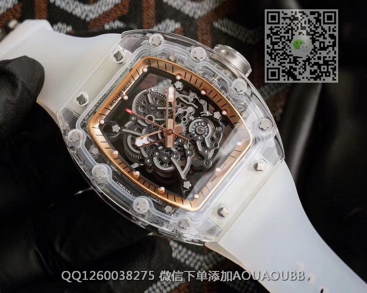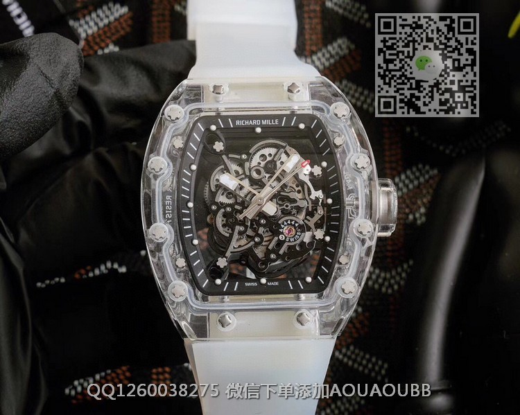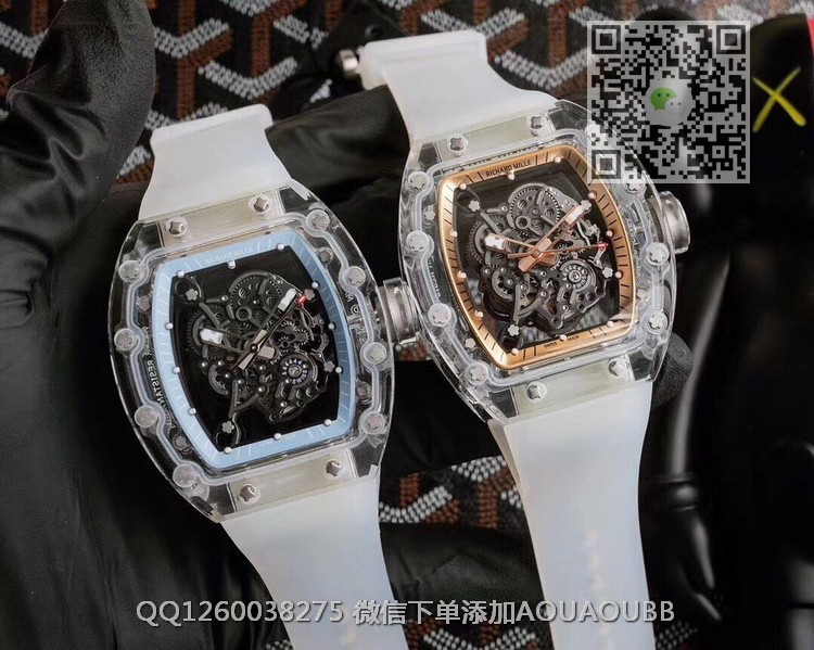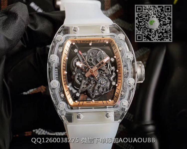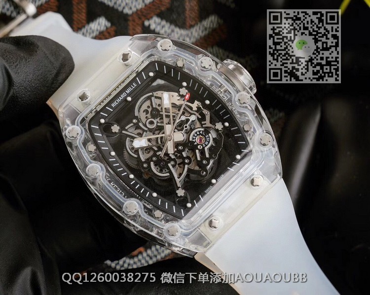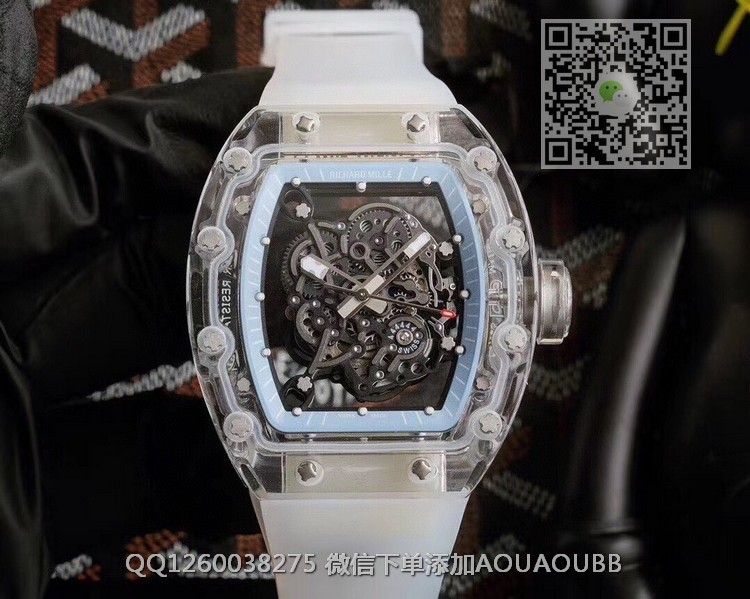 【产品介绍】理查德米勒RM055玻璃透明系列!创新之作!全玻璃材质壳套,最火爆的镂空设计!日本全自动精工改版机芯,走时最精准的机芯,配用舒适柔软的橡胶表带搭原装折叠表扣!这是一款让视觉一览无余的展现,潮流与壕气的顶端腕表