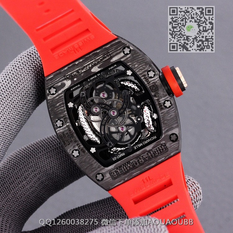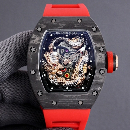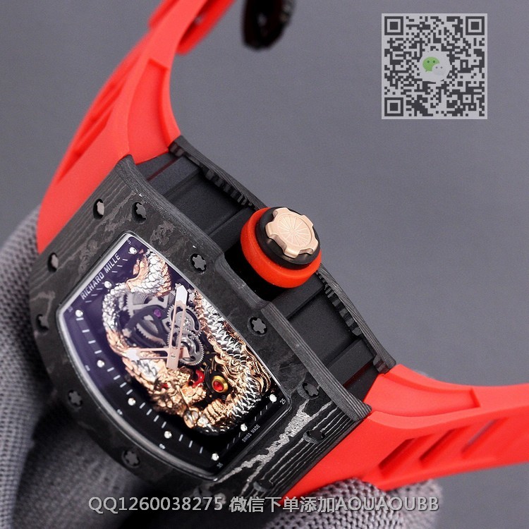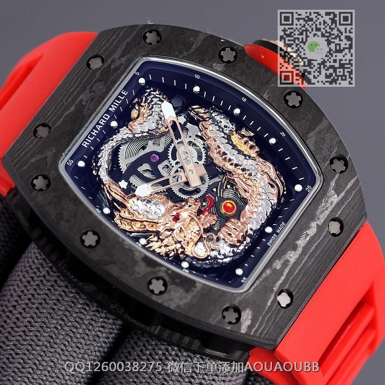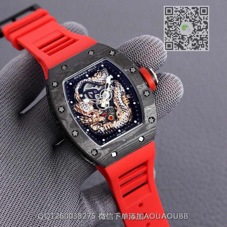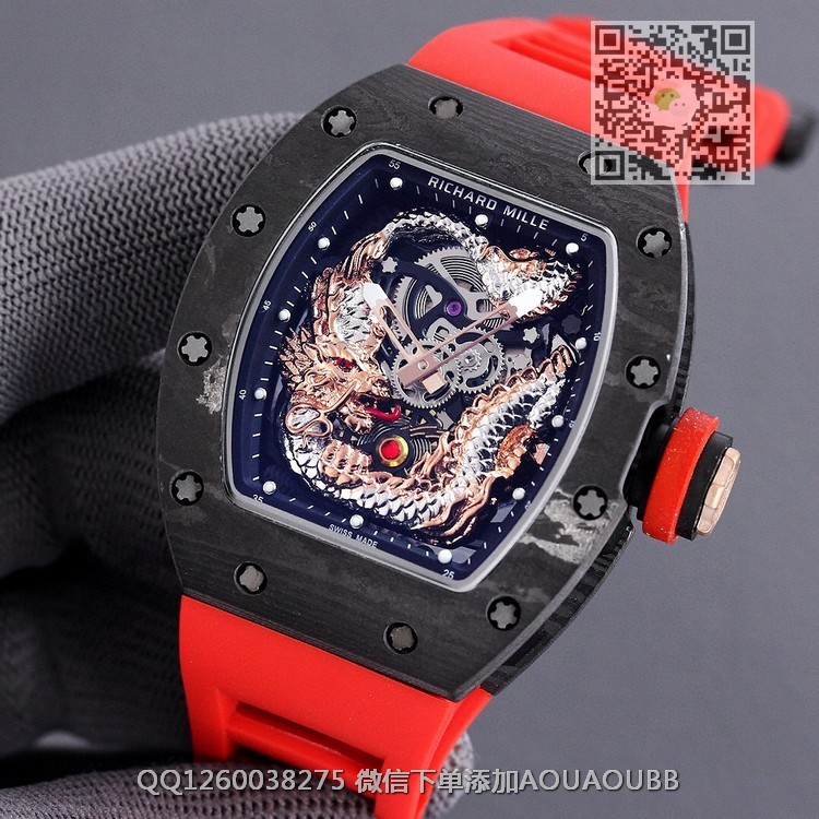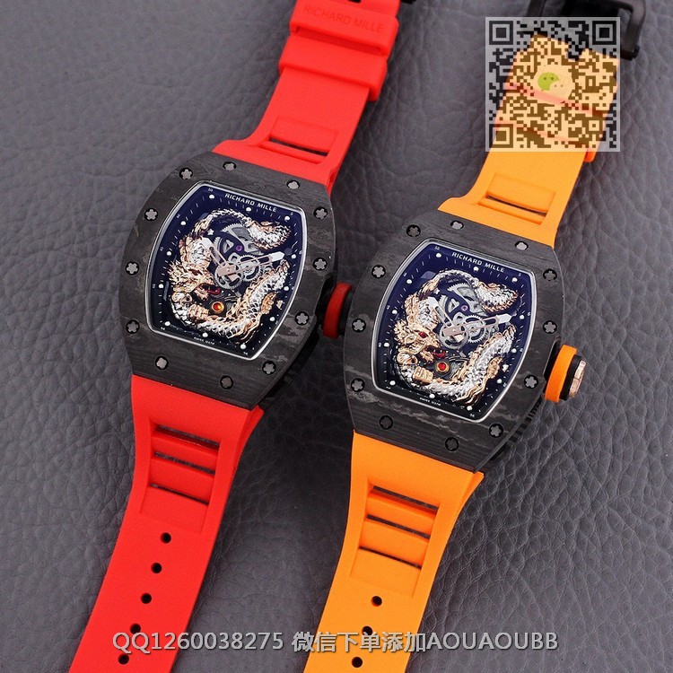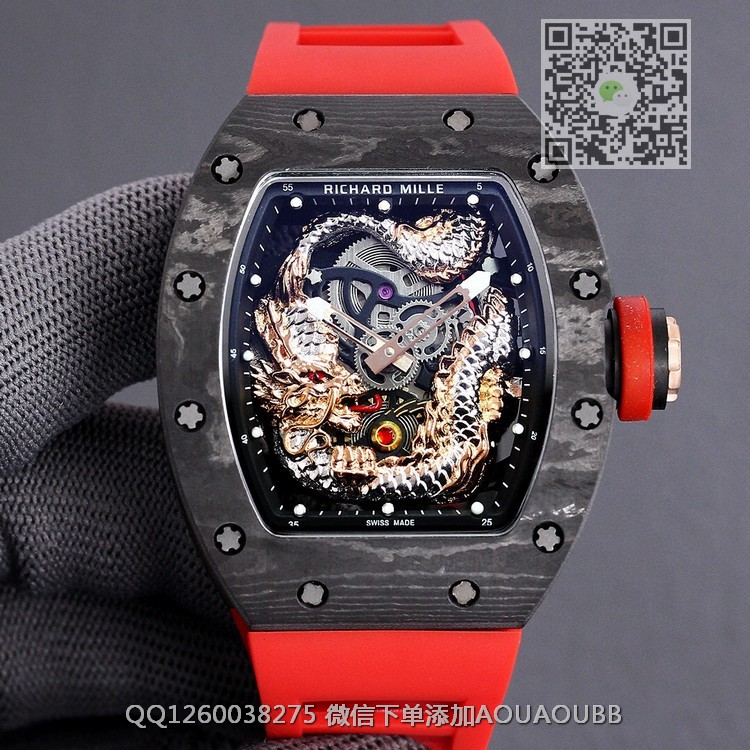 【品牌】理查德米勒【产品介绍】成龙大哥同款Jack Chen Richard Mille 理查德米勒 RM57-03飞龙在天系列全球限量8只贵重来不是你的缺点!此款腕表壳套采用进口德国碳纤维材质鑫打造,搭载进口定制型机机芯 精准走时,配搭高端鑫橡树胶带、原装折叠扣!!!龙在中国“四大祥兽”,龙是中国等东亚区域古代神话传说中的神异动物,常用来象征祥瑞。【款式】男款【尺寸】40mmx50mm【表带】橡胶表带【镜面】蓝宝石镜面【机芯】复刻正品机芯【防水】50米防水【配件】原装盒,说明书,质保卡,吊牌,香港机打发票【品质检测】保证所有手表实物拍摄,所见即所得 , 手表发货前都会有严格检查测试,确保您收到的手表无质量问题