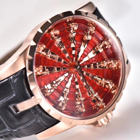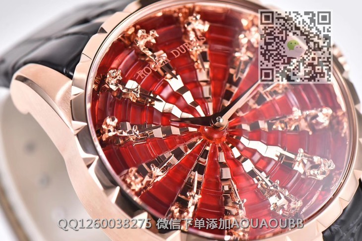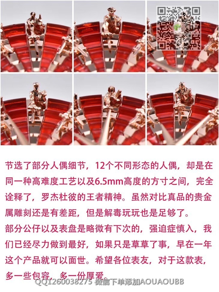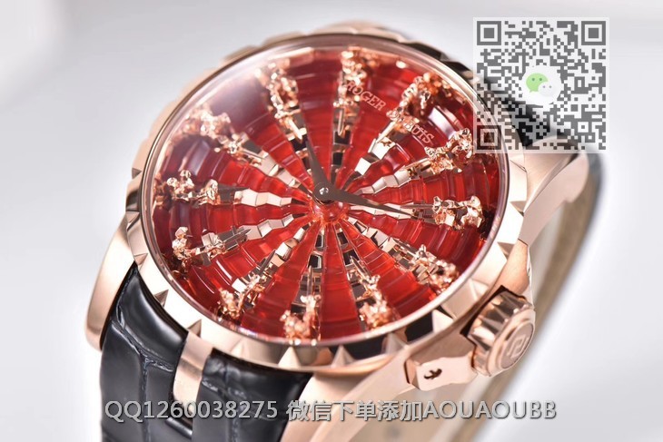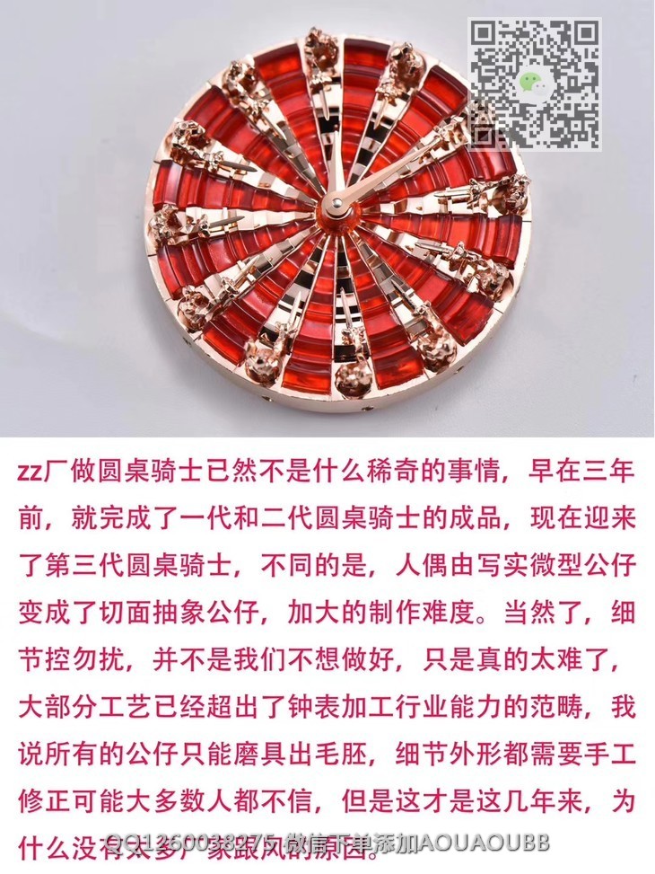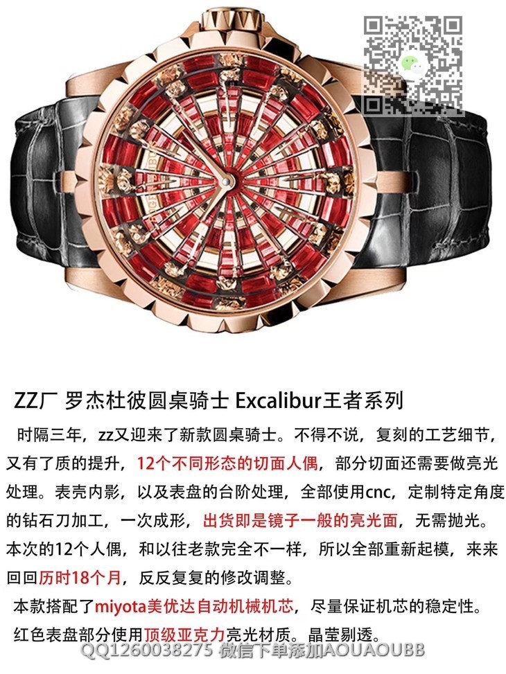 【产品介绍】ZZ厂罗杰杜彼圆桌骑士 Excalibur王者系列时隔三年,zz又迎来了新款圆桌骑士。不得不说,复刻的工艺细节,又有了质的提升,12个不同形态的切面人偶,部分切面还需要做亮光处理。表壳内影,以及表盘的台阶处理,全部使用cnc,定制特定角度的钻石刀加工,一次成形,出货即是镜子一般的亮光面,无需抛光本次的12个人偶,和以往老款完全不一样,所以全部重新起模,来来回回历时18个月,反反复复的修改调整。本款搭配了 miyota美优达自动机械机芯,尽量保证机芯的稳定性红色表盘部分使用顶级亚克力亮光材质。晶莹剔透。