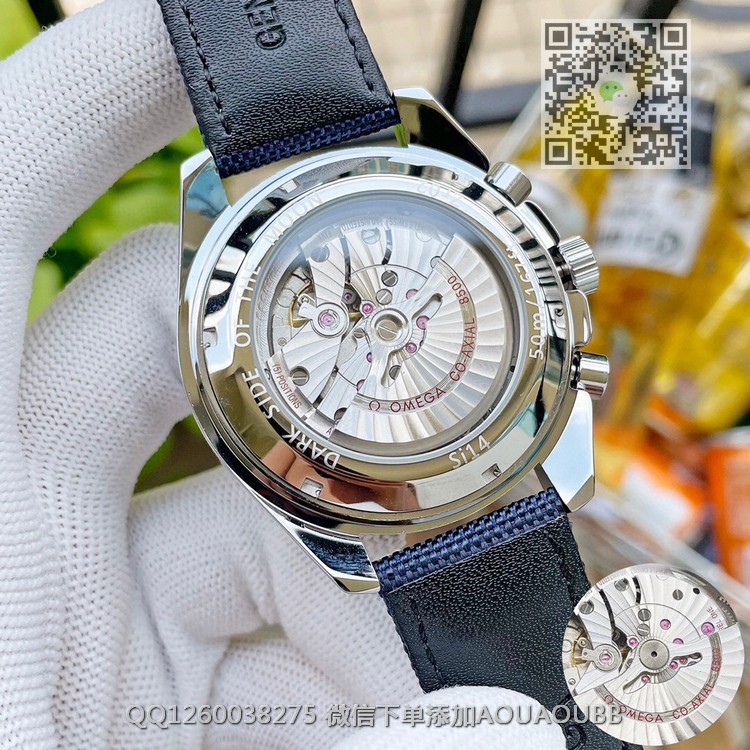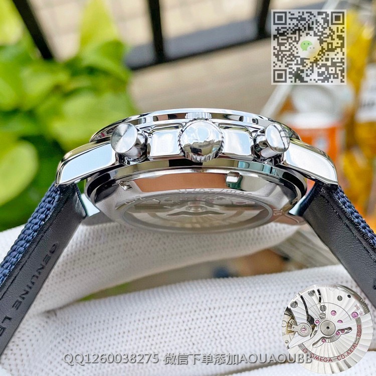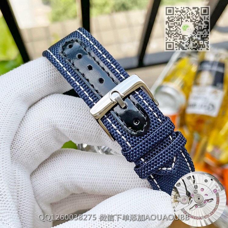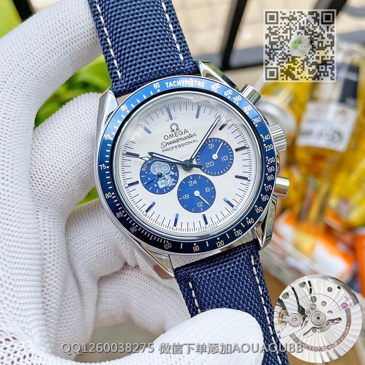 【品牌】欧米茄【产品介绍】欧米茄超霸周年系列,42毫米至臻天文台计时表采用精钢打造,搭配蓝色尼龙针织表带,表带内衬饰有“阿波罗13号”任务的航行轨道。银质表盘饰有经蓝色PVD技术处理的立体时标与经典的超霸“月球表”风格的指针,9点位的蓝色小表盘饰有“史努比”银质浮雕勋章【款式】男款【尺寸】直径42mm【表带】意大利牛皮表带【镜面】蓝宝石镜面【机芯】瑞士8500全自动机芯【防水】50米【配件】原装盒,说明书,质保卡,吊牌,香港机打发票【品质检测】保证所有手表实物拍摄,所见即所得 , 手表发货前都会有严格检查测试,确保您收到的手表无质量问题