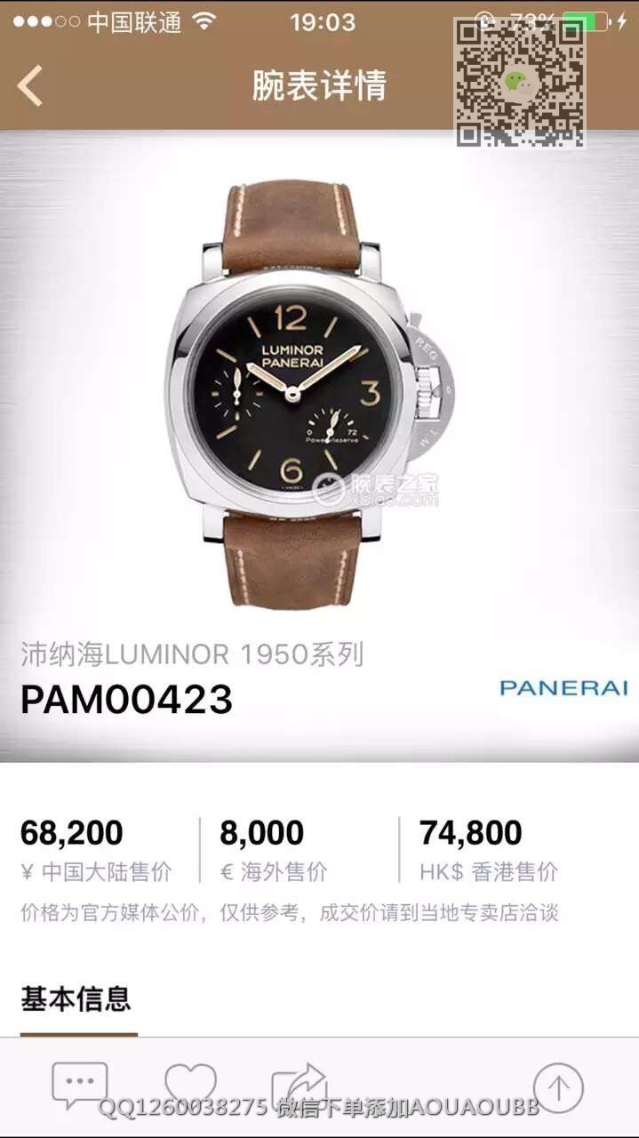 【产品介绍】沛纳海PAM00423,原装抛光316L精钢