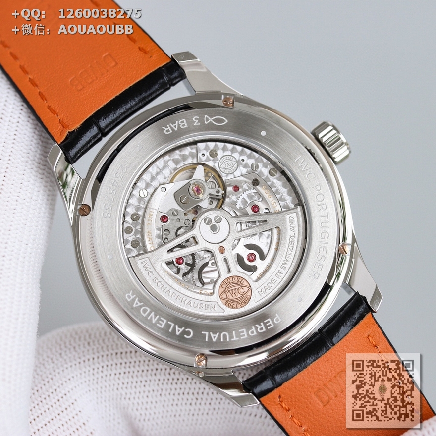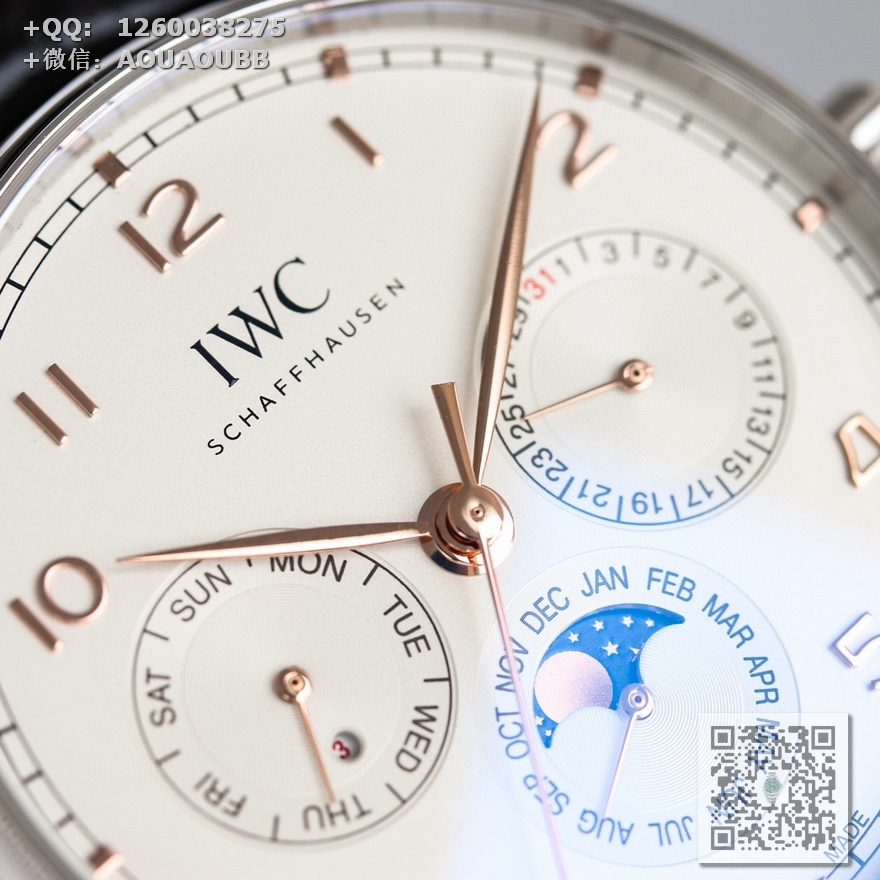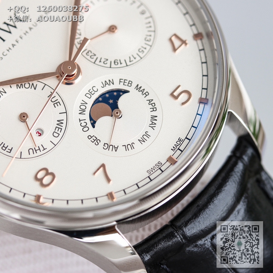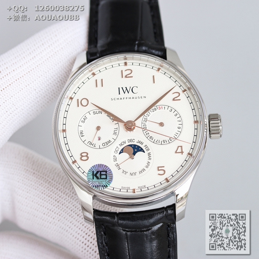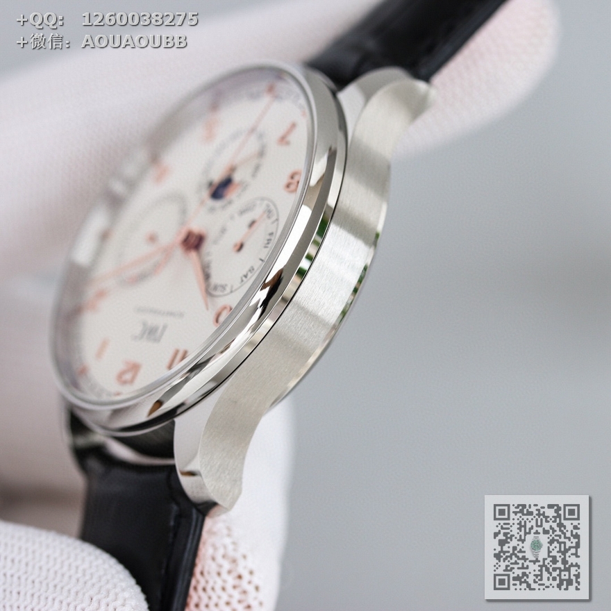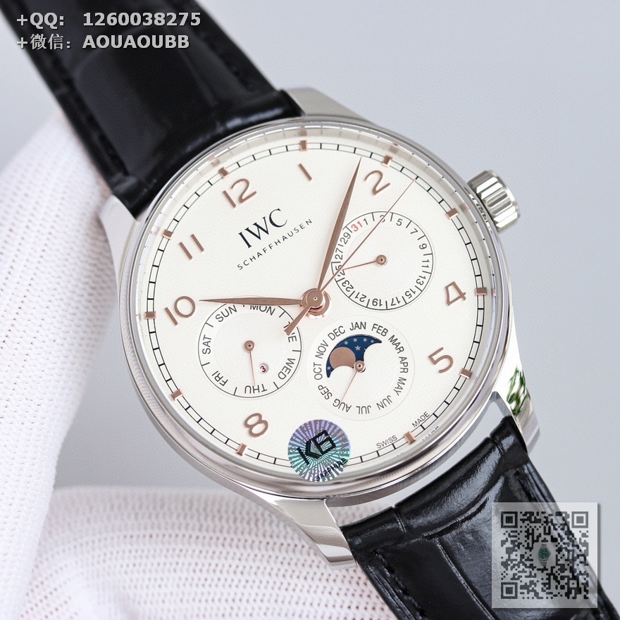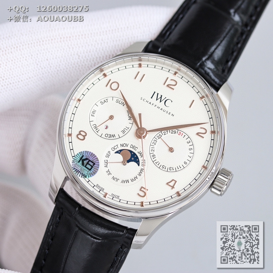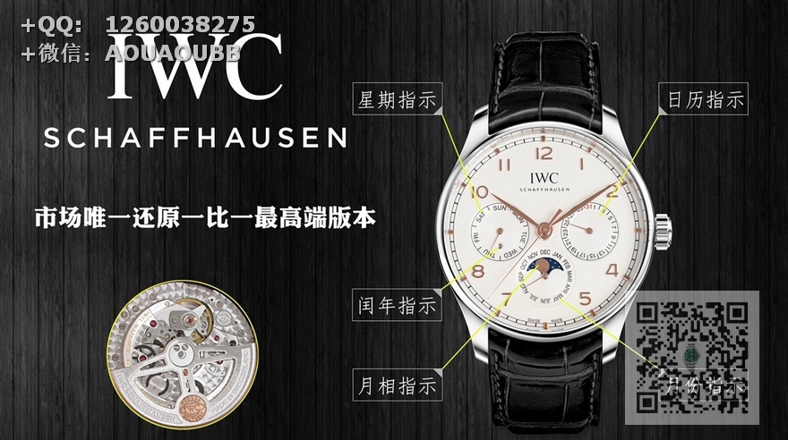 【产品介绍】GE工厂新品隆重登场——最新款万国葡萄牙系列腕表,集时间、日期、星期、闰年、真月相和月份于一身,完美复刻正品一切功能,正所谓功能卓越,大器晚成,有请各路表友品鉴支持。【表壳】腕表尺寸42.mmX13mm,厚度适中,表壳采用CNC顶级工艺打磨,线条清晰流畅,效果保持了高级水准。前后蓝宝石镜面,且前侧玻璃镀膜通透度达到极致,【机芯】采用日本原装9015改装成正品Cal.82650机芯,特别是机芯摆轮位置花费了机芯厂工程师大量的时间来改动,实现了摆轮位置和正品一致,通过大量的尝试和数据分析,实现结构与Cal.82650机芯能有99%的吻合度,调试方法和手感百分百同步。【表盘】 新表布局由3个小表盘组成,视觉上更为紧凑,也提升了阅读性——3点为清晰易读的日历盘,6点整合月份盘和月相显示,月相精准,月相盘为一个月走一圈,功能同步正品,9点的星期盘嵌有一个精巧的闰年视窗,通过L/1/2/3提示闰年,温馨提示闰年功能是目前市场独一无二的功能,GE工厂不惜成本还原正品风貌,给大家带来最接近正品的无敌体验。【表带扣】意大利小牛皮搭配IWC原装级别折叠扣和针扣