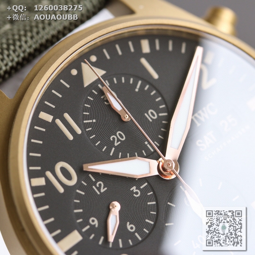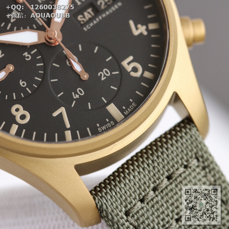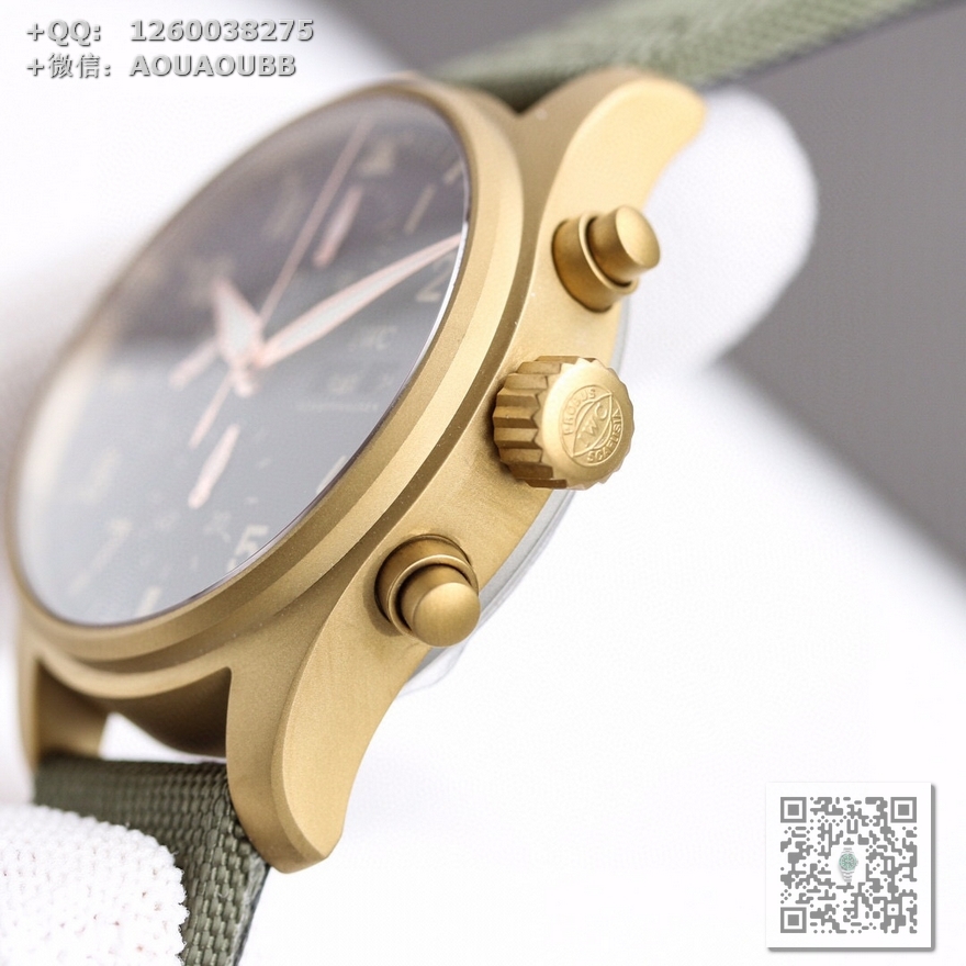【产品介绍】ZF新款万国青铜计时喷火战机IW387907,2021年5月份沙夫豪森IWC万国携手“MR PORTER 10周年”特别版,限量发行以纪念这家知名时尚电商品牌成立10周年,该腕表独一无二的配色方案,结合青铜表壳与黑色表盘及柔软的Alcantara表带,极具军事风范,同时给人以更加休闲的观感,金色阿拉伯数字和暖色青铜表壳完美互补,并与指针上的白色荧光嵌饰形成鲜明对比,腕表直径41毫米,内置ETA7750机芯,稳健,可靠与精准,另外,机芯可提供48小时动力储存!