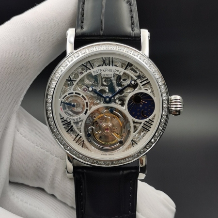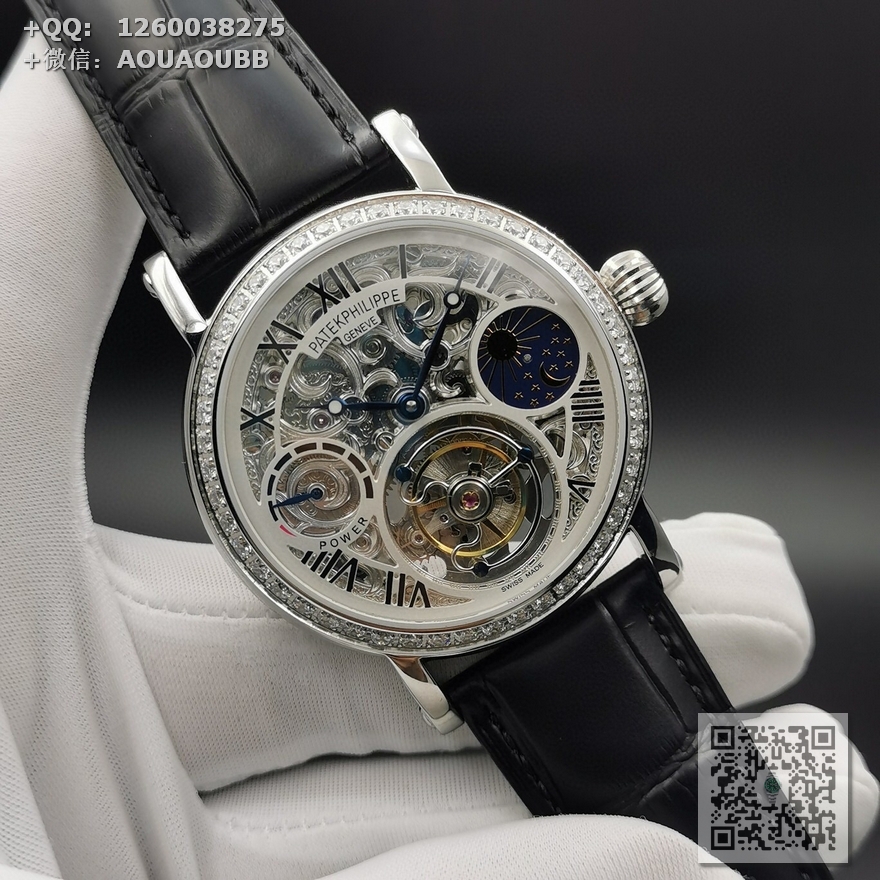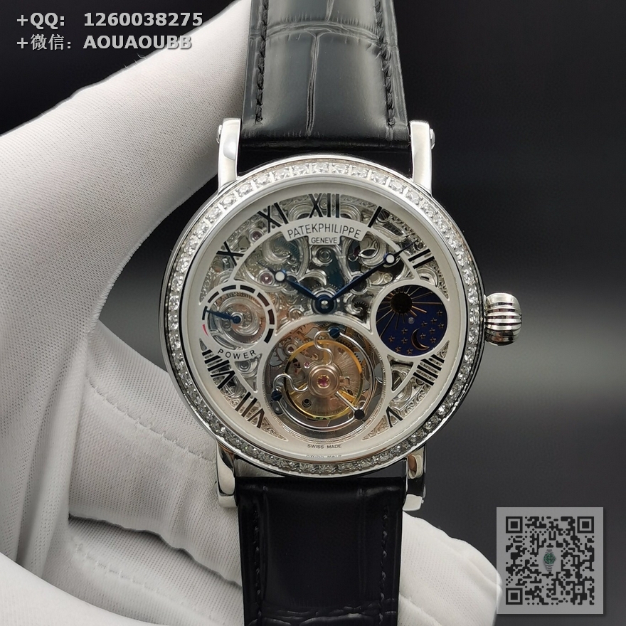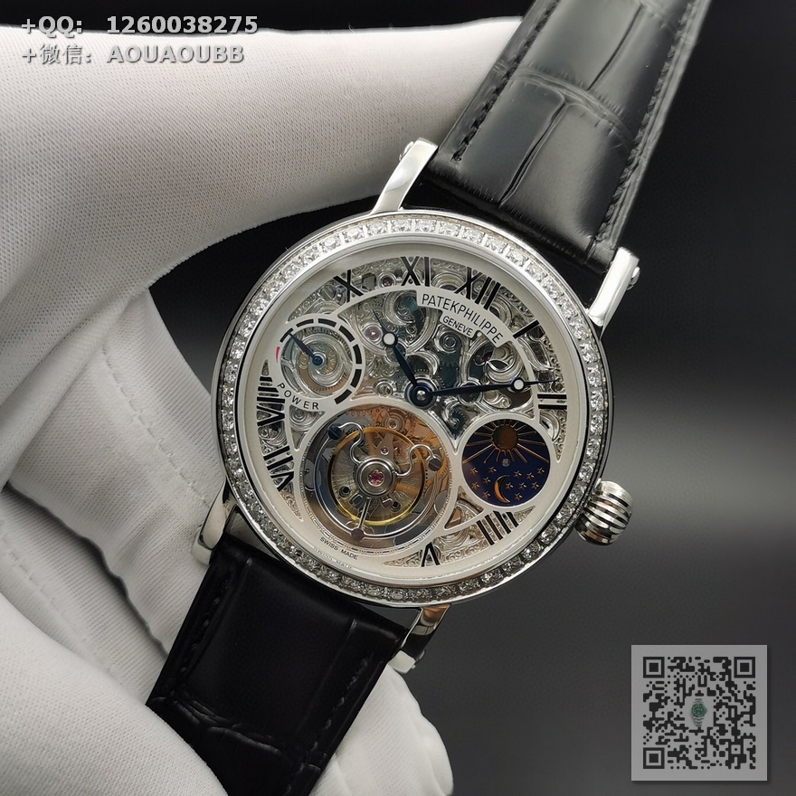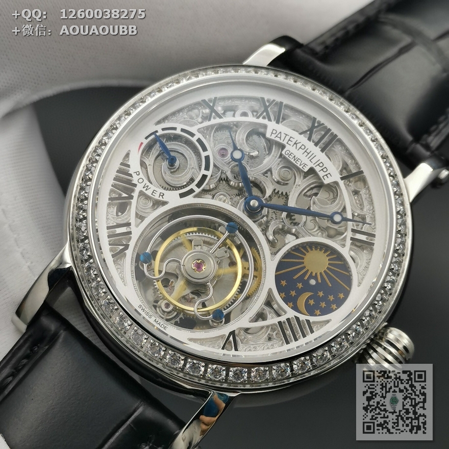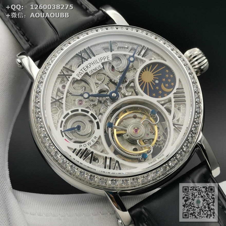 【产品介绍】 最新力作百达翡丽 (鏤空動能顯示) 月相星辰顶)级手动同轴陀飞轮机芯 原装折叠扣 手动上链机械陀飞轮!雕花透底,316钢壳 烧钢蓝指针,直径42mm.厚度12mm,72小時储蓄动力双面蓝宝石玻璃 意大利真皮