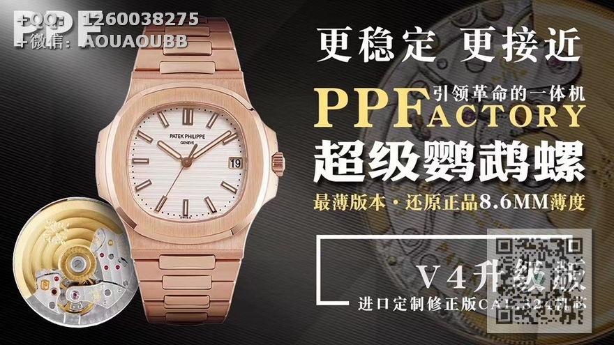 【产品介绍】️PPF V4版 璀璨到货第一款真正意义上的超级鹦鹉螺,震撼来袭,全新修正的不锈钢表带,铰链部分根据真正的百达翡丽鹦鹉螺不锈钢表带拆解开发,和正品一致的贴合效果,逆袭之前所有副本,铰链开合角度和正品一致,锁毕声音和正品相同,重点指出此次V4版的面盘在采用与真品一致的覆荧光涂层金质立体时标,特别突出的“蓝魅”面无限接近原版,机芯方面是全新订制的修正版的一体芯Cal.324机芯,是目前唯一做到机芯的钢印与正品一样的雕刻工艺。只有做到最好才配戴他去诗和远方,PPFactory.超级鹦鹉螺王中王