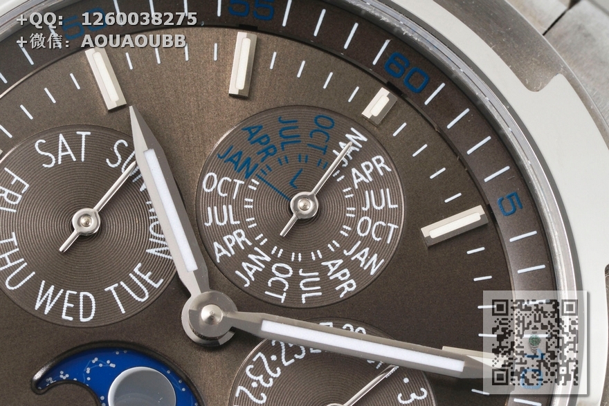 【产品介绍】PPF最新顶级版本 Overseas纵横四海4300V系列万年历腕表 腕表采用直径41.5毫米的表壳,搭载自动上链机械机芯—— 1120 QP/1超薄机芯,该机芯配备万年历和月相显示。(9字位星期、3字位日期、12字位月份) 经旭日纹缎面拉丝处理的金质表盘 以蜗形纹装饰的小表盘清晰易读 搭配造价不菲的指针相得益彰 每一枚腕表都可以配戴一键快拆式钢带 胶带 皮带 欢迎鉴赏