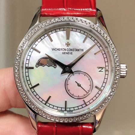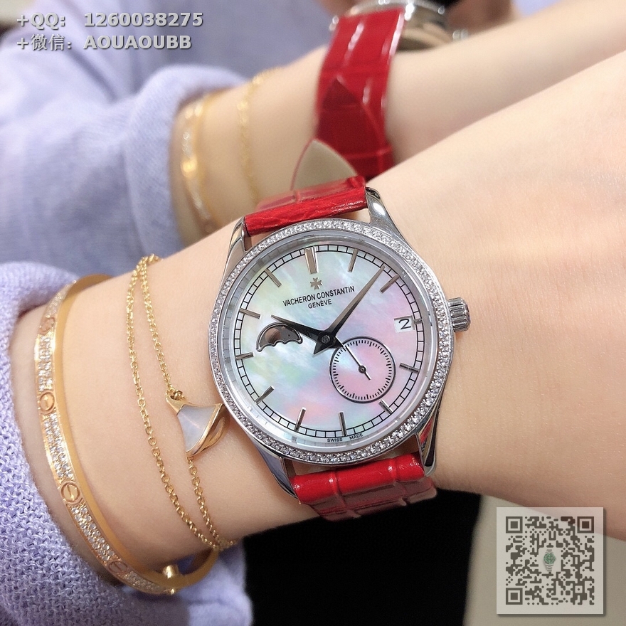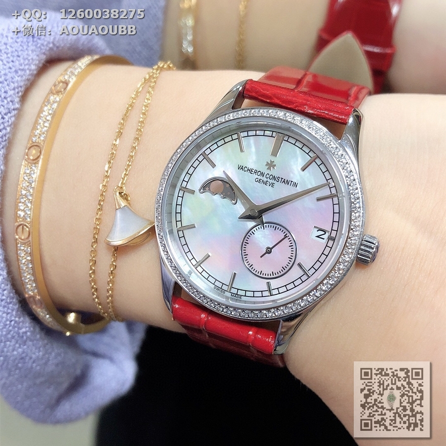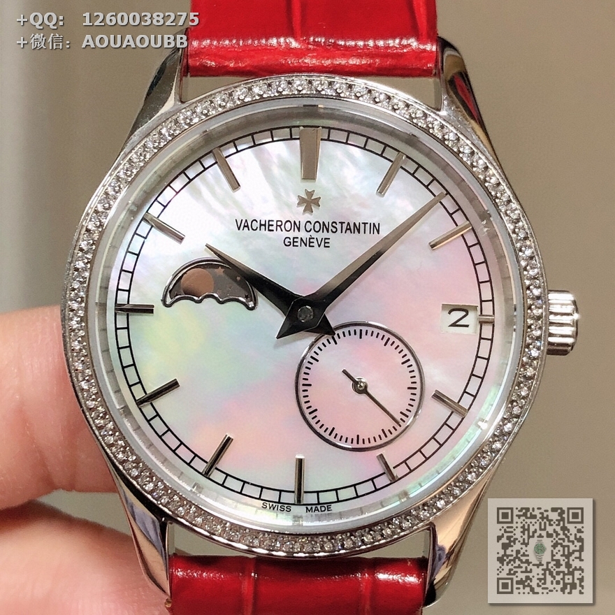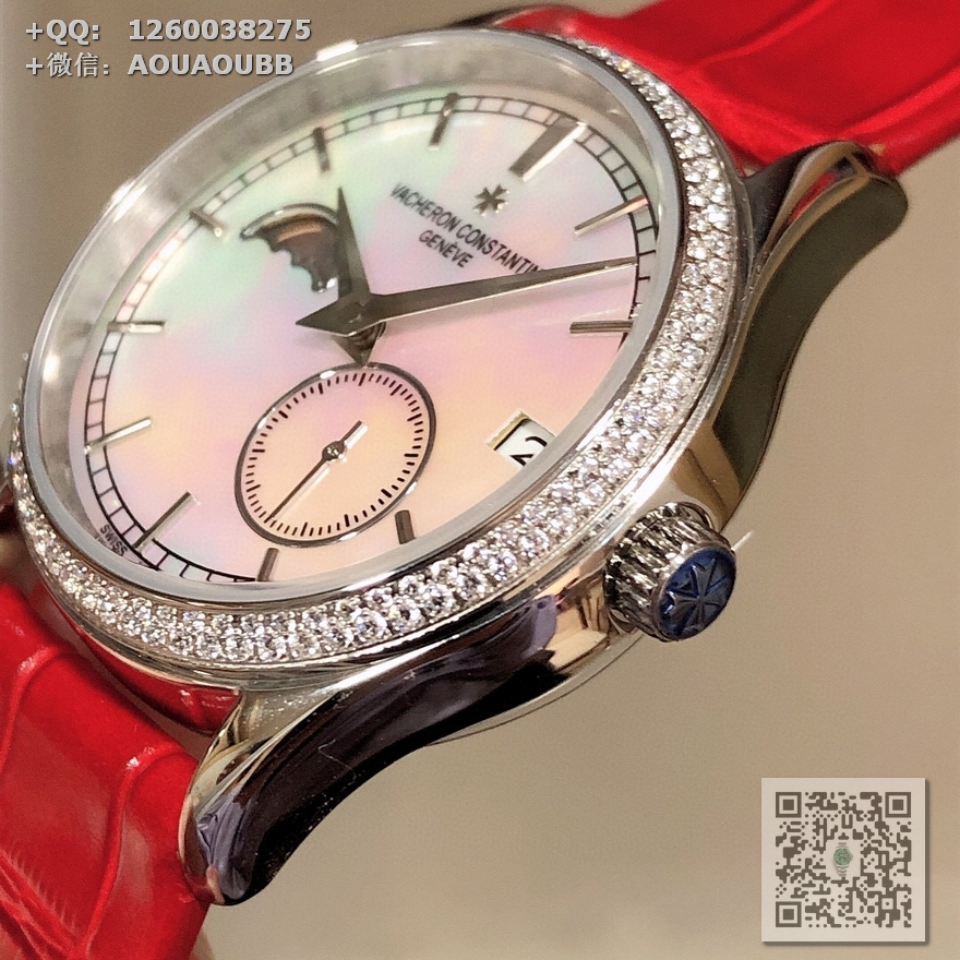 一款市场独一无二不可替代的女王腕表、微距下说不出的优美、用江诗丹顿致您的誓爱!专门研发定制出来的一款高端大气时尚新品(指针的细腻,配合贝母表盘,更显美感.月相以及镶嵌进贝母的金边,完美契合.贝母表盘定制在不同的光线下会有不同的效果,江诗丹顿.魂牵梦绕)【@机芯使用纯进口8219原装机 走时精准稳定 :九字位功能系真月相、四五字位系小秒针跑秒、带有日历 时分针走时!表壳材质:316进口精钢.表壳尺寸:33mm. 防水深度:3 . 表底盖:透明蓝宝水晶玻璃底盖.表带:意大利进口小牛皮原装针扣.