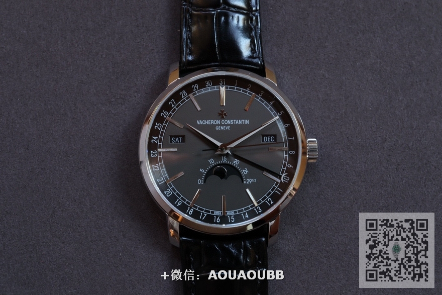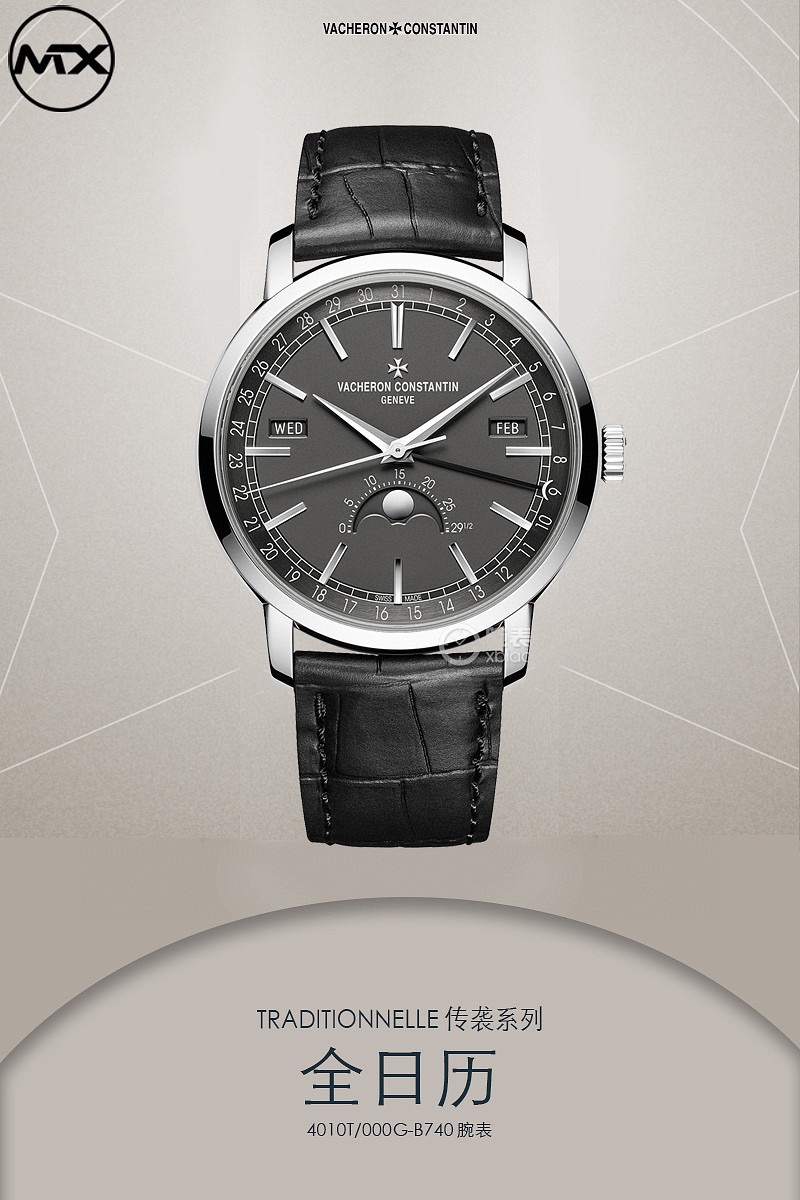 【品牌】江诗丹顿【产品介绍】周月轮回,分秒轮转 Mx沉淀新品——江诗丹顿 Traditionnelle 传袭系列全日历腕表【型号】:4010T/O00R-B344/B740/B345【表壳】:腕表直径41mm,厚度10.7mm,阶梯式圆形表壳和表耳、凹槽底盖。经过抛光打磨精修,星现出无与伦比的质感;【表盘】:轨道式分钟刻度園以及太妃式时针和分针,保留了江诗丹顿独创的标志性日历显示。星期和月份视窗对称分布于表盘两侧,表盘外围的数宇表圈为日历显示.由一根优雅的黑色月牙指针轻轻托起,方便读取。巧思的设计打破表盘的沉闷感.这一布局清晰地展现了 6点位的精密月相显示。在彰显灵动魅力的同时,也尽显复杂机械的别致美感。【机芯】:以CITIZEN9015为基础自主研发2460 QCL/1,自动上链一体机芯。MX不惜成本历时两年,多次修改机芯模具参数、更换精密零件,几经修改终于真正做极致的完美。#江诗丹顿 ##卓尔不群#【款式】男款【尺寸】41mmx10.7mm【表带】意大利牛皮表带【镜面】蓝宝石镜面【机芯】2460 QCL/1机芯【防水】50米防水【配件】原装盒,说明书,质保卡,吊牌,香港机打发票【品质检测】保证所有手表实物拍摄,所见即所得 , 手表发货前都会有严格检查测试,确保您收到的手表无质量问题
