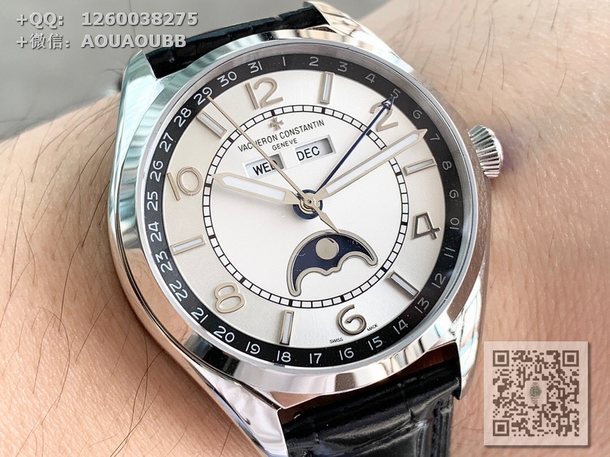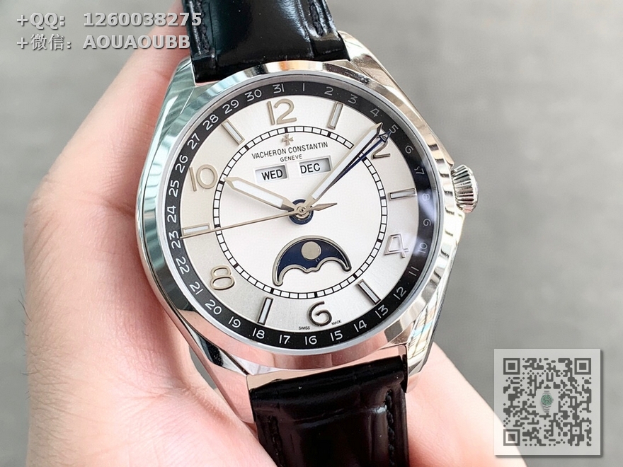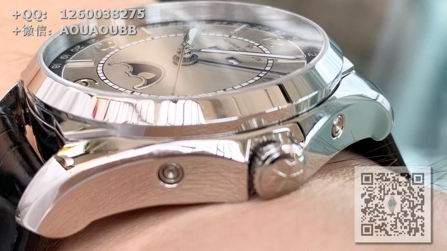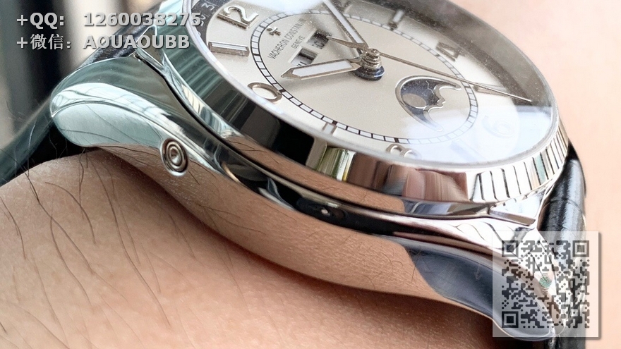 【产品介绍】江诗丹顿伍陆之型月相腕表全面升级,参考编号:4000E / 000A-B439(白钢),4000E / 000R-B438(玫瑰金)直径:40mm,厚度:12.6毫米,316精钢圆形表壳,45度倒角凸显出流畅线条,嵌入式表冠沿袭1965腕表经典特色,镌刻马耳他LOGO图样,凸显品牌独特的美学魅力,旭日形外圈,乳白色中心和经典海之蓝字面,阿拉伯数字与夜光涂层时标,完美配合,突显精致气质,6字月相显示由蓝色夜空和18k玫瑰金质组成,和时标相映成趣,让你随时随地欣赏月色,搭载2460QCL/1全新机芯,防水深度:50米,全日历月相腕表12点钟两个矩形视窗分别为星期,月份,日期显示,日期于表盘外缘,由蓝色带箭头指针指示,充满现代元素,全新时尚风范演绎,休闲大气,贵族气息!升级版v7,1.修正六字位月相位置,深蓝色底板嵌镶烫金太阳UP,而非印刷,光泽鲜亮,会有反光效果,太阳位置与正品一致,呈现出整个太阳视觉效果,而不是以往市场的呈现一半.2.锥形嵌入式把头,修正LOGO字样,做到高效还原正品!3.自动快拆意大利双面皮带,皮质柔软细腻,更显高贵,4.机芯夹板升级,与老款不同,细节处理更加细致,摆轮位置增加日内瓦标志(鹰和钥匙),一体真轴承中心嵌镶红色宝石,缩短与原装距离,做到更加逼真,提升整体档次,加量不加价!