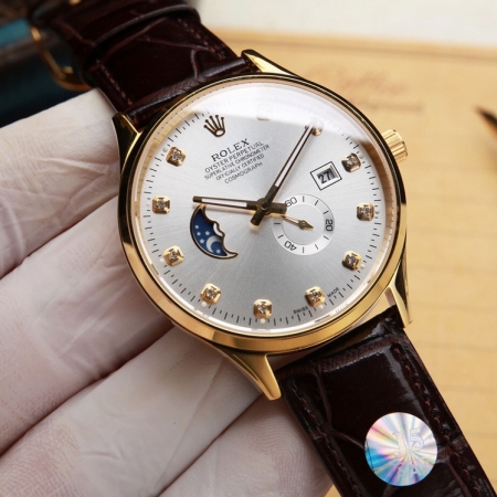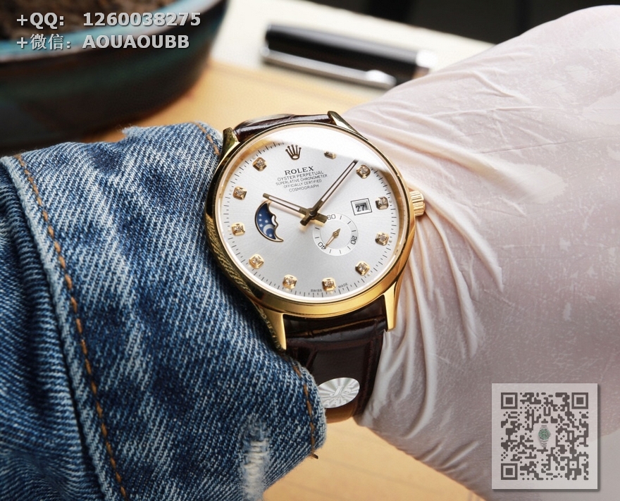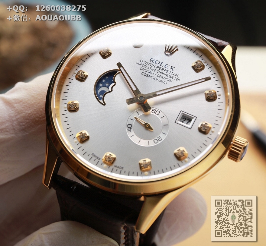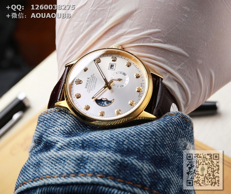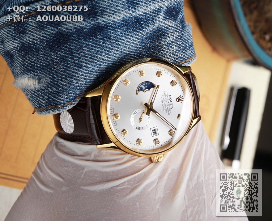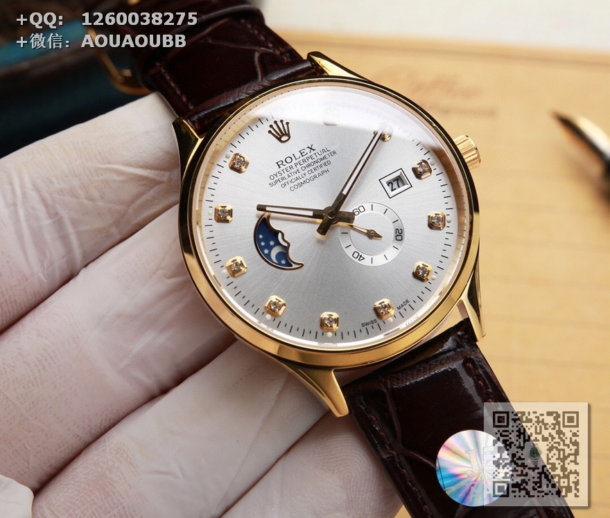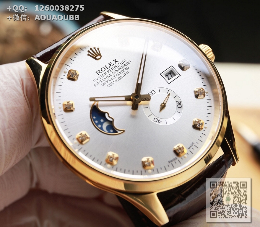 【产品介绍】(本品均已严格经过防水压力测试,防水可达120米)劳力士ROLEX. 日志系列 采用简洁的2针半布局,9点位置巧妙设计为一枚月牙型的日月星辰,台湾厂J5出品,日月星辰系列,搭载定制版原装进口8219机芯(0返修0售后),9位24小时/真月相显示,3位日历显示 4.5位则是小秒设计……双卜蓝宝石玻璃镜面,意大利牛皮,表径40X10mm