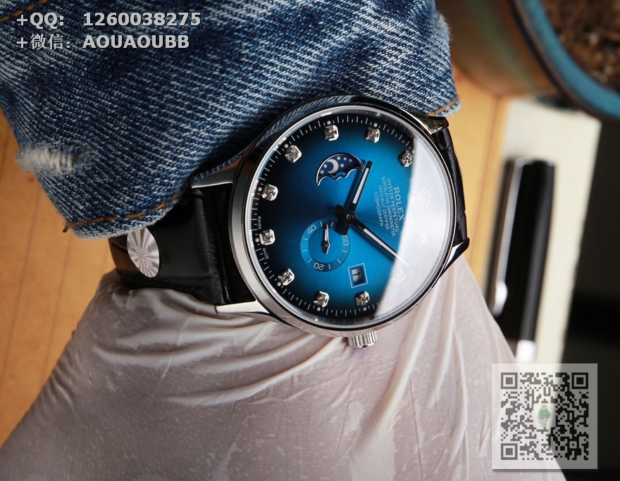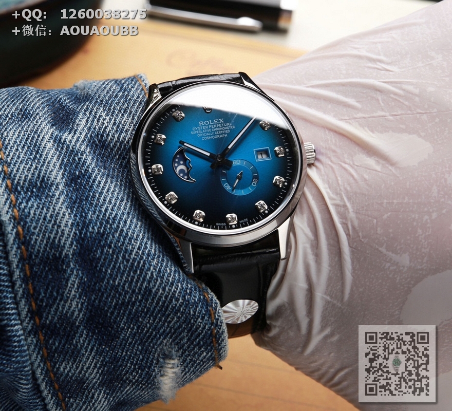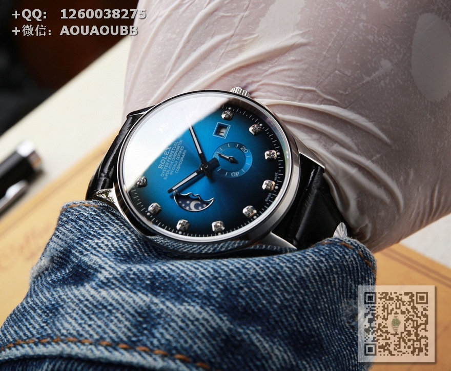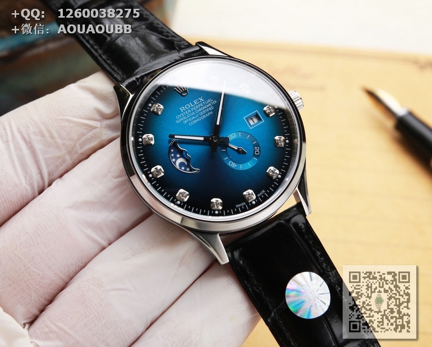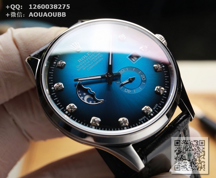【产品介绍】(本品均已严格经过防水压力测试,防水可达120米)劳力士ROLEX. 日志系列 采用简洁的2针半布局,9点位置巧妙设计为一枚月牙型的日月星辰,台湾厂J5出品,日月星辰系列,搭载定制版原装进口8219机芯(0返修0售后),9位24小时/真月相显示,3位日历显示 4.5位则是小秒设计……双卜蓝宝石玻璃镜面,意大利牛皮,表径40X10mm