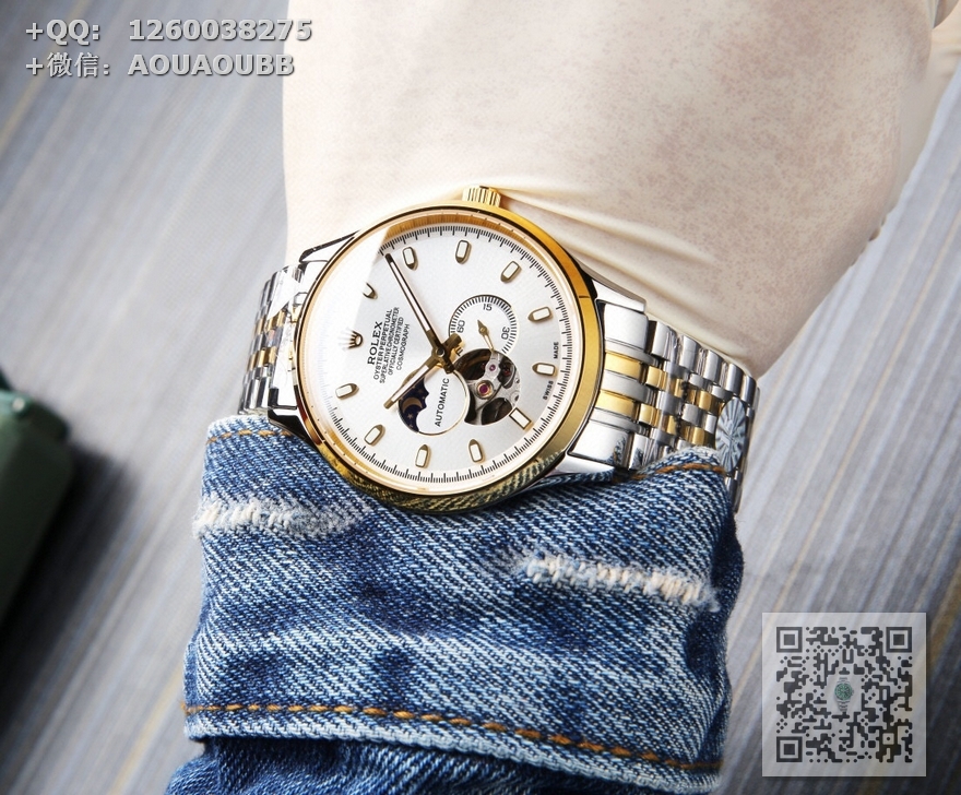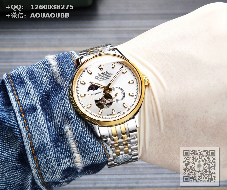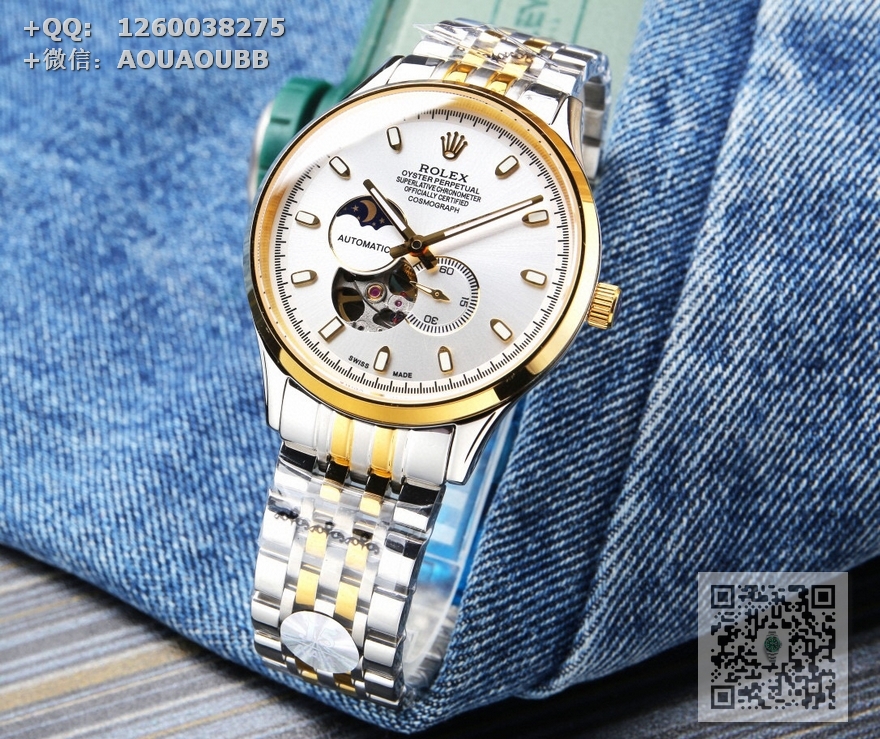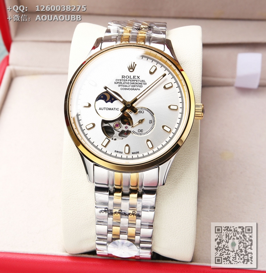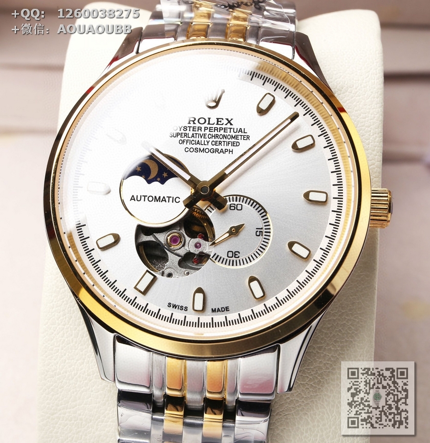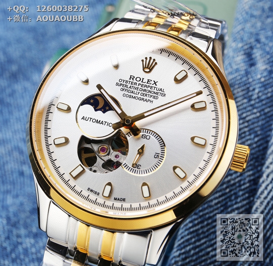 劳力士,日月星辰系列,搭载原装进口82S7机芯(0返修0售后),采用超A精钢壳套(做工精细,防水程度可达5度。可游泳)字面采用进口优质铜材(做工细致无瑕疵,在自然光下很有层次感,光彩夺目。)9位个性24小时/真月相显示,镂空设计,机芯运作一览无余,5位小秒。双卜蓝宝石玻璃镜面,超强夜光效果,意大利牛皮,表径40X11m。5度防水!