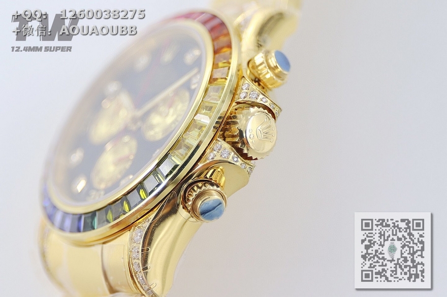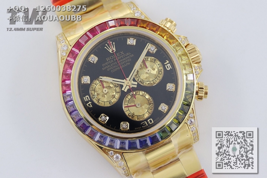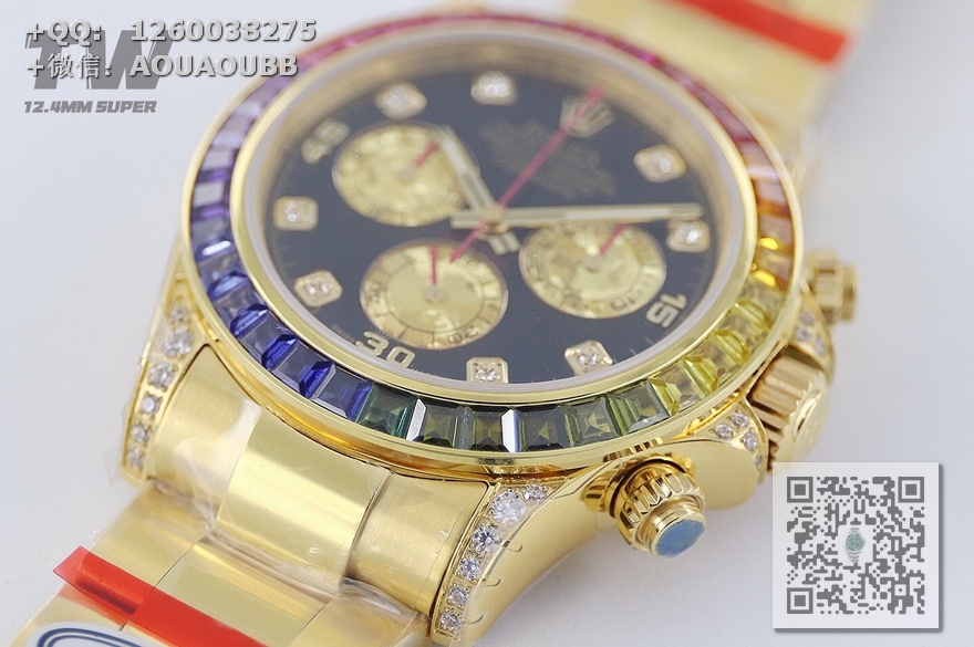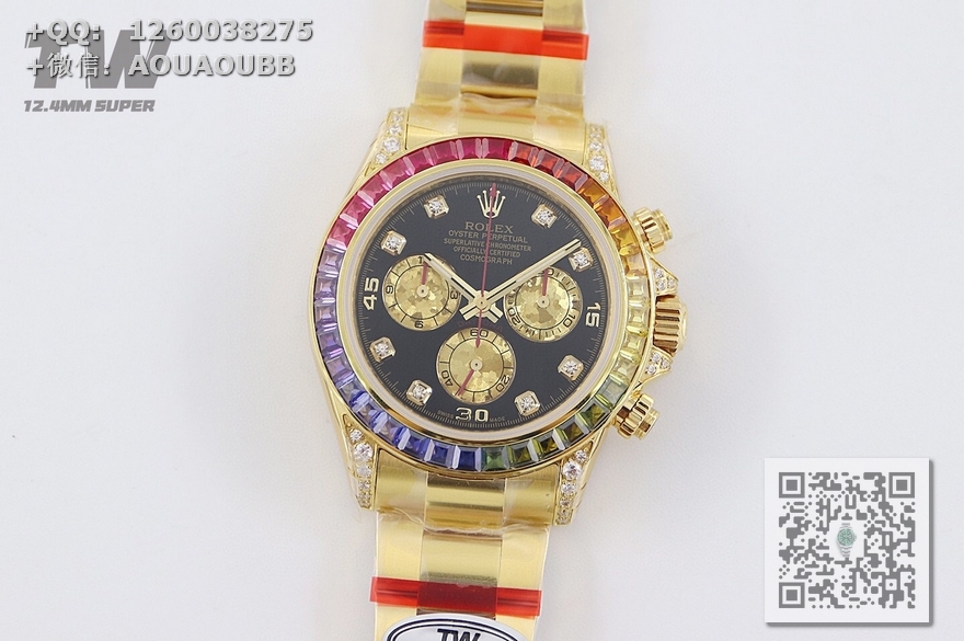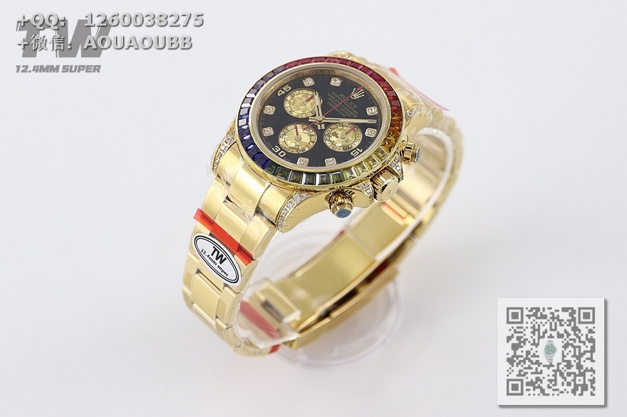 【产品介绍】当手表遇上彩虹 华贵与美丽的碰撞--TW新款宇宙计时型迪通拿904L钢腕表 彩虹迪款这项设计最新设计将高科技与非凡美共冶一炉。【表壳】尺寸40Mm,蚝式表壳保证防水100米,表壳以整块实心904L钢造而成。【圈口】 镶嵌根据原厂颜色渐变过渡最协调的36颗宝石进行优化处理,高度、角度一致,折射效果非常漂亮。【面盘】字面每个计时盘为光线的不同而发生折射,色泽鲜艳亮丽,小眼位置对准原装,独一无二。【镜面】镜面以蓝宝水晶制造,不易刮损。【机芯】采用7750改版4130机芯,(无空档)高效精准稳定【表带】腕表搭配折叠式表扣,同样采用904L钢打造,且表扣具有微调装置,可以调到非常的贴合手腕。出货实拍