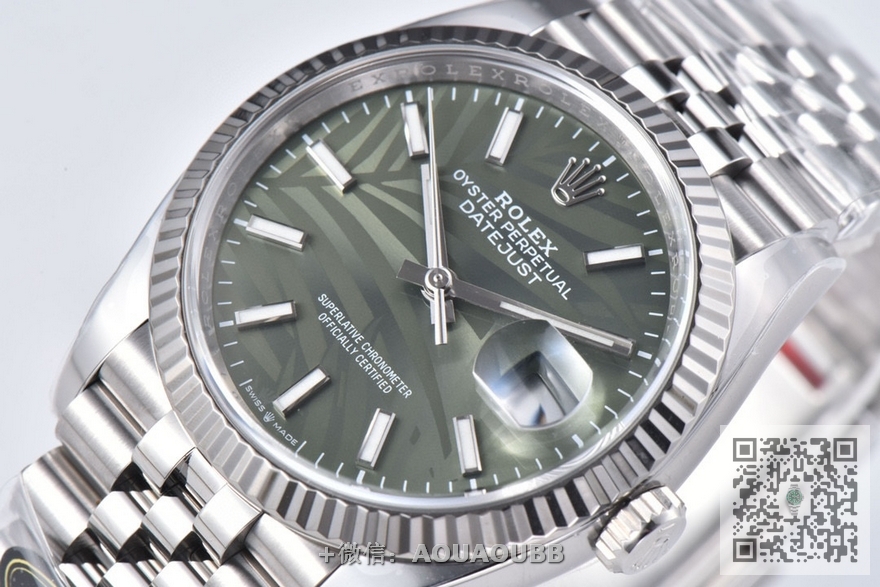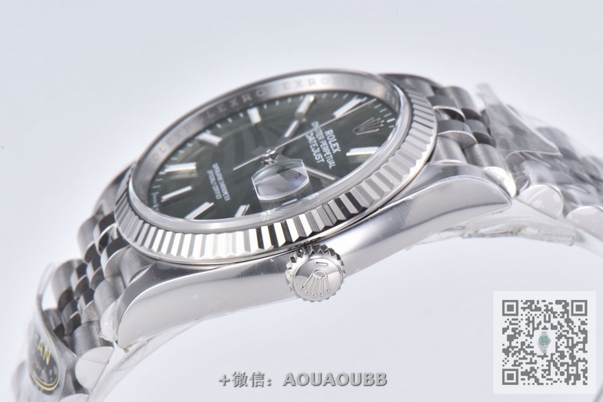 整体绿色表盘,太阳纹放射纹+高速激光工艺制作表盘棕榈图案,通过明暗变化让棕榈叶惟妙惟肖。随着光线变化,绿色底纹也会随之改变。可以不夸张的说,颜值来说绝对超越其他配色,因为这个棕榈叶市场价10w,而热门款的蓝色/绿色才七万而已。通过价格都能感受到人们对于棕榈叶的热爱程度。