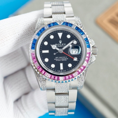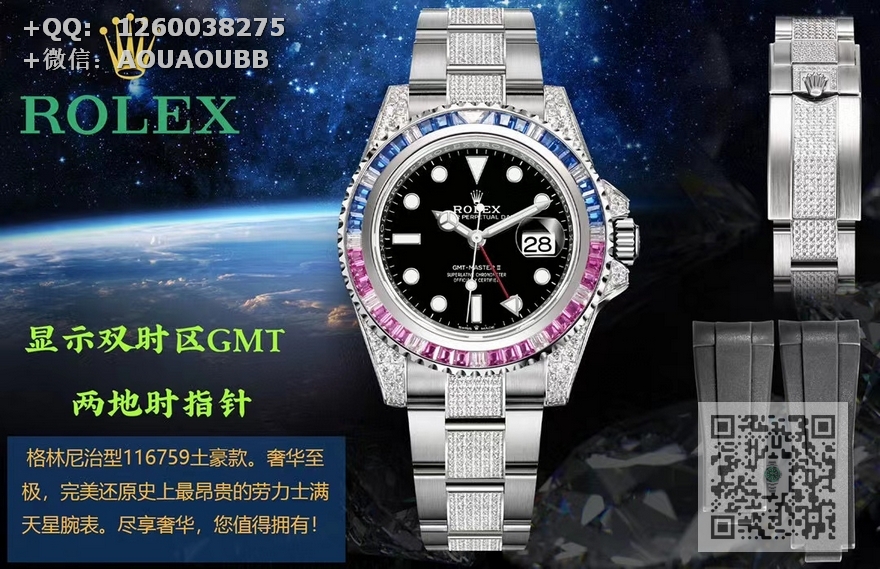 【产品介绍】劳力士格林尼治型116759土豪款。奢华至极,完美还原史上最昂贵的劳力士满天星腕表。尽享奢华,您值得拥有!蓝宝石镜面,显示双时区GMT 两地时指针,日期显示,夜光明亮如炬,上手闪耀华丽、众多明星大腕同款。N厂出品 大厂品质!