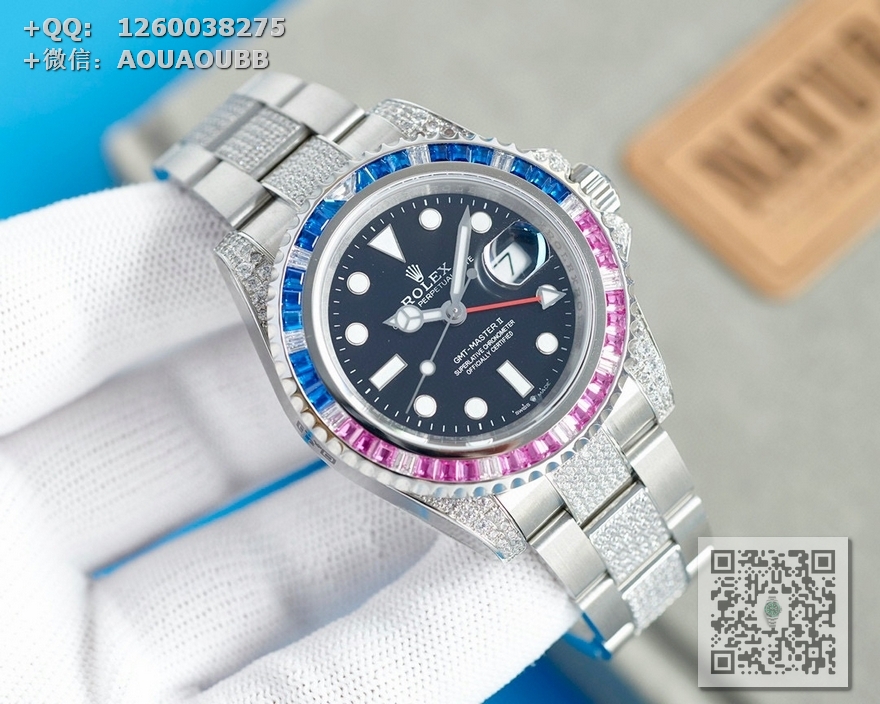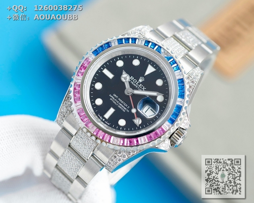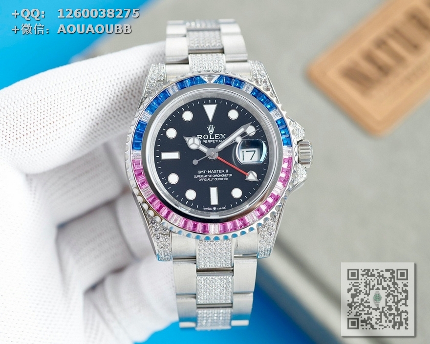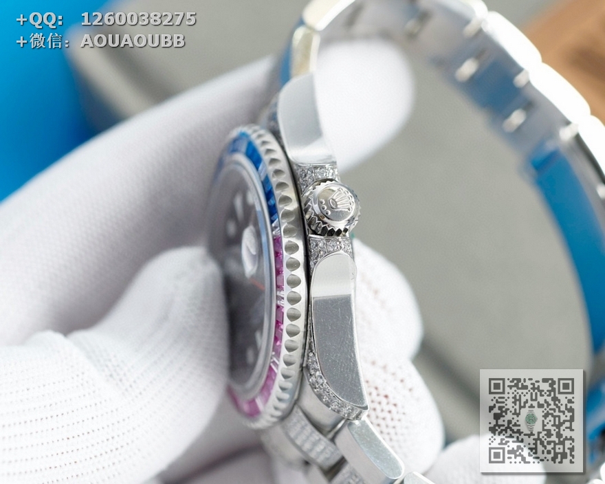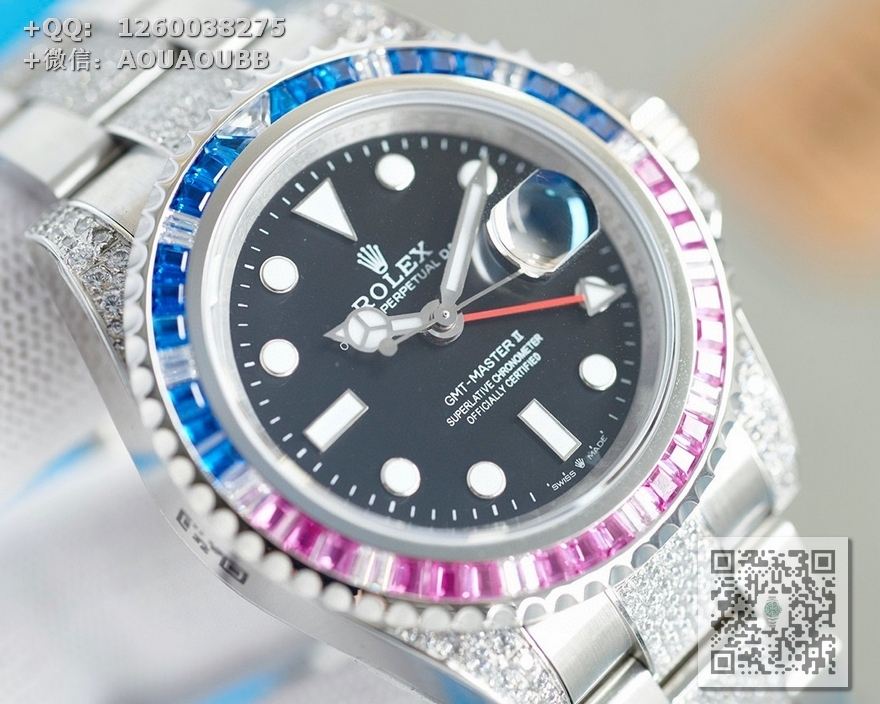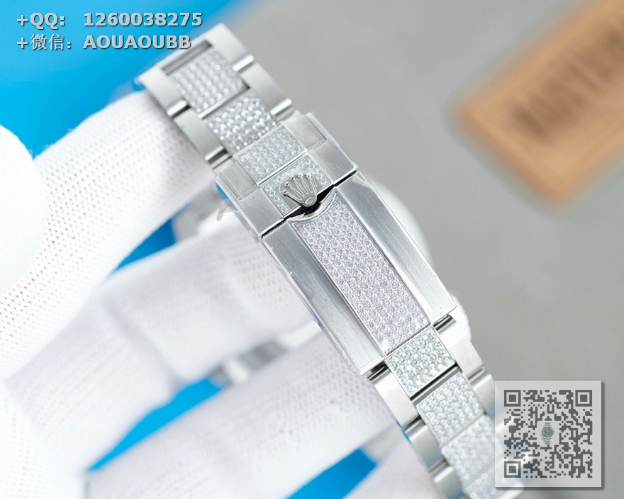 【表壳】腕表尺寸40mm。采用顶级904L蚝式钢。表圈,表壳,表链密镶满施华洛世奇美钻。尽量还原正品奢华至极的无敌质感。