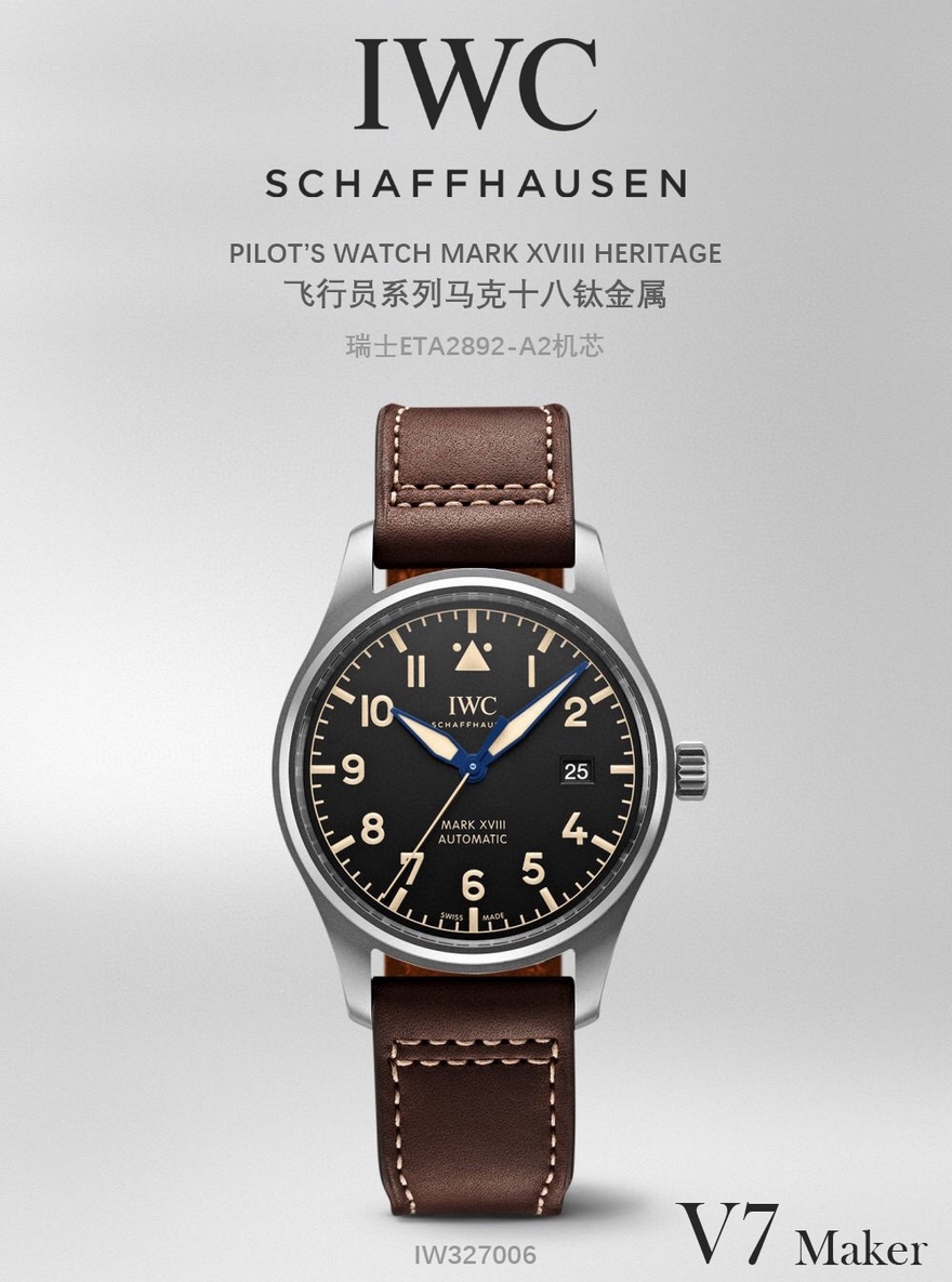 【品牌】万国【产品介绍】V7厂七星推荐之马克系列旗舰版 超级钛马克- IW327006,压轴登场。循例透明化真假对比!1.V7不惜成本单独再购一只原装开模,耗时两年,终可修正市面现有版本的所有不足,独家防指纹技术同步原装,细节上惟妙惟肖,极致完美。2.V7钛马克由于其材质有别于钢款马克,相当于全新开发了一只新品,所有组件都按照原装逐一复制,所有材料同步原装,力求完美。整表拆解结构与原装分毫不差,恰如孖生。3. 字面还原度堪称满分,12位水滴型三角夜光刻度突破性技术完美呈现,表面颜色以及质感均与原装高度契合。日历字体亦完美还原。V7厂细节把控向来严谨,此款字面的颜色,磨砂颗粒感以及刻度效果放大来看亦无可挑剔,而其出色的日历印刷工艺也丝毫不减,与正品保持一致。4.V7厂仍采用原装同源纯进口瑞士全新ETA2892A2机芯,其结构同原装保持一致,性能也与原装同样出色,精准恒久,无返修烦恼!5.把头,把芯的外形以及尺寸都是经过专业定制,同步原装的。6.顶尖表壳制作工艺同步体现到此款钛马克上,其线条,弧度以及打磨,均吻合原装,保持高度一致!7.内外兼修,其钛底盖内外刻字包括边缘打磨均跟足原装。可完美互换。8.V7厂独家专用马克进口牛皮,其材料,做工,佩戴感100%同步原装,质感乱真。全新开模的钛金属表扣,打磨刻字功底扎实,难辨雌雄。9. 纯进口超级夜光显示,其夜光颜色以及效果均可达到原装水准!钛金属马克十八,V7厂行业最高版本,敬请品鉴。【款式】男款【尺寸】直径40mm【表带】牛皮表带【镜面】蓝宝石镜面【机芯】瑞士ETA2892-A2机芯【防水】50米【配件】原装盒,说明书,质保卡,吊牌,香港机打发票【品质检测】保证所有手表实物拍摄,所见即所得 , 手表发货前都会有严格检查测试,确保您收到的手表无质量问题