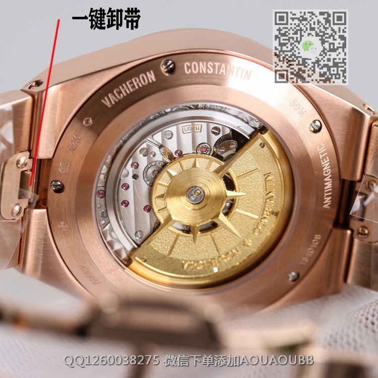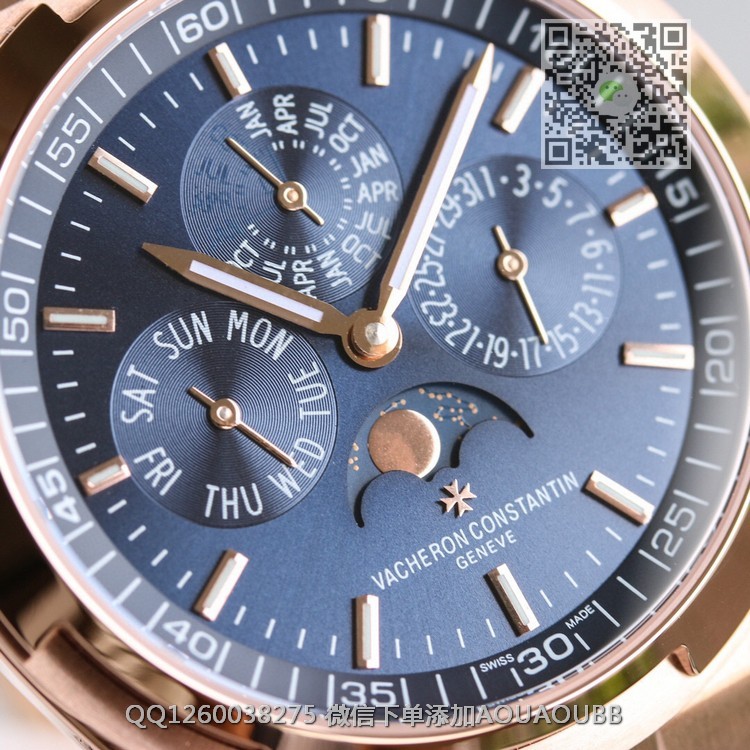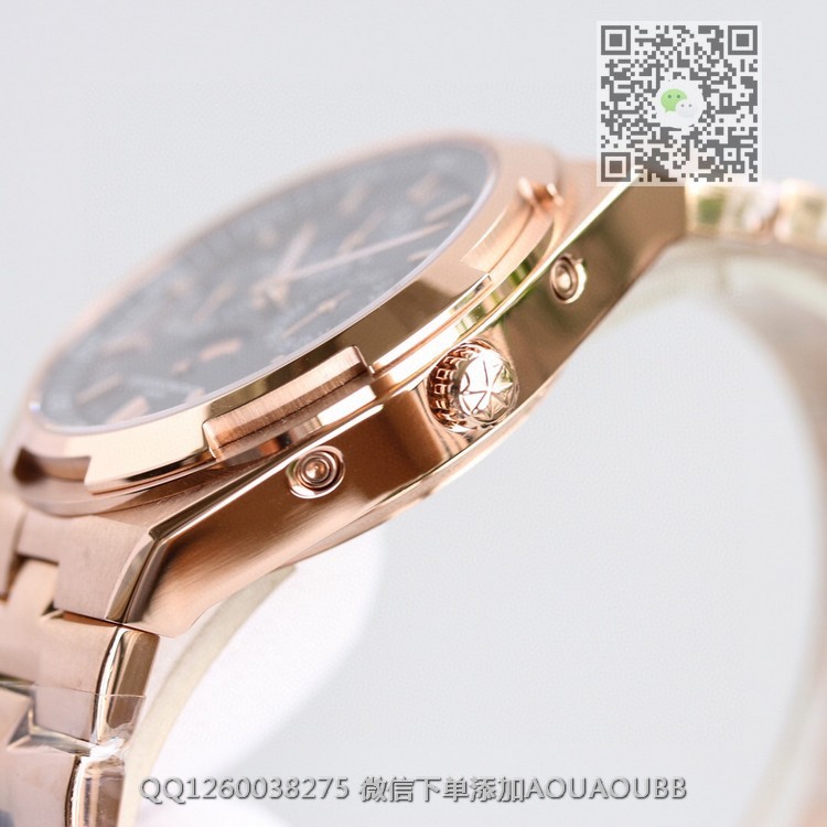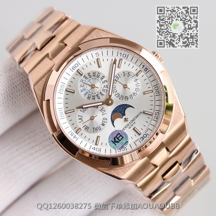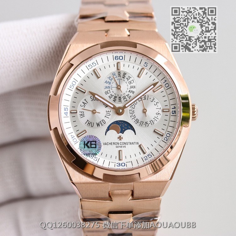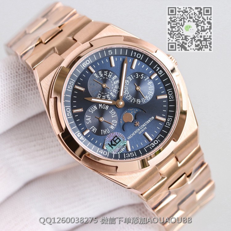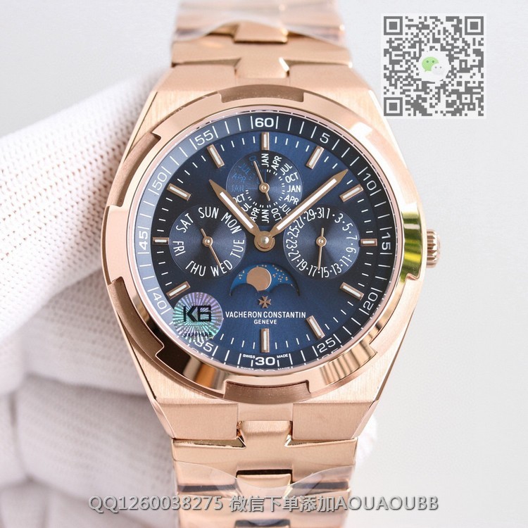 > 江诗丹顿V.Constan > 8F出品 江诗丹顿纵横四海系列4300V/120R-B064男士多功能万年历月相机械腕表 搭载正品一致cal.1120QP机芯 带有日历,星期,月份,月相,等功能 所有功能均可正常使用 表盘直径41.5毫米 【品牌】江诗丹顿【产品介绍】8F顶级大厂出品,纵横四海系列4300V/120G-B102万年历多功能腕表,搭载与正品一致Cal.1120QP机芯,配置Overseas纵横四海特色摆陀,带有日历,星期,月份,月相,等功能,所有功能均可正常使用。表盘直径41.5毫米,前后蓝宝石镜面,旭日纹缎拉丝表盘,带有分钟刻度内影圈,超强夜光。同正品一样,拨动一下表带和表耳之间的小拉杆就可以轻松换表带,真正的1:1复刻。316L精钢表壳,旋入式表冠,圆形带有微椭圆形的表型是纵横四海最具特色的一个代表。大工厂推荐:江诗VC丹顿纵横四海,英雄本色,永恒经典,你值得拥有!【款式】男款【尺寸】41.5mm【表带】18K玫瑰金精钢表带【镜面】蓝宝石镜面【机芯】定制型cal.1120QP全自动机芯复刻正品一样机型【防水】50米【配件】原装盒,说明书,质保卡,吊牌,香港机打发票【品质检测】保证所有手表实物拍摄,所见即所得 , 手表发货前都会有严格检查测试,确保您收到的手表无质量问题