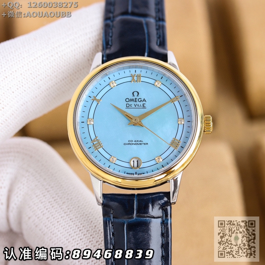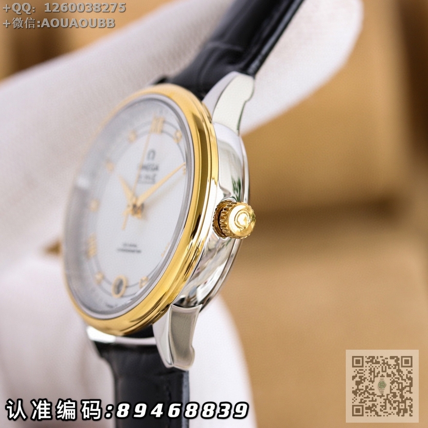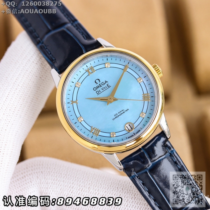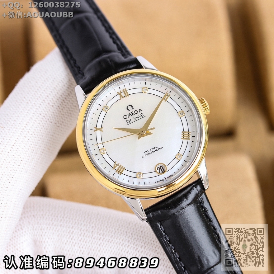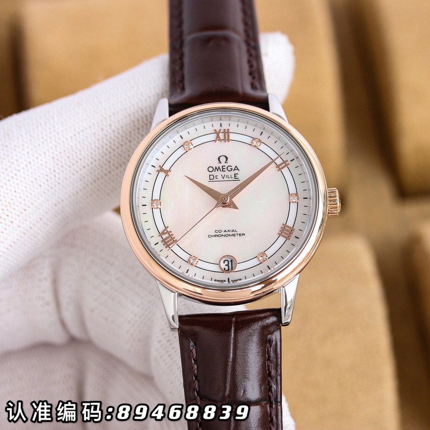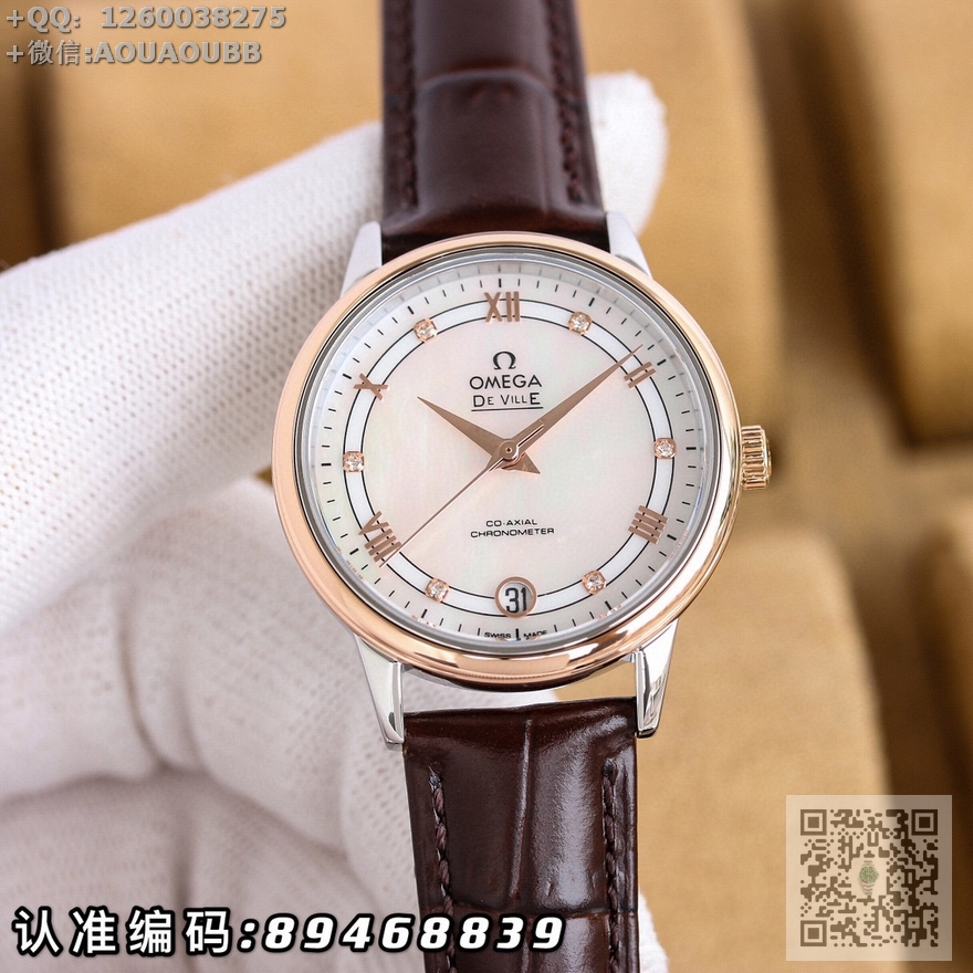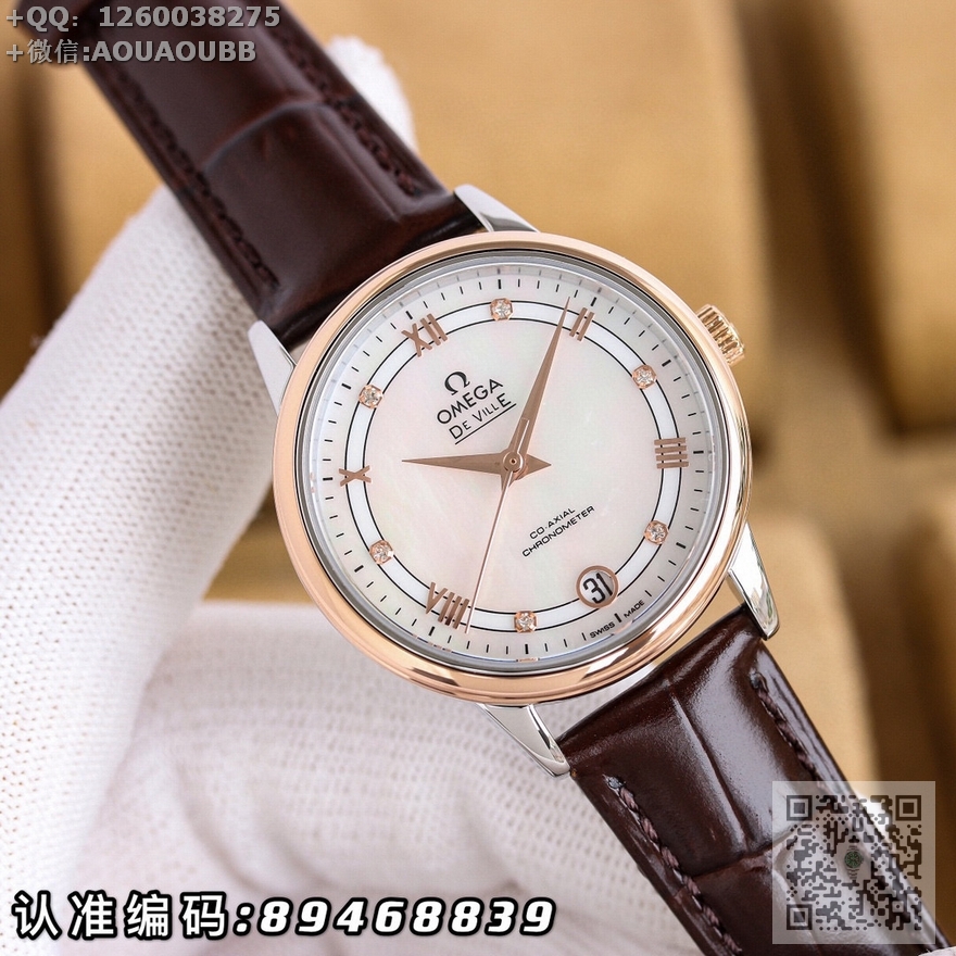 【品牌】欧米茄【产品介绍】欧米茄-碟飞系列-女士腕表!正品开模,市场最高版本字面采用天然珍珠贝壳制作而成,晶莹剔透(设计极具想象空间)玻璃升级为高清拱型双卜蓝宝石玻璃(显示更清晰,防刮花)钢带背面亦同步原装带有激光商品批号!历时9个月多次纠正升级,打造1:1壳型,力求完美!尺寸32.7mm!款式采用原装西铁城8215机芯,每小时振频28800次,零返修质量款式搭配意大利牛皮让手腕更贴合舒适表带带身/表扣上面刻有“OMEGA”经典标志,大方富有档次。实物拍摄请认准细节!【款式】女款【尺寸】直径32.7mm【表带】意大利牛皮表带【镜面】蓝宝石镜面【机芯】原装进口8215机芯【防水】50米【配件】原装盒,说明书,质保卡,吊牌,香港机打发票【品质检测】保证所有手表实物拍摄,所见即所得 , 手表发货前都会有严格检查测试,确保您收到的手表无质量问题