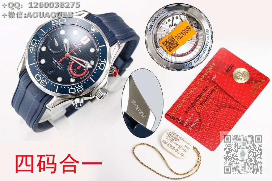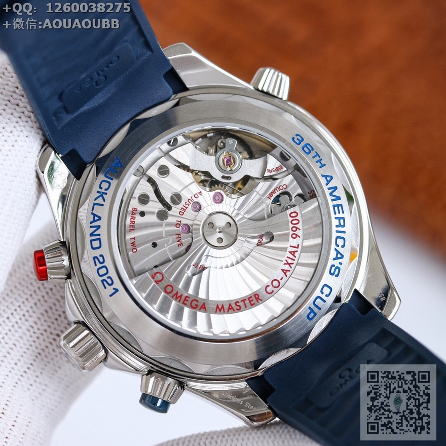 表壳拉身砂细腻洁白光亮斜边抛弧光度倒角与正一品致、904精表钢壳44毫米 ,天进然口橡胶表带。表盘最引人注意的视觉元素是中央计时秒针——尾部装饰美洲杯大赛的「银水罐」奖杯。3点是计时副表盘,「赛前5分钟倒计时」以醒目的白色突出,菱形计时分针的灵感来自帆船的船壳,小时读数则显示在下方扇形窗口里。表盘6点为日历窗,9点是小秒针。搭载 OMEGA 9900 自动上链机芯,摆频28800vph,配备导柱轮结构和同轴擒纵,提供60小时动力储备。精钢表底边缘刻有蓝色「36th America’s Cup」及「Auckland 2021」纪念铭文。