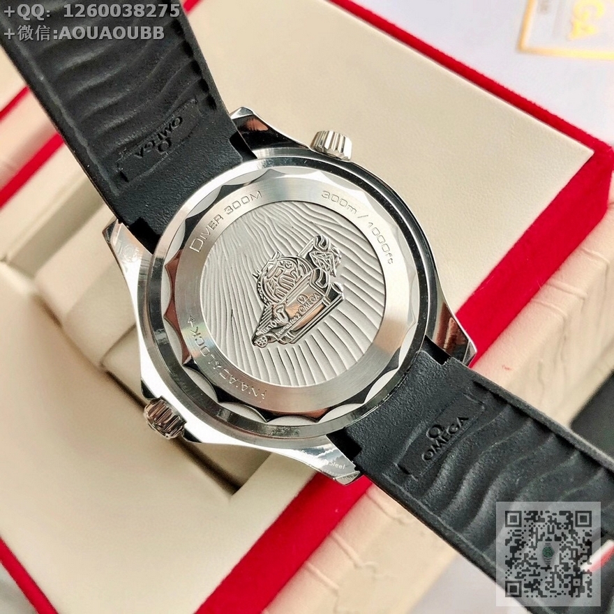 黑色表盘装饰 Seamaster 经典波纹图案,镂空时分针和时标以白色荧光涂料强调,中央秒针为醒目的红色。整枚表最独特的元素隐藏在表底——Nekton 基金会潜水艇「Seamaster II」浮雕,艇身上还可以看到 OMEGA 标志。