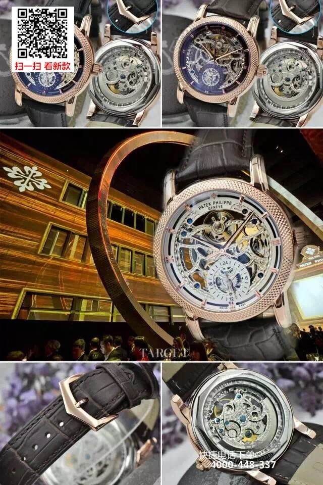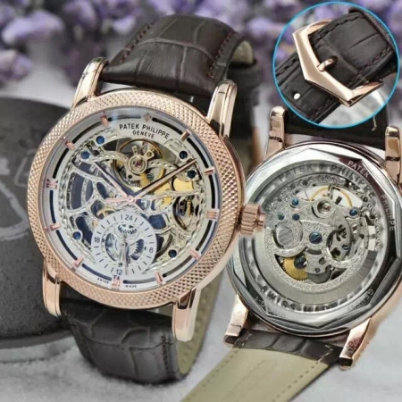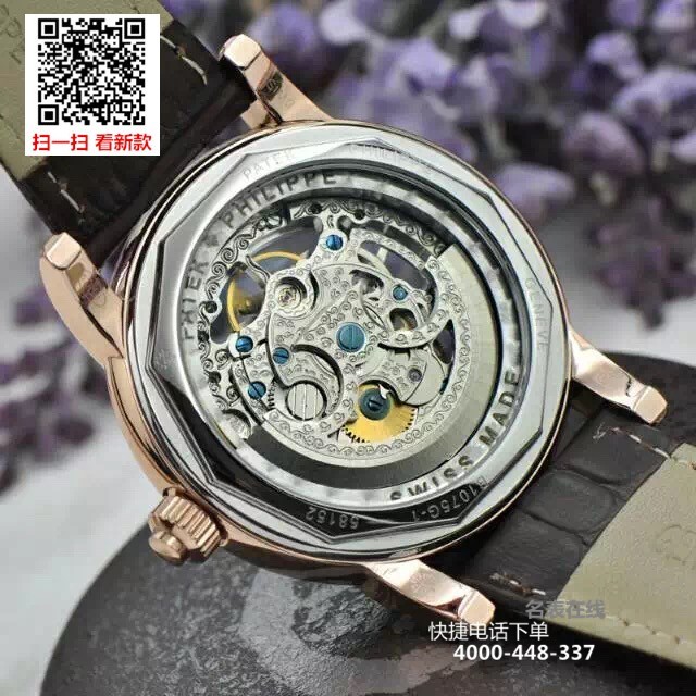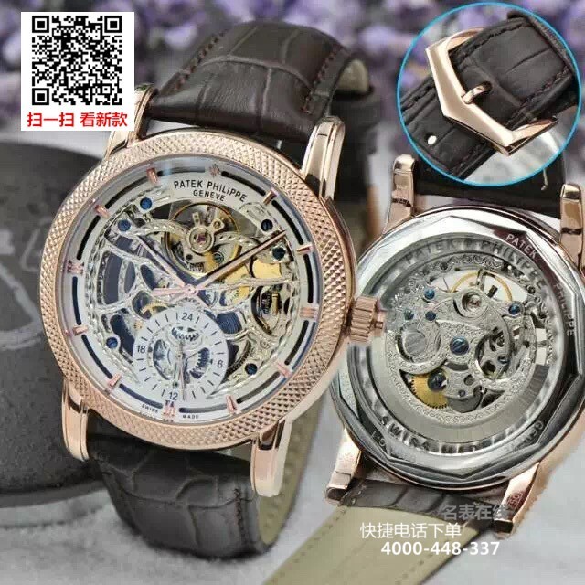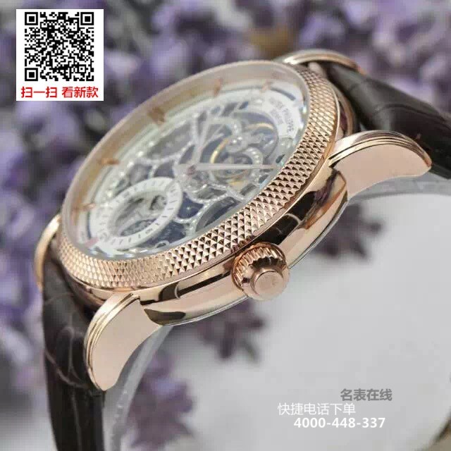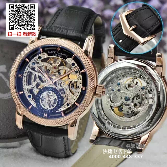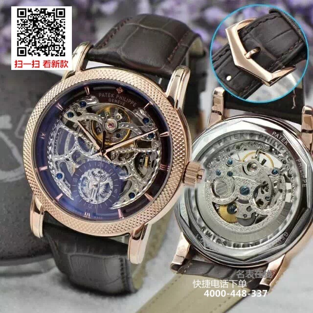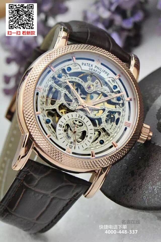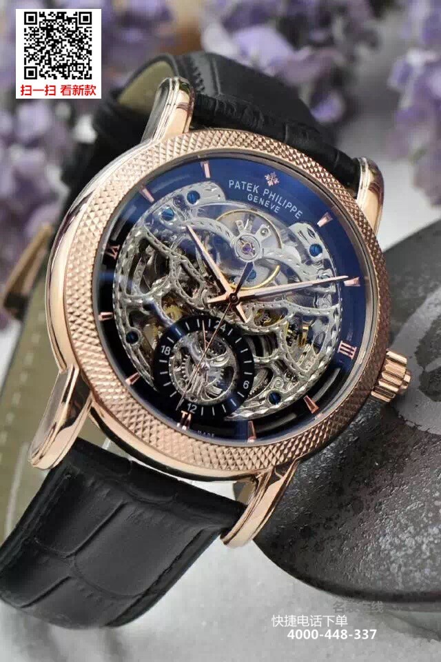{品牌}:百达翡丽{款式}:男款{尺寸}:表壳直径约43mm ,厚度约13mm{表带}:真皮表带{镜面}:蓝宝石抗划镜面{机芯}:瑞士ETA全自动机械机芯{防水}:50米{配件}:原装盒,说明书,质保卡,吊牌,香港机打发票