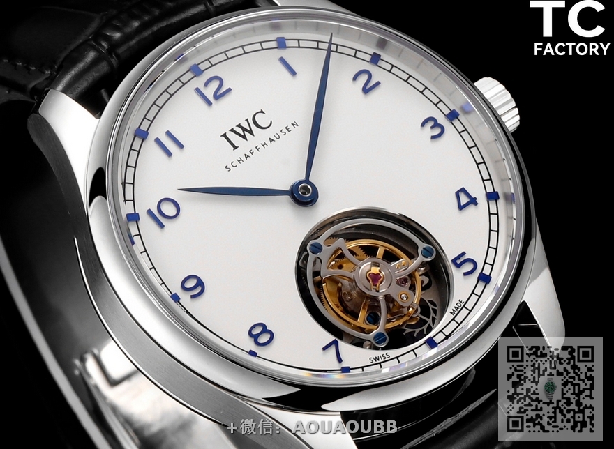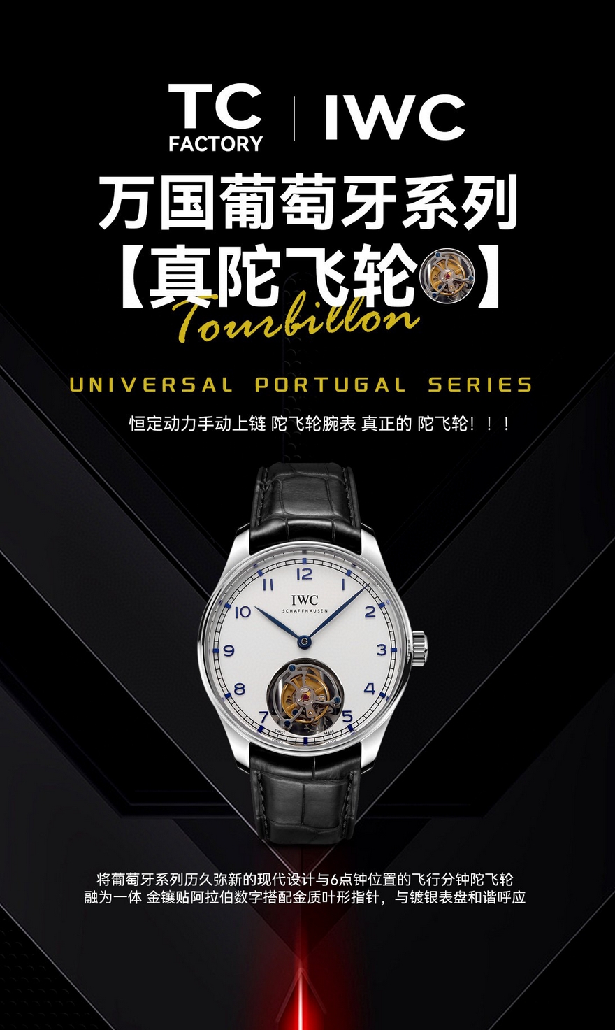 【品牌】万国【产品介绍】TC Factory 洲际13周年庆 万国 葡萄牙系列 真陀飞轮腕表!!IWCPORTUGIESER HAND-WOUND TOURBILLON恒定动力手动上链 陀飞轮腕表 真正的 陀飞轮!!!将葡萄牙系列历久弥新的现代设计与6点钟位置的飞行分钟陀飞轮融为一体 金镶贴阿拉伯数字搭配金质叶形指针,与镀银表盘和谐呼应独家开发81905机芯,动力储存长达72小时,还原正品三大功能表壳:根据原装一比一描绘设计。还原正品三件套:不管是从表壳正面与反面壳型的侧面与弧形拉丝工艺打磨均完美同步原装。直径为42mm.厚度11毫米。表镜:蓝宝石拱形表镜。表针:工厂不惜成本,从设计到开模.式样.检验多次才达到与原装一致立体表针。表带:采用意大利牛皮鳄鱼纹表带,手工缝线,细节到位,搭配IWC原装正品折叠表扣,扣面字体清晰,还原正品细品【款式】男款【尺寸】直径42mm厚度11mm【表带】意大利牛皮表带【镜面】蓝宝石镜面【机芯】81905陀飞轮机芯【防水】50米防水【配件】原装盒,说明书,质保卡,吊牌,香港机打发票【品质检测】保证所有手表实物拍摄,所见即所得 , 手表发货前都会有严格检查测试,确保您收到的手表无质量问题