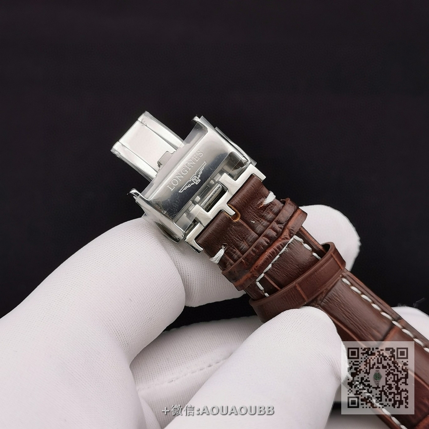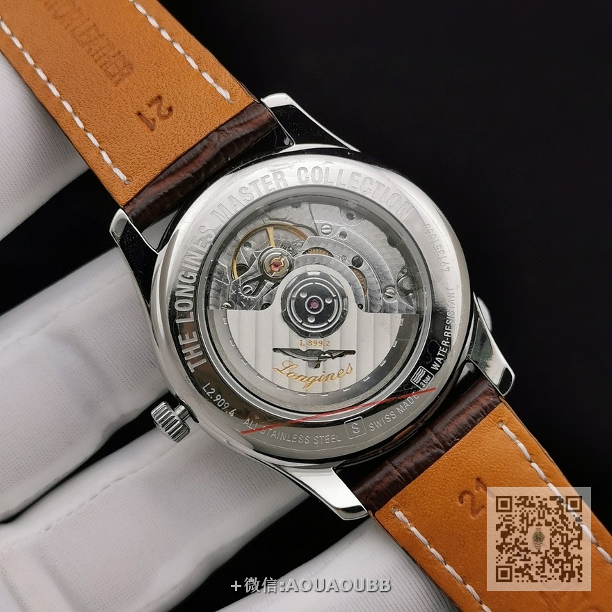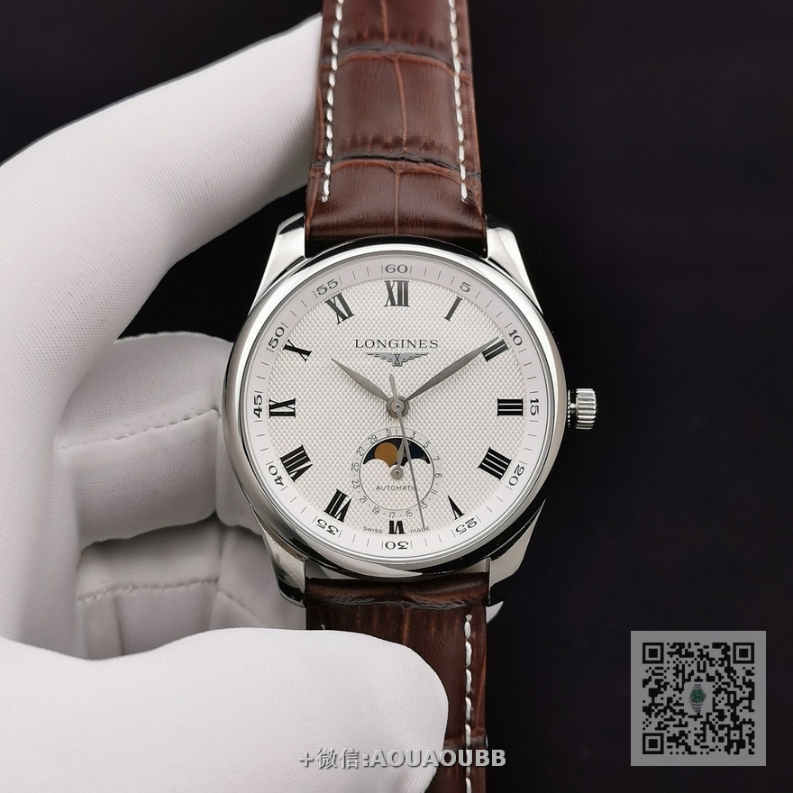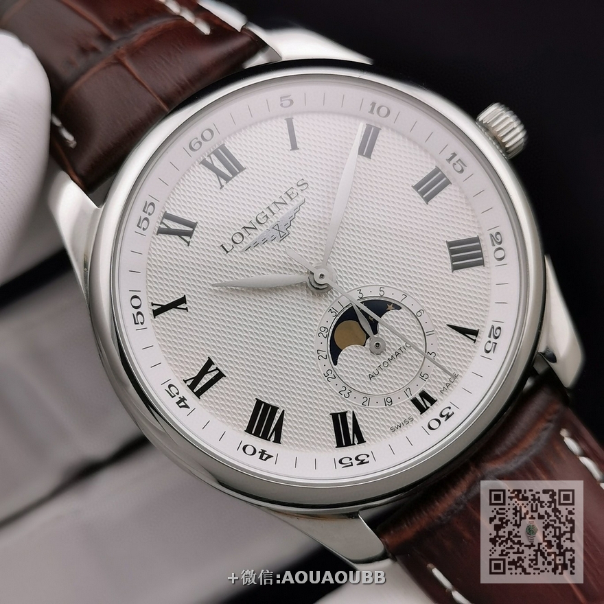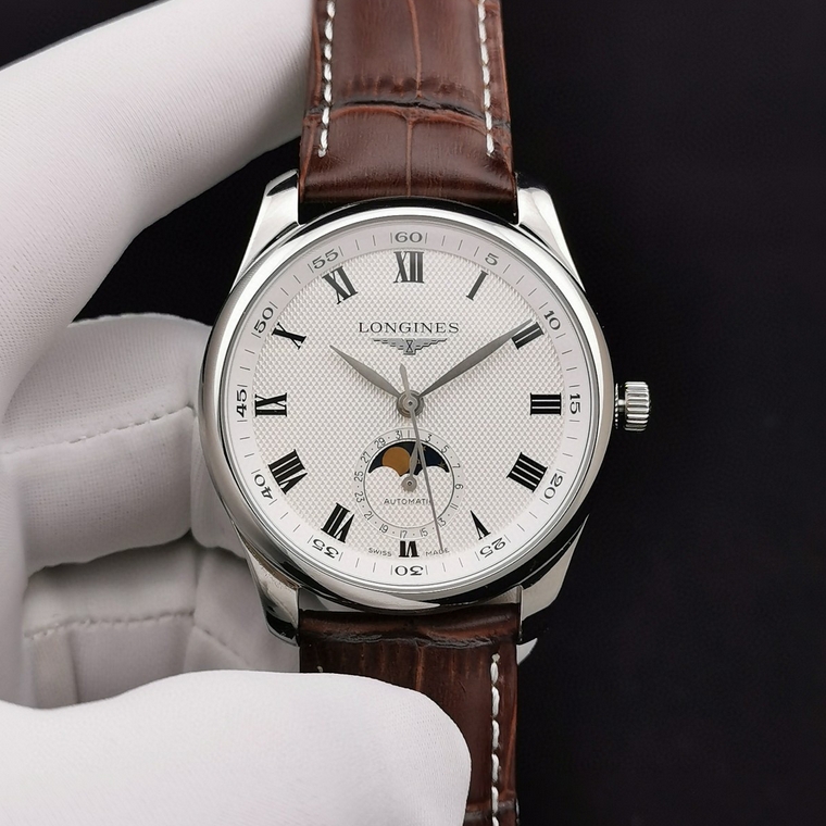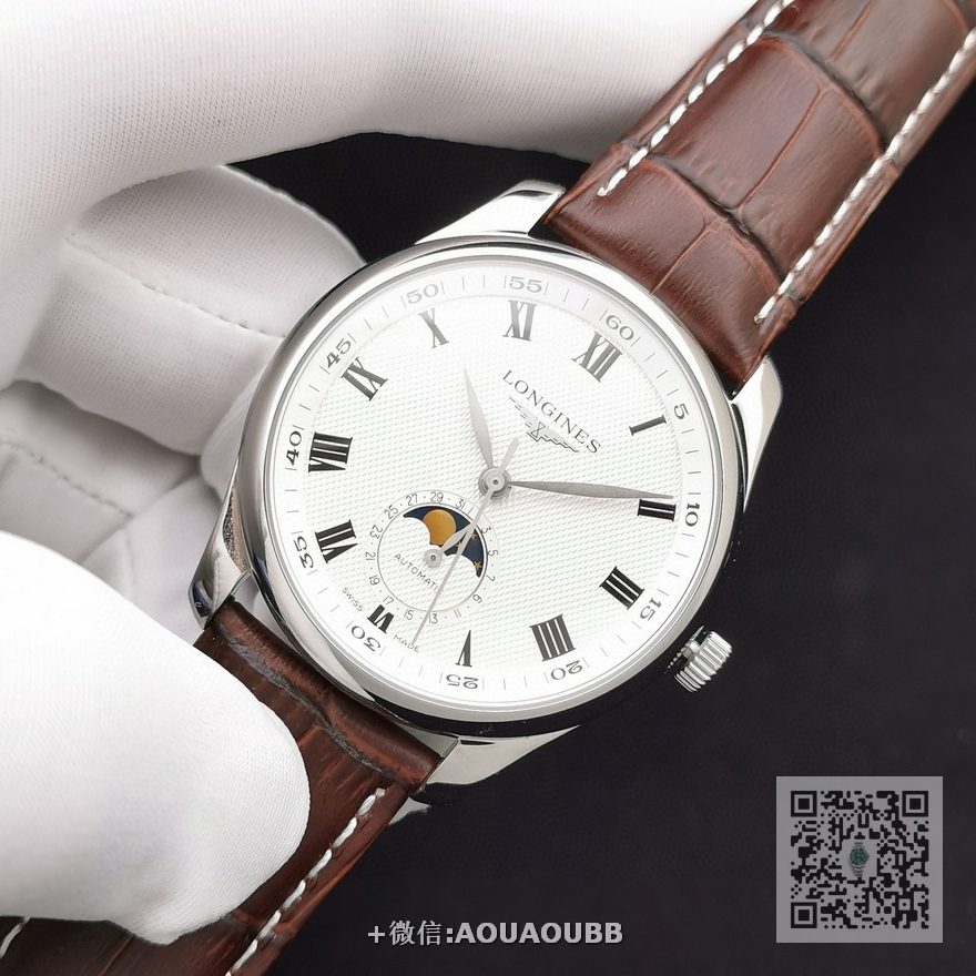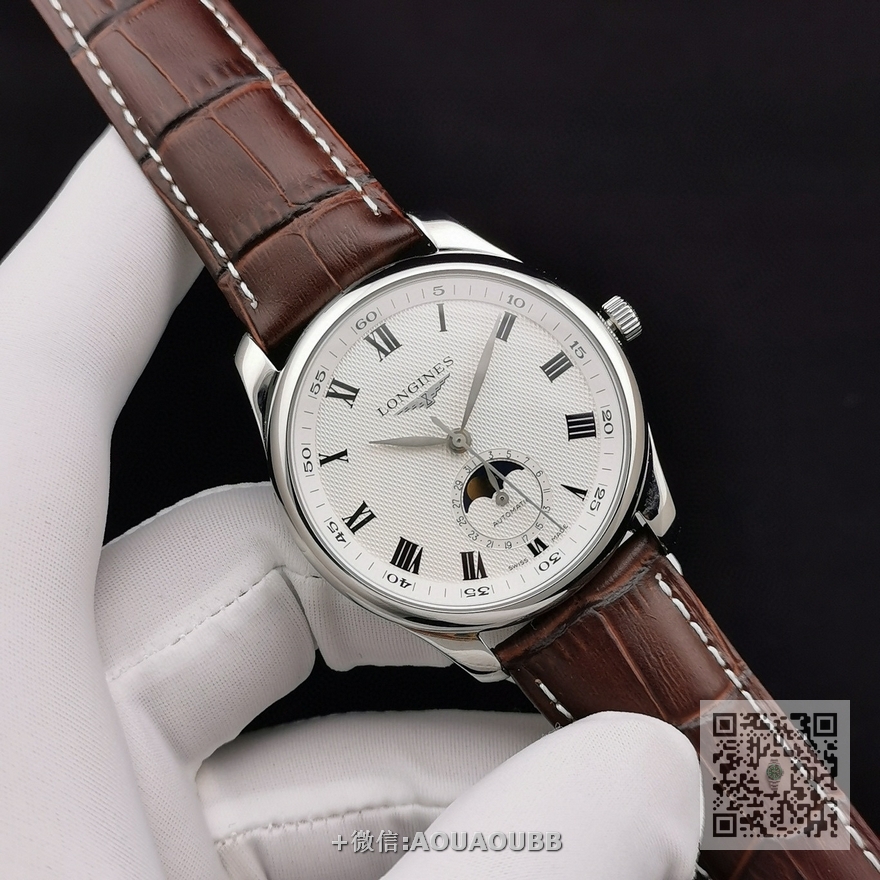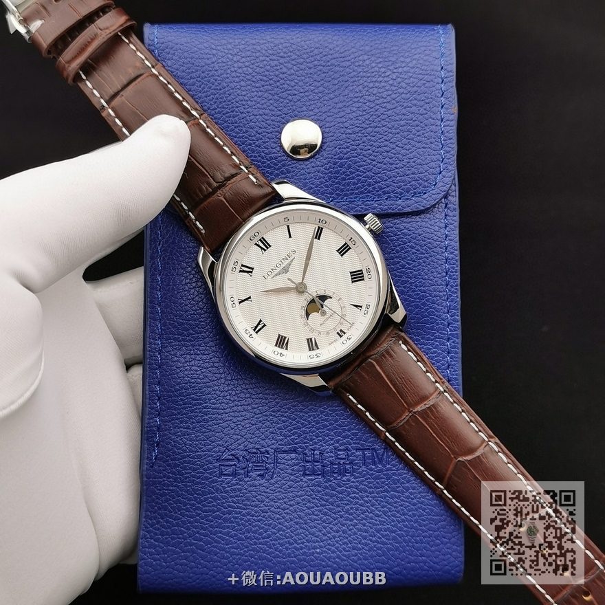 【品牌】浪琴【产品介绍】台湾厂 Factory力作 浪.琴名匠系列月相腕表,崭新表盘及全新自动机械机芯令经典名匠焕发优雅新意,为你带来全新气象:1:直径40毫米的表壳,采用316L精钢材质,银色与黑色麦粒纹饰及经典蓝色太阳纹!2:指针和字面搭配蓝钢指针与阿拉伯数字相互辉映,彰显优雅高贵,6点钟位置设月相显示窗口,采用镀金工艺金光闪闪的月相盘,日历内圈采用德国工艺精细打磨白金线条,蓝色小指针显示日历盘,撷取月亮的圆缺变幻,让你随时欣赏腕表月色,让经典腕表更美轮美奂!表冠周身罗纹设计更方便调校时间,上面镌刻有浪琴经典logo标识,精细的抛光打磨,背透设计,让线条圆润更加光亮,独具匠心!3:机芯搭配L899.2机芯原陀饰有拉丝日内瓦条纹和镂空设计,轴承圆心的红宝石,让摆陀更加美观大方!匠心之作 值得拥有!【款式】男款【尺寸】直径40mm【表带】意大利牛皮表带【镜面】蓝宝石镜面【机芯】L899.2机芯【防水】50米【配件】原装盒,说明书,质保卡,吊牌,香港机打发票【品质检测】保证所有手表实物拍摄,所见即所得 , 手表发货前都会有严格检查测试,确保您收到的手表无质量问题
