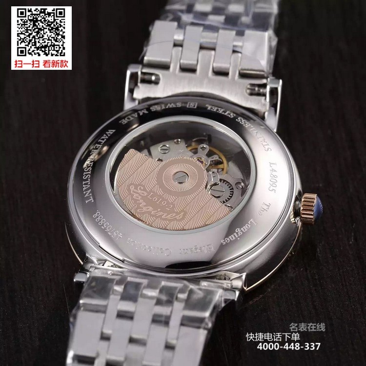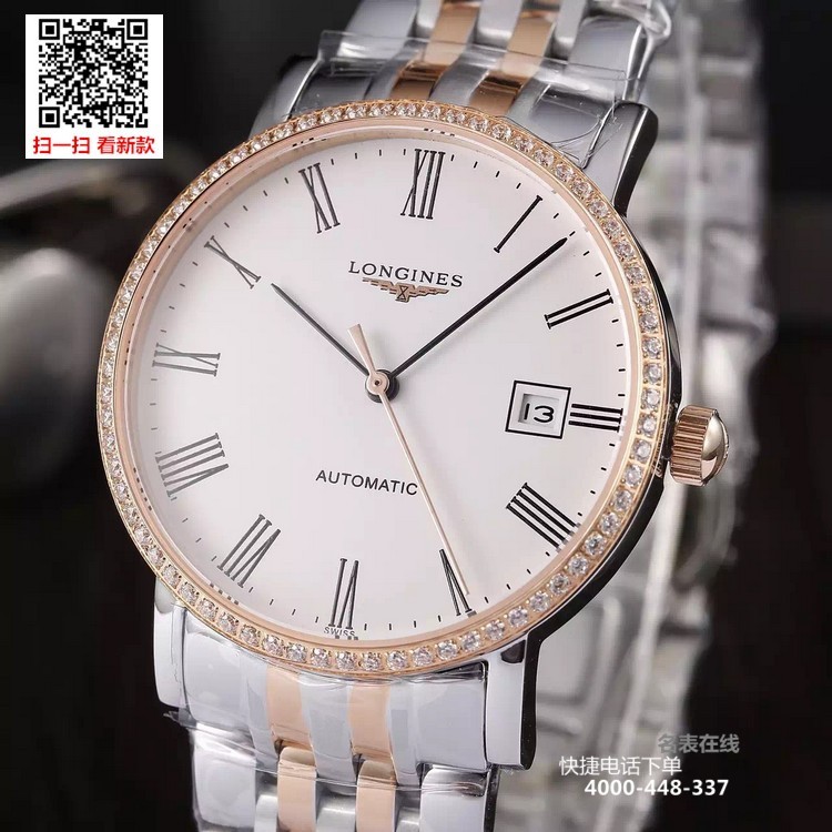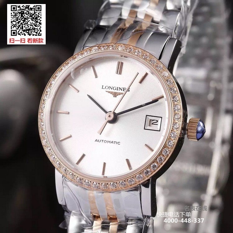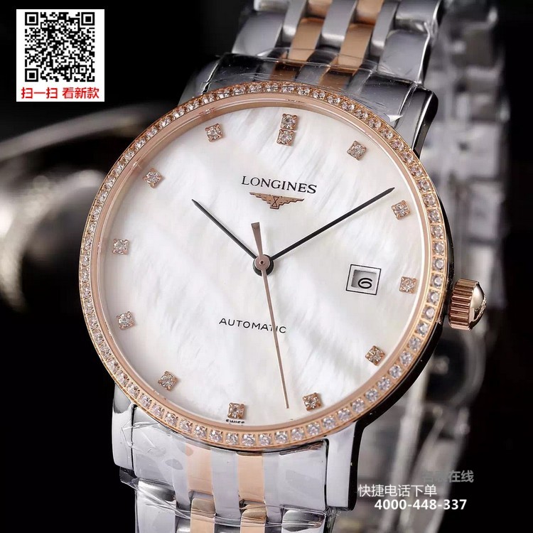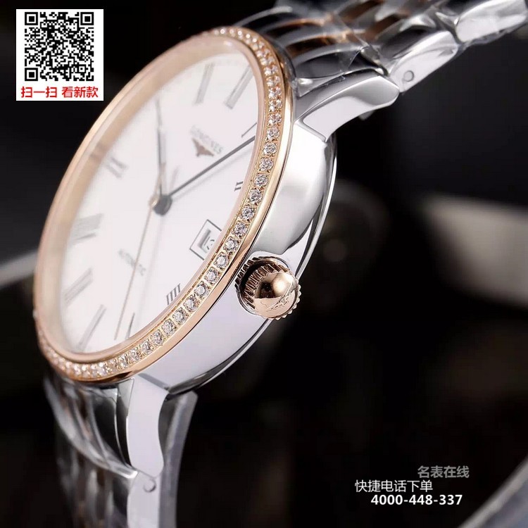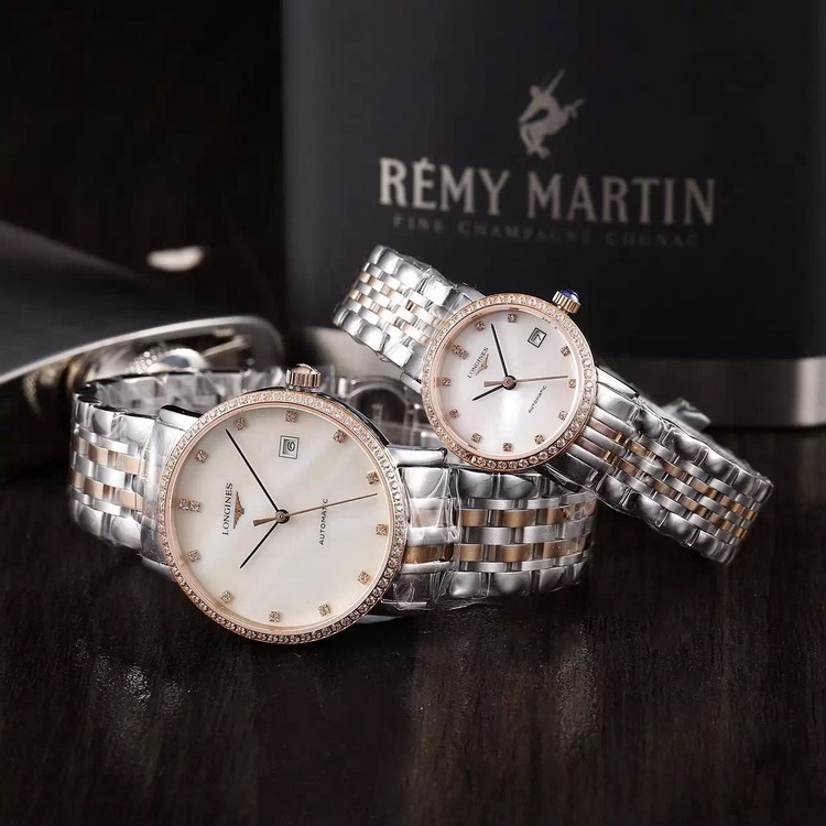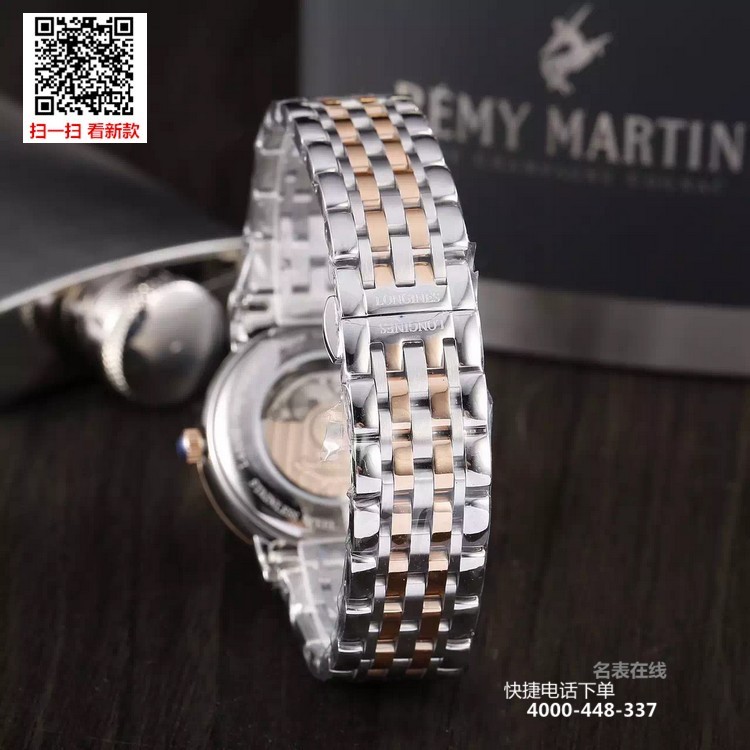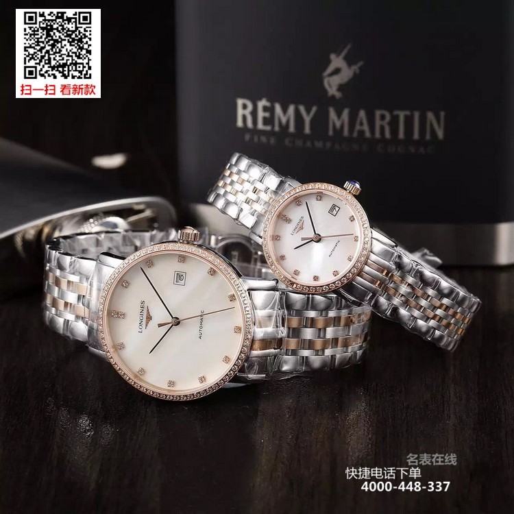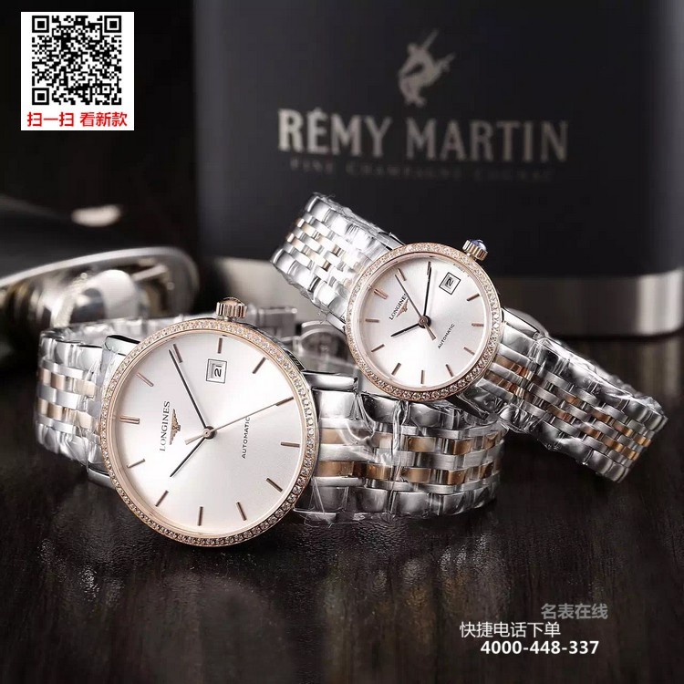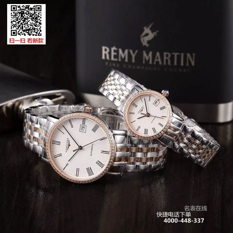 {品牌}:浪琴{款式}:男款/女款{尺寸}:男直径约40mm;女款直径约30mm{表带}:18K间玫瑰金精钢表带{镜面}:蓝宝石抗划镜面{机芯}:瑞士ETA全自动机械机芯{防水}:50米{配件}:原装盒,说明书,质保卡,吊牌,香港机打发票