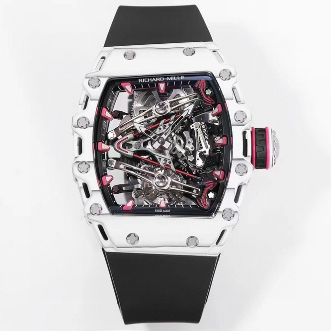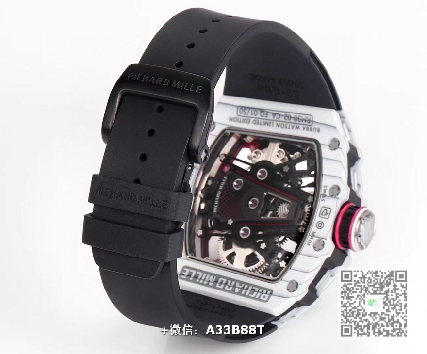 【品牌】理查德米勒【产品介绍】新表RICHARD MILLE 理查米尔 推出 RM 38-02 Tourbillon Bubba Watson 粉色主题镂空陀飞轮腕表:高尔夫球灵感风格醒目的新作——「RM 38-02 Tourbillon Bubba Watson」陀飞轮腕表与高尔夫职业球手 Bubba Watson 合作设计,独特的粉红色来自这位高尔夫名将钟爱的 PING 一号球杆,风格尤为明快,让人心生愉悦。新作表圈和底盖采用粉色和白色石英碳纤维复合材料加工而成,中层表壳则以碳纤维和粉色石英碳纤维制成,每一个表壳都有独一无二的交错纹理。梯桶形表壳能够更舒适紧密的贴合手腕,表冠顶部巧妙模仿高尔夫球的凹凸造型,是颇为有趣的细节。全开放式表盘让佩戴者清晰欣赏机芯的完整运转,镂空桥板在表盘中勾勒出横向的「V」字形,粉色手绘图案则来自 Bubba Watson 使用的球杆杆头。6点陀飞轮结构能够承受10000g冲击力,职业球手在高速击杆时也能稳定运转。搭载 RM 38-02 手动上链机芯,摆频28800vph,提供52小时动力储备。这枚机芯采用碳纤维制作镂空底板,具备优异的防震性能。桥板依然为坚固的 5级钛金属材质,背面的小孔亦融入粉色元素装饰。【款式】男款【尺寸】43.70 x 50.04mm【表带】橡胶表带/尼龙纤维表带,两种表带类型可供选择,二选一【镜面】蓝宝石镜面【机芯】RM38-02手动陀飞轮机芯【防水】50米防水【配件】原装盒,说明书,质保卡,吊牌,香港机打发票【品质检测】保证所有手表实物拍摄,所见即所得 , 手表发货前都会有严格检查测试,确保您收到的手表无质量问题
