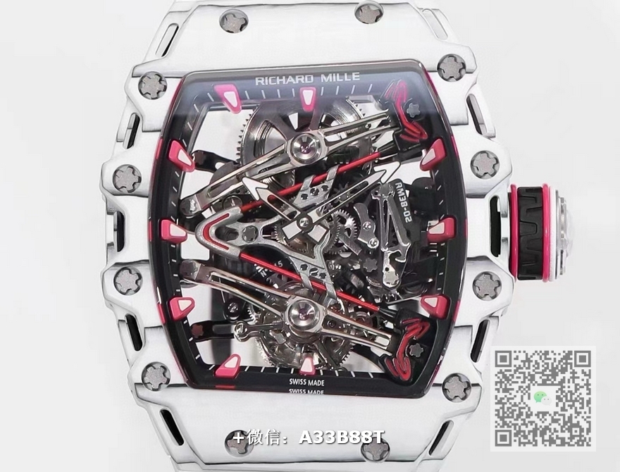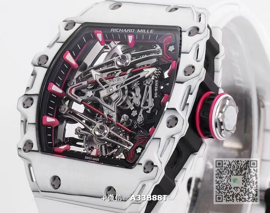 【品牌】理查德米勒【产品介绍】新表RICHARD MILLE 理查米尔 推出 RM 38-02 Tourbillon Bubba Watson 粉色主题镂空陀飞轮腕表:高尔夫球灵感风格醒目的新作——「RM 38-02 Tourbillon Bubba Watson」陀飞轮腕表与高尔夫职业球手 Bubba Watson 合作设计,独特的粉红色来自这位高尔夫名将钟爱的 PING 一号球杆,风格尤为明快,让人心生愉悦。新作表圈和底盖采用粉色和白色石英碳纤维复合材料加工而成,中层表壳则以碳纤维和粉色石英碳纤维制成,每一个表壳都有独一无二的交错纹理。梯桶形表壳能够更舒适紧密的贴合手腕,表冠顶部巧妙模仿高尔夫球的凹凸造型,是颇为有趣的细节。全开放式表盘让佩戴者清晰欣赏机芯的完整运转,镂空桥板在表盘中勾勒出横向的「V」字形,粉色手绘图案则来自 Bubba Watson 使用的球杆杆头。6点陀飞轮结构能够承受10000g冲击力,职业球手在高速击杆时也能稳定运转。搭载 RM 38-02 手动上链机芯,摆频28800vph,提供52小时动力储备。这枚机芯采用碳纤维制作镂空底板,具备优异的防震性能。桥板依然为坚固的 5级钛金属材质,背面的小孔亦融入粉色元素装饰。【款式】男款【尺寸】43.70 x 50.04mm【表带】橡胶表带/尼龙纤维表带,两种表带类型可供选择,二选一【镜面】蓝宝石镜面【机芯】RM38-02手动陀飞轮机芯【防水】50米防水【配件】原装盒,说明书,质保卡,吊牌,香港机打发票【品质检测】保证所有手表实物拍摄,所见即所得 , 手表发货前都会有严格检查测试,确保您收到的手表无质量问题