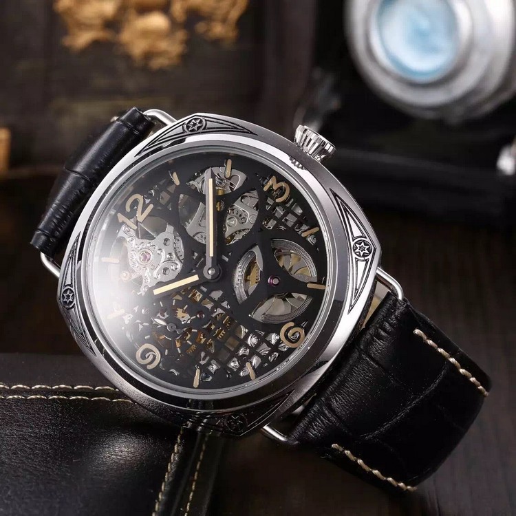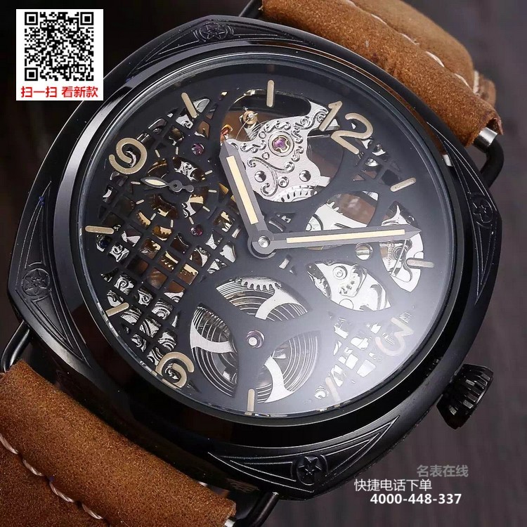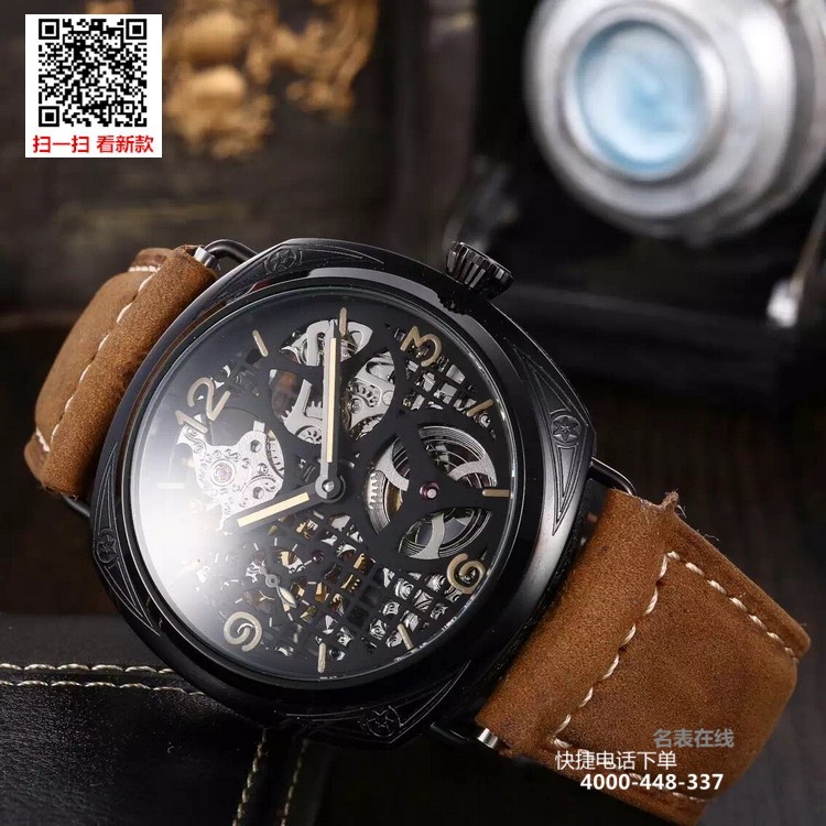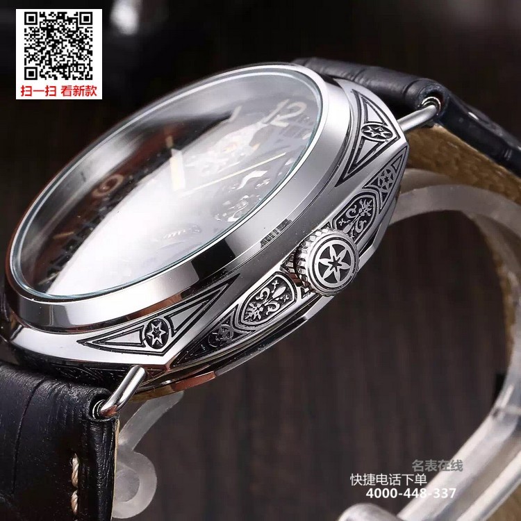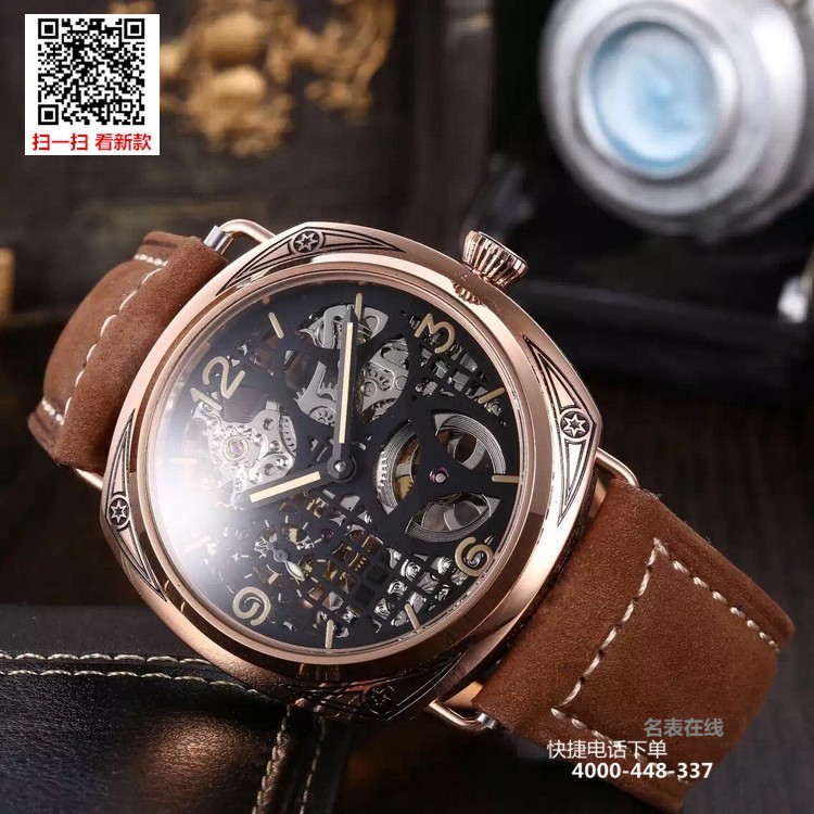 {品牌}:沛纳海{款式}:男款{尺寸}:直径约44mm{表带}:真皮表带{镜面}:蓝宝石抗划镜面{机芯}:瑞士手动机械机芯{防水}:100米{配件}:原装盒,说明书,质保卡,吊牌,香港机打发票