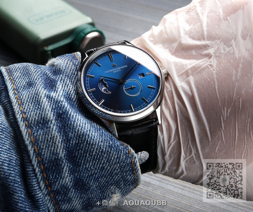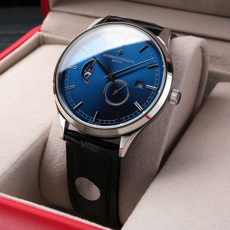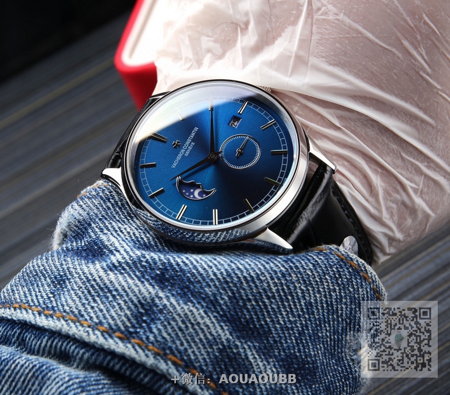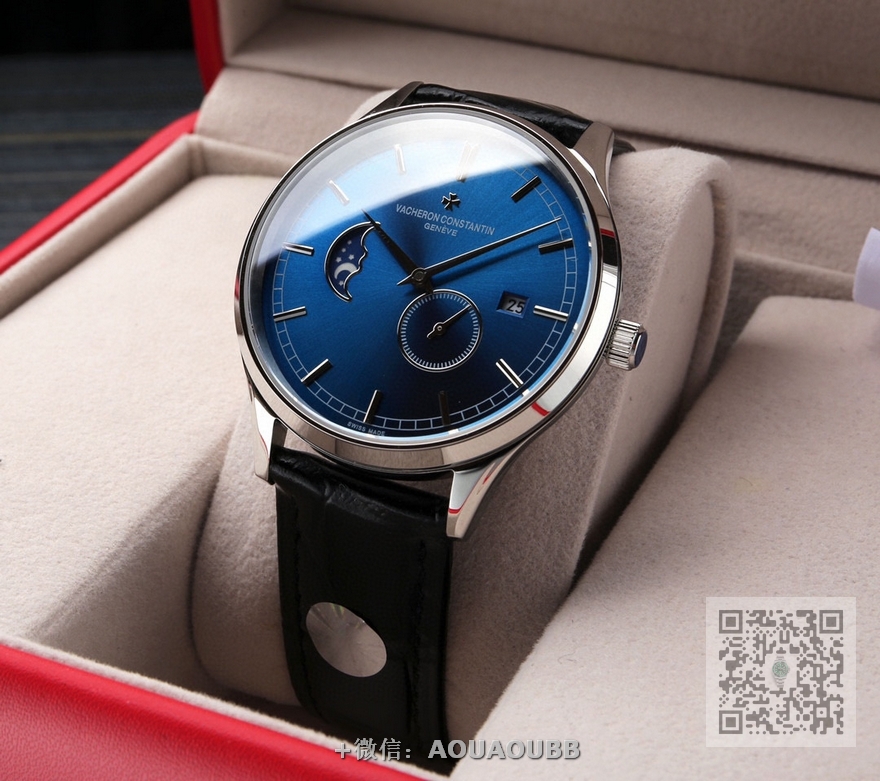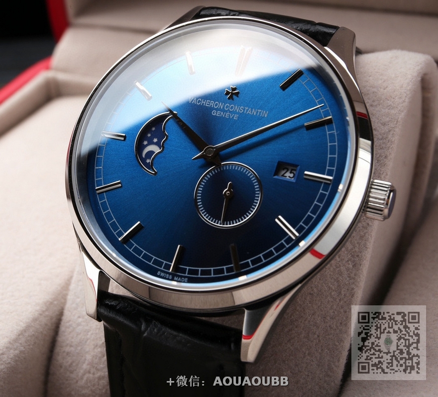 【产品介绍】江诗丹顿,日月星辰系列,搭载原装进口8219机芯(0返修0售后),9位个性24小时/真月相显示,5位小秒。双卜蓝宝石玻璃镜面,意大利牛皮,表径40X11mm。5度防水!