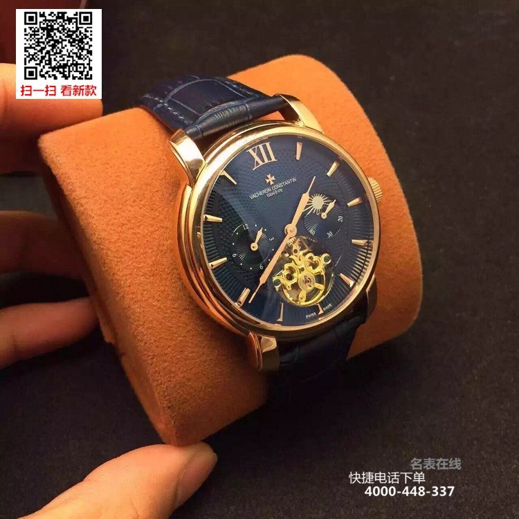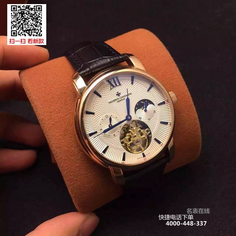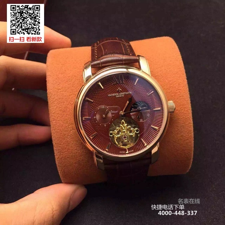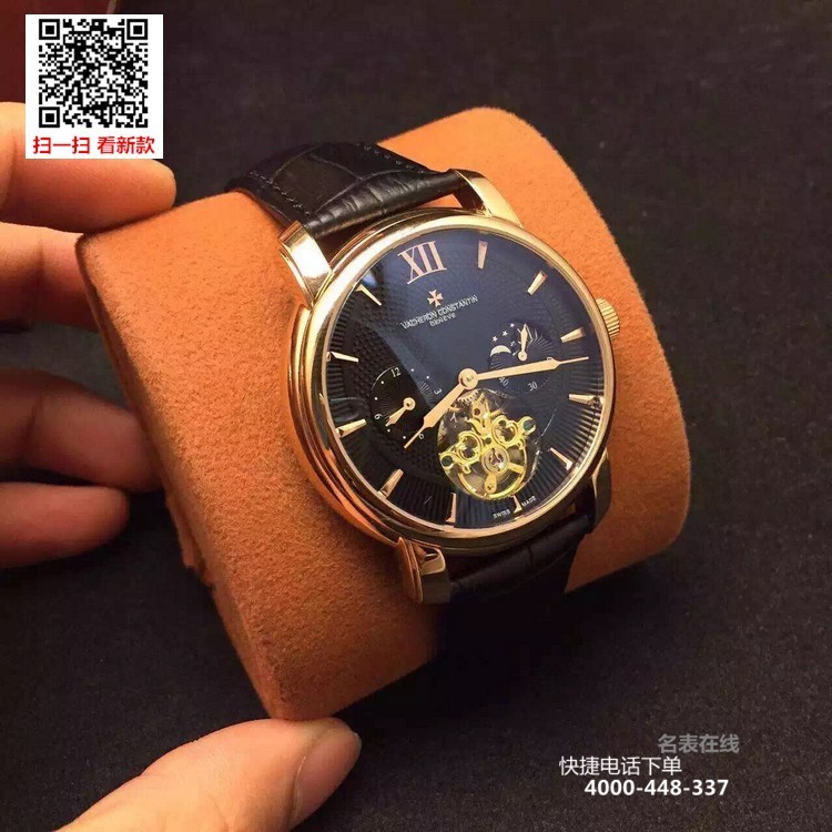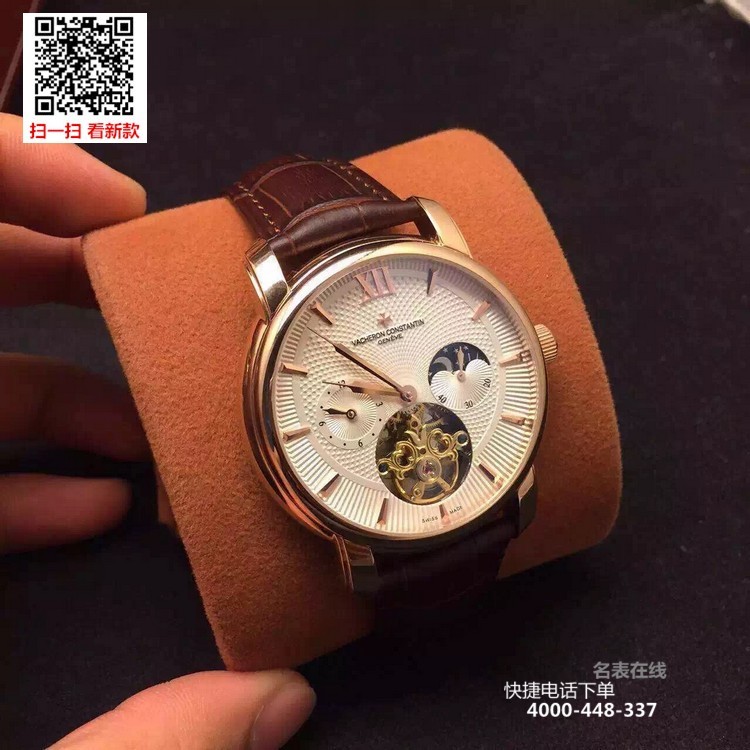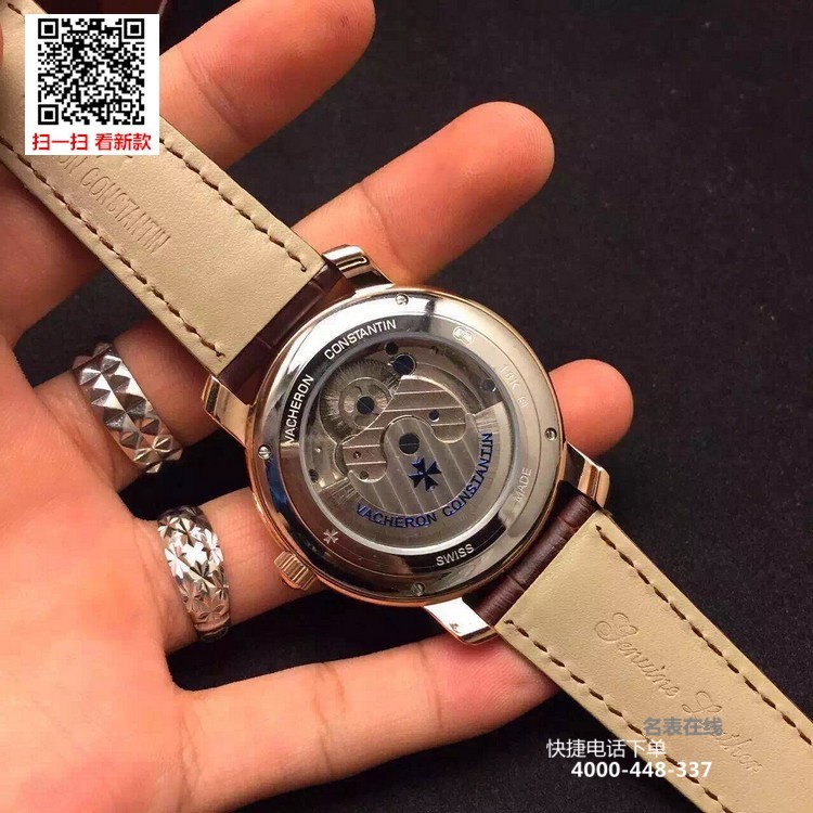 {品牌}:江诗丹顿{款式}:男款{尺寸}:直径约43mm{表带}:真皮表带{镜面}:蓝宝石抗划镜面{机芯}:瑞士ETA全自动机械机芯{防水}:50米{配件}:原装盒,说明书,质保卡,吊牌,香港机打发票